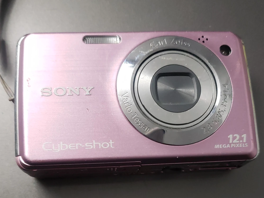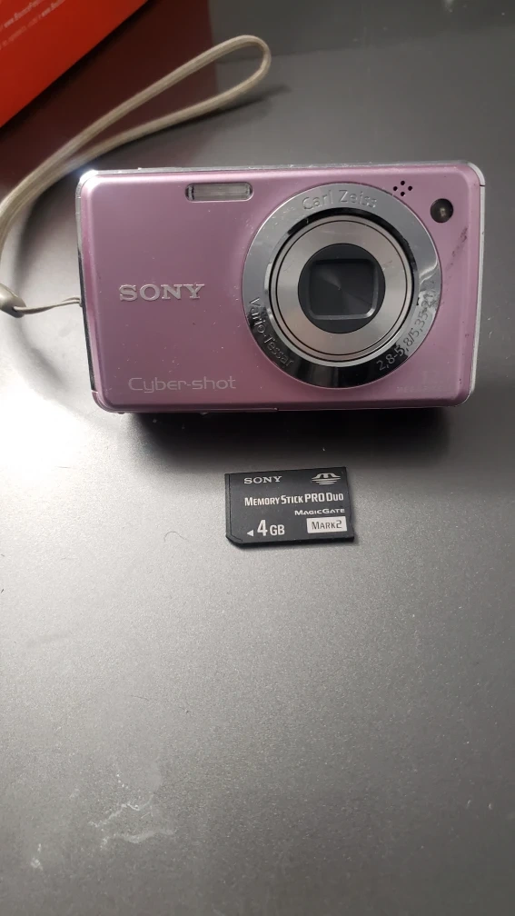 Selling a pink Sony Cyber-shot digital camera! It features a Carl Zeiss Vario-Tessar lens and captures images at 12.1 megapixels. Comes with a 4GB Memory Stick PRO Duo.