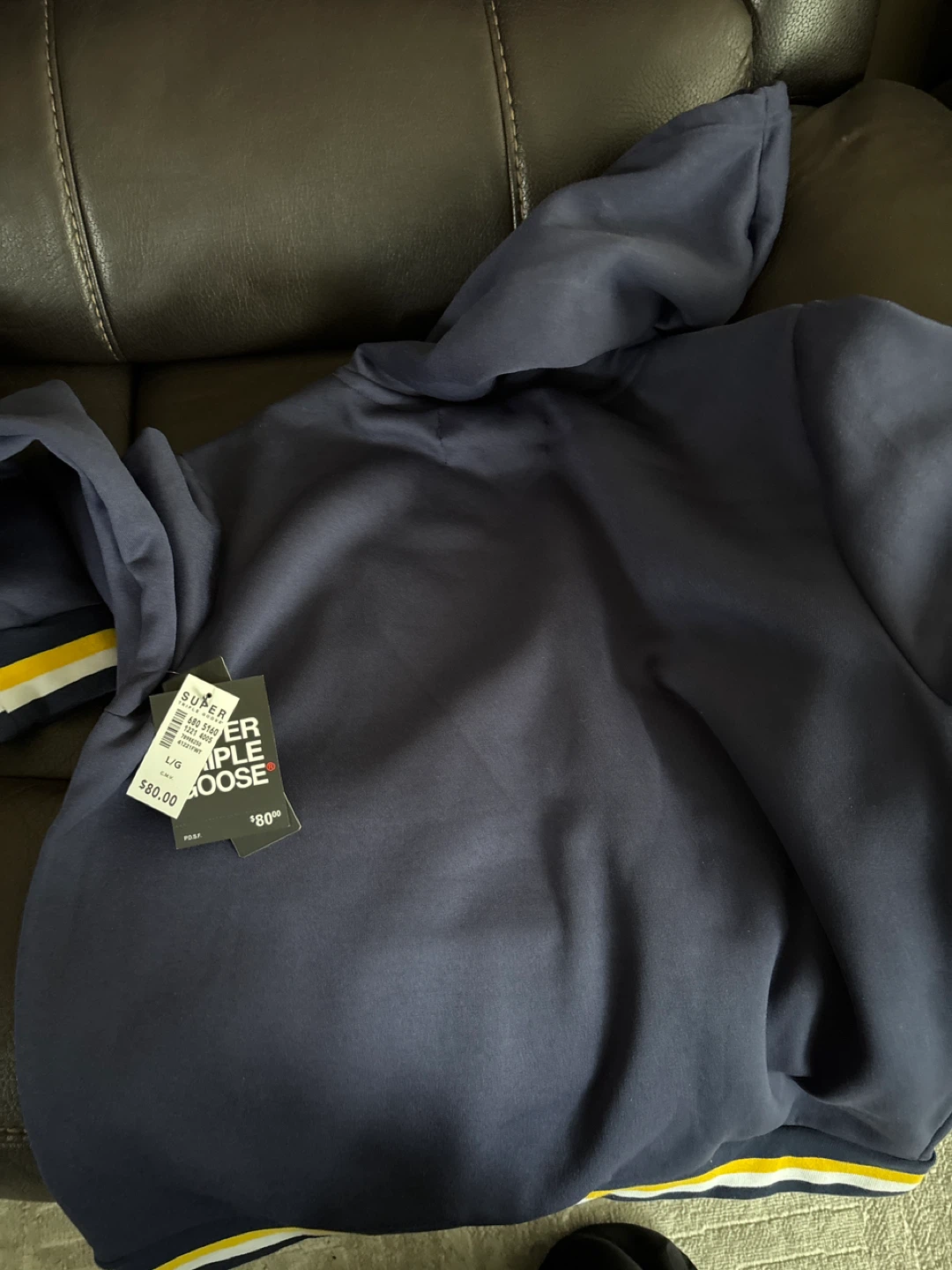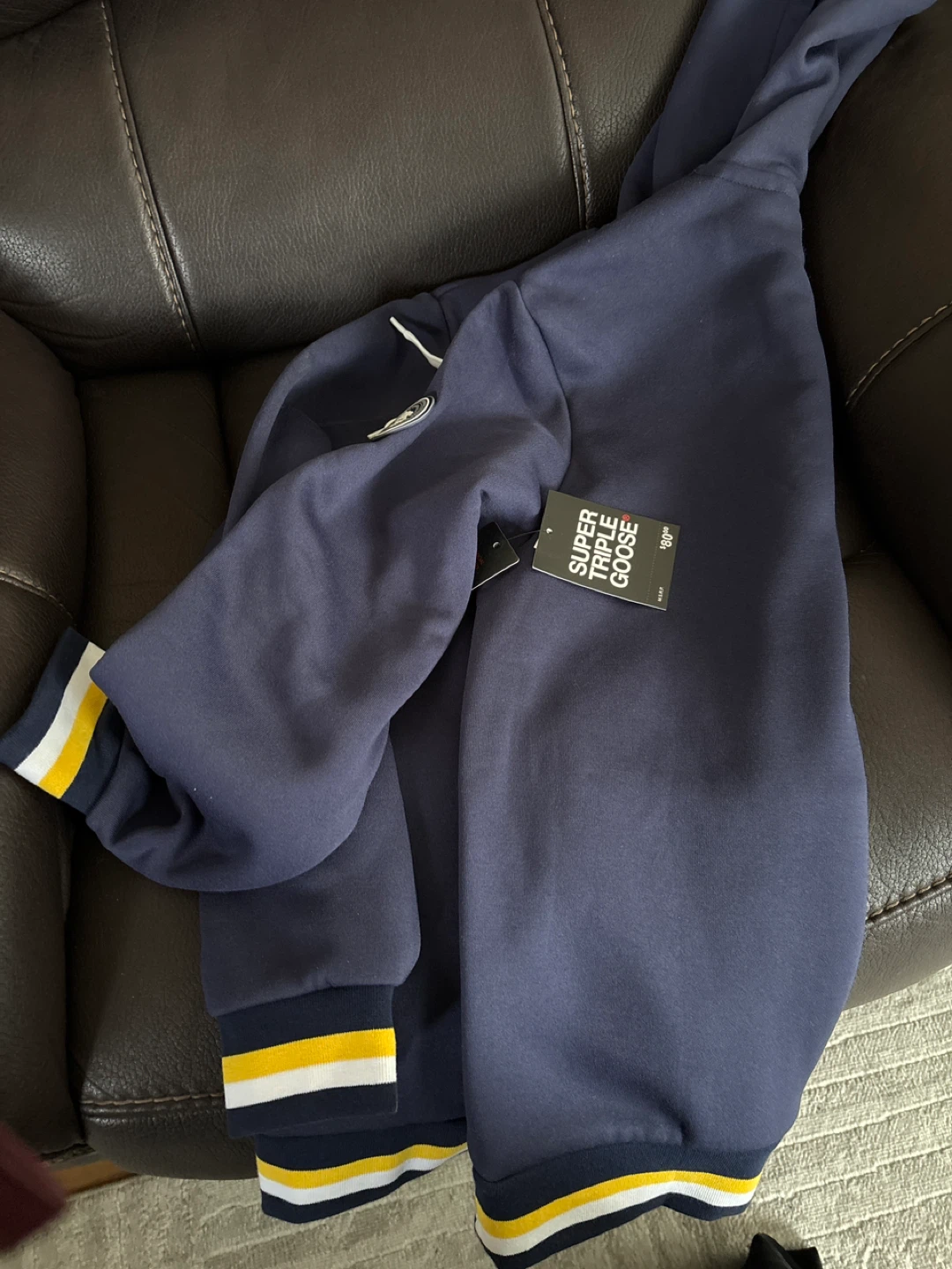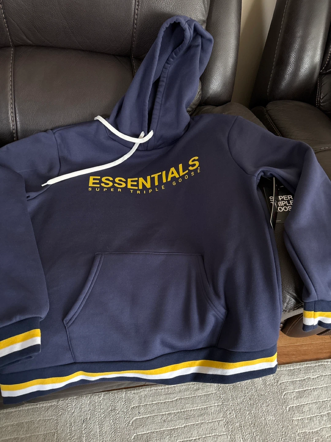 Selling a navy blue Essentials Super Triple Goose hoodie. It's a size large and in great condition. The hoodie has a yellow and white stripe detail on the cuffs and hem. The original tag is still attached, showing the price was $80