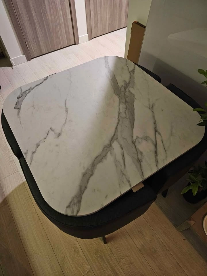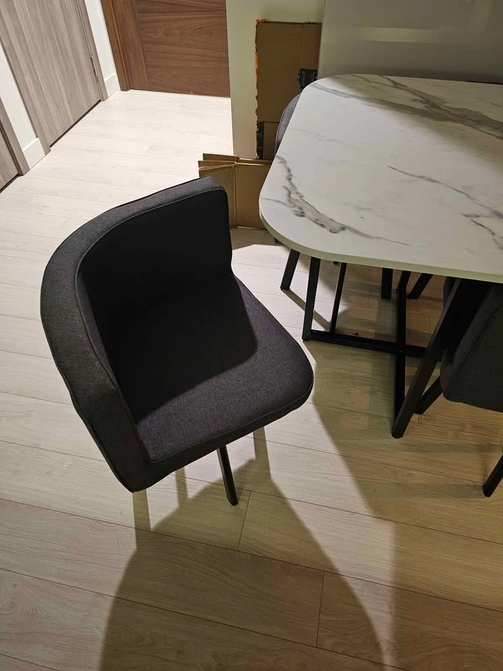 Already built BRAND NEW. No flaws, no tears, never been used, only for staging. 93cmx93cm. Comes with chairs. Firm.