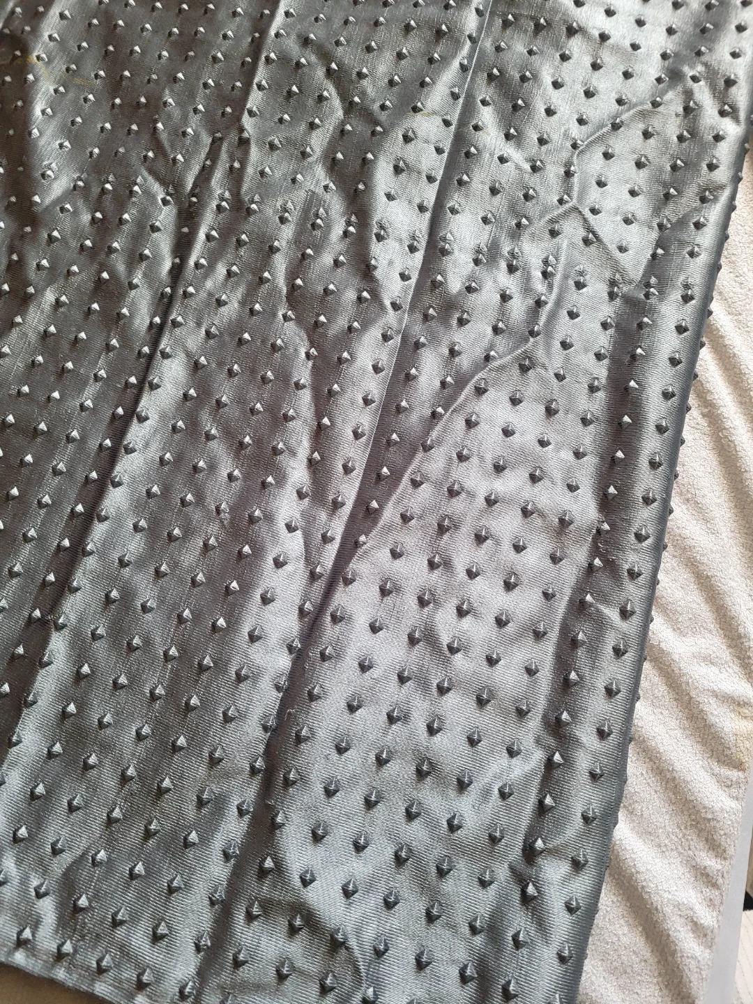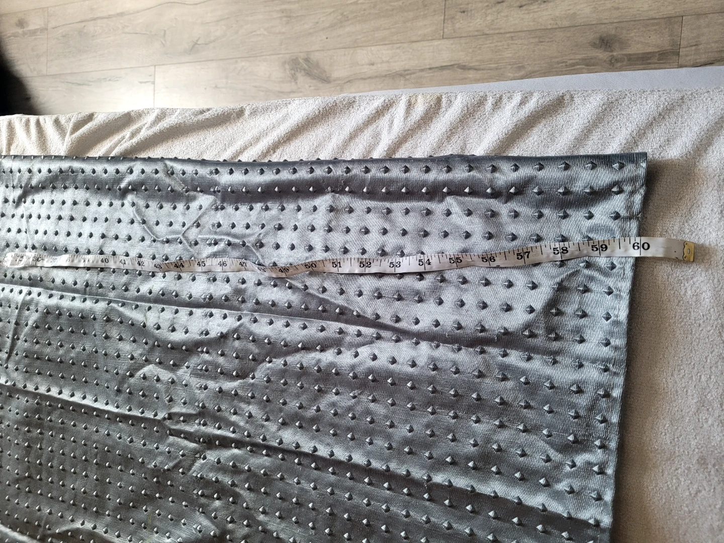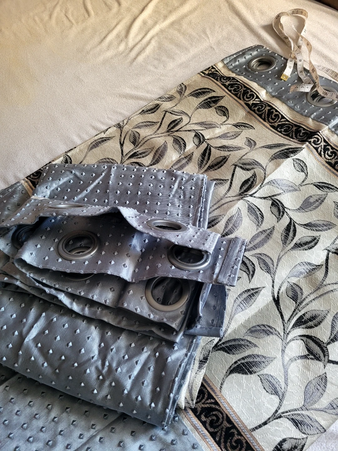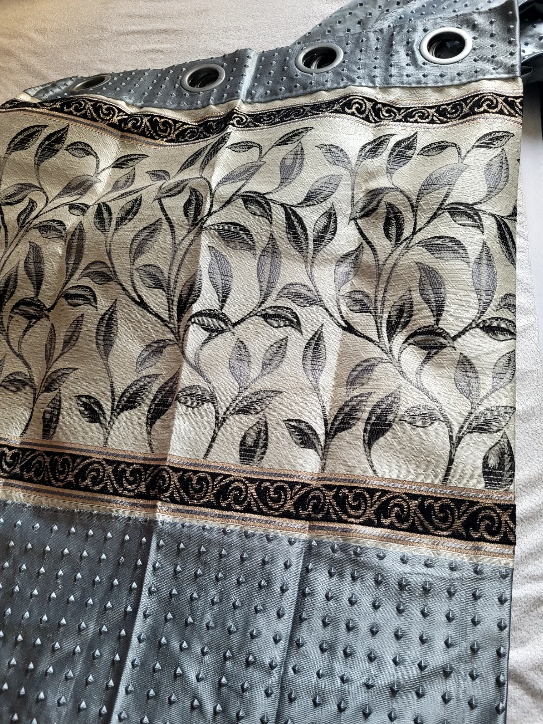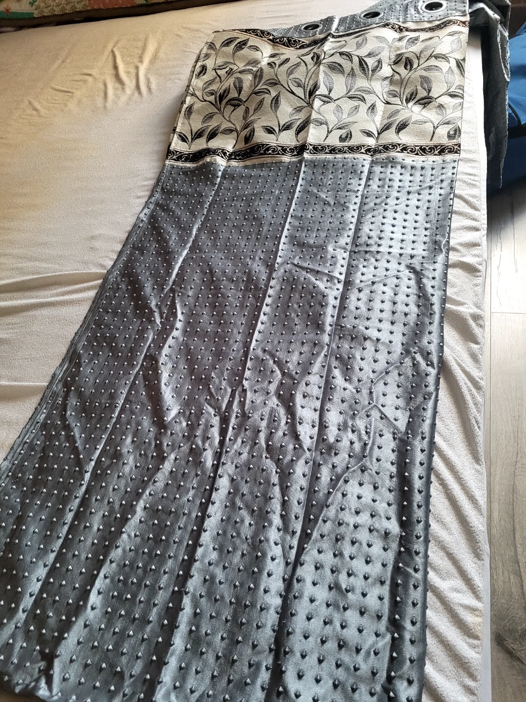 Selling a 2 window curtain panel with a lovely floral pattern in grey and beige. The bottom portion of the curtain is a solid grey colour with a textured design. It measures approximately 60 inches in width. It would look great in any room!