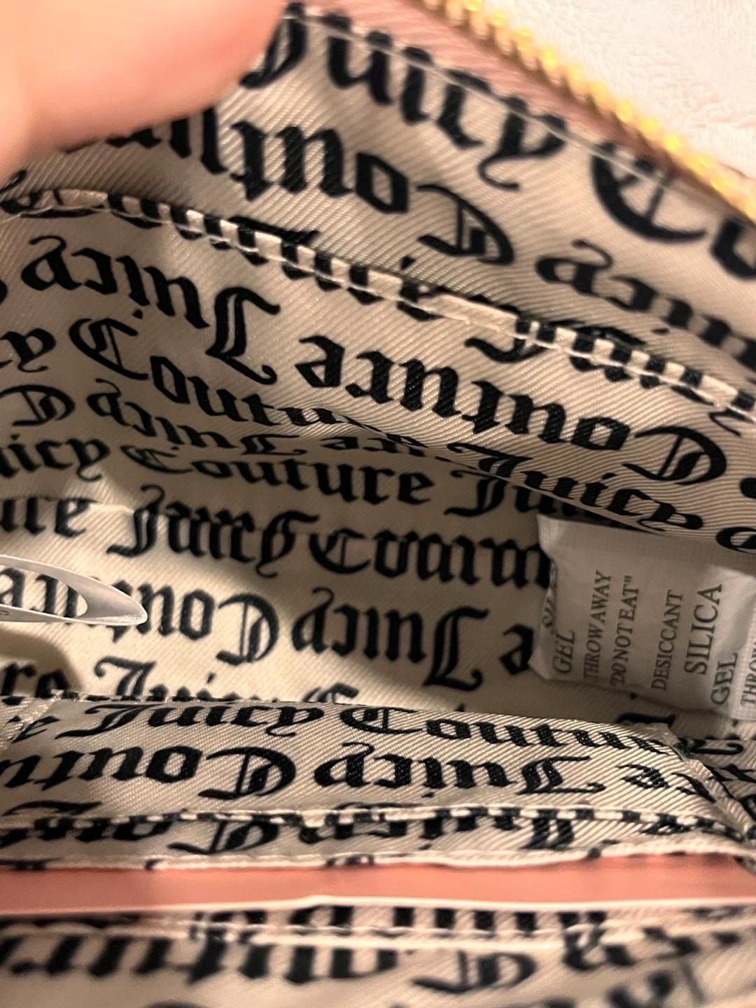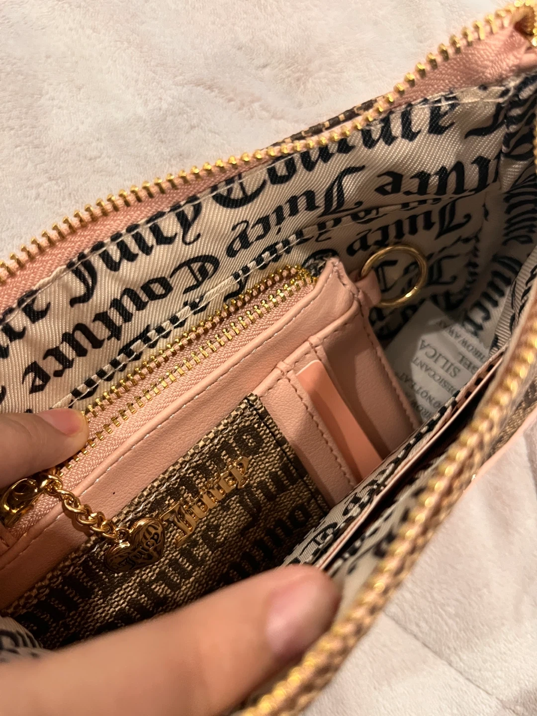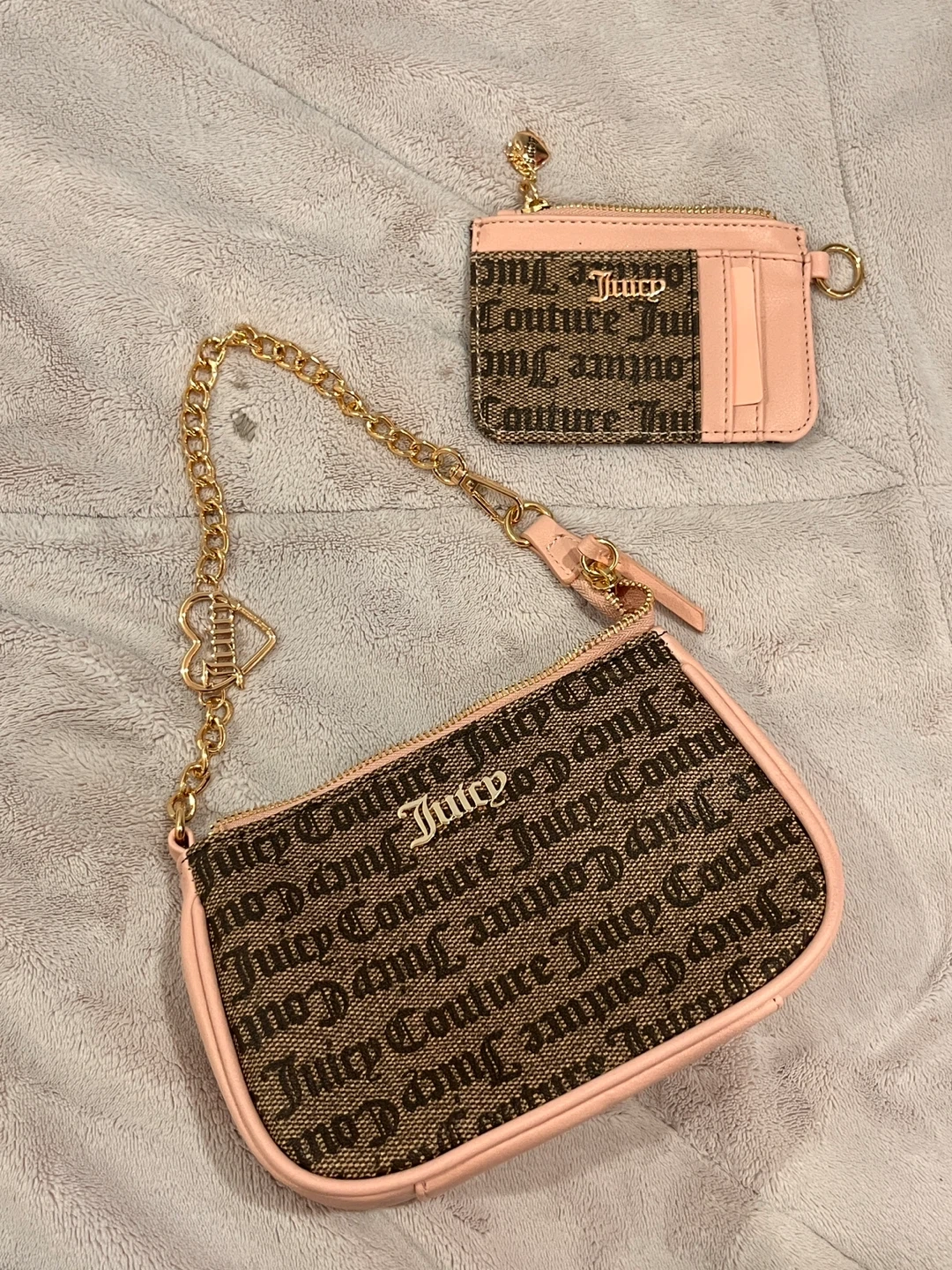 Selling a cute Juicy Couture mini bag and card holder set! The bag features a brown and pink design with a gold chain. The card holder matches perfectly. Both items are in great condition and ready for a new owner!