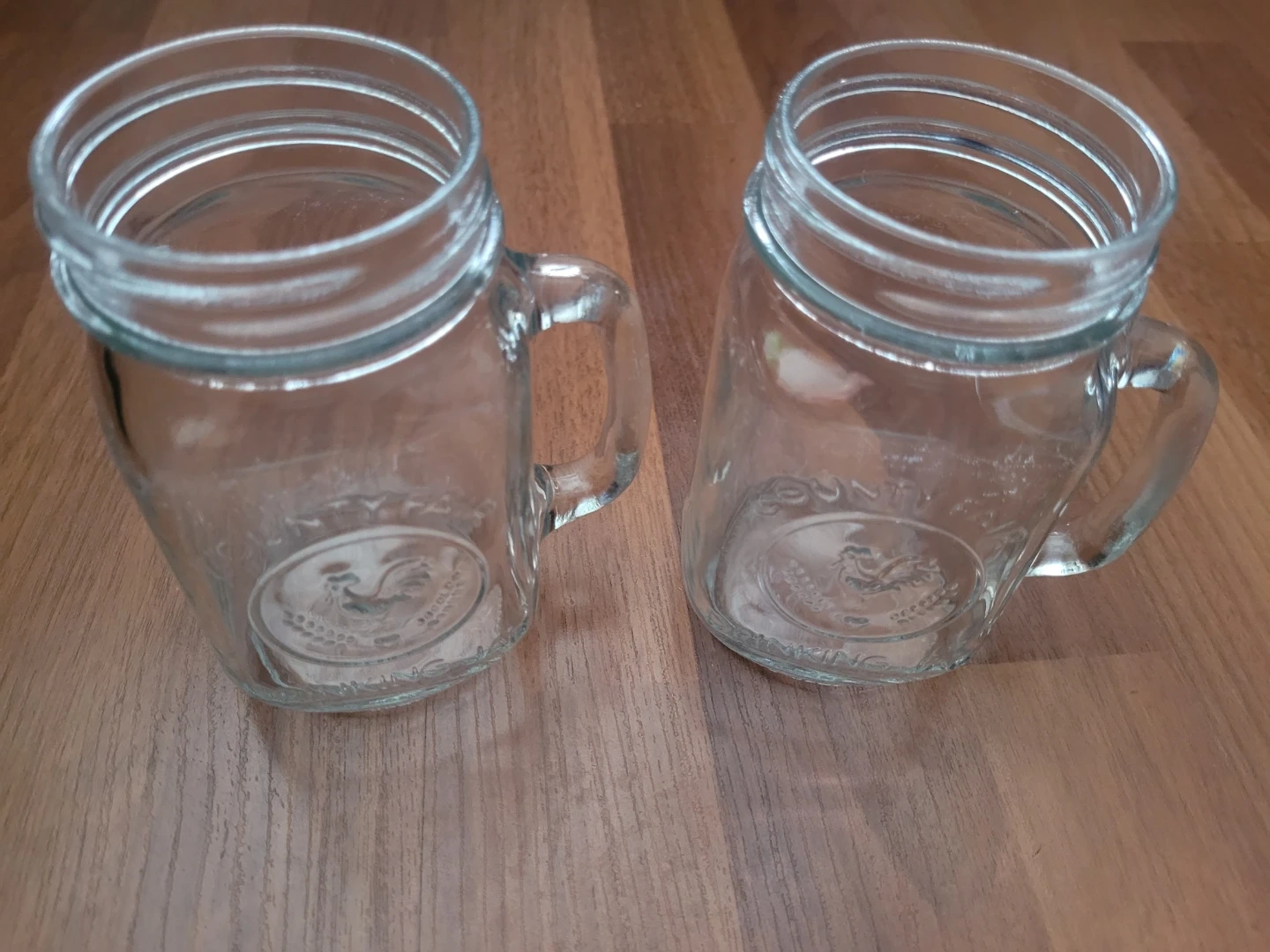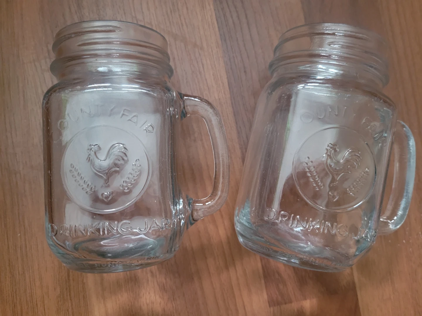 Here's a pair of County Fair drinking jar mugs, perfect for adding a touch of rustic charm to your kitchen or bar. These mugs are in good, used condition. They have some minor wear from normal use, but are otherwise in good shape, ready to hold your favourite beverages! Why not sip your morning coffee, afternoon iced tea, or evening cocktail in these delightful mugs? They're just waiting to be part of your next refreshing moment.