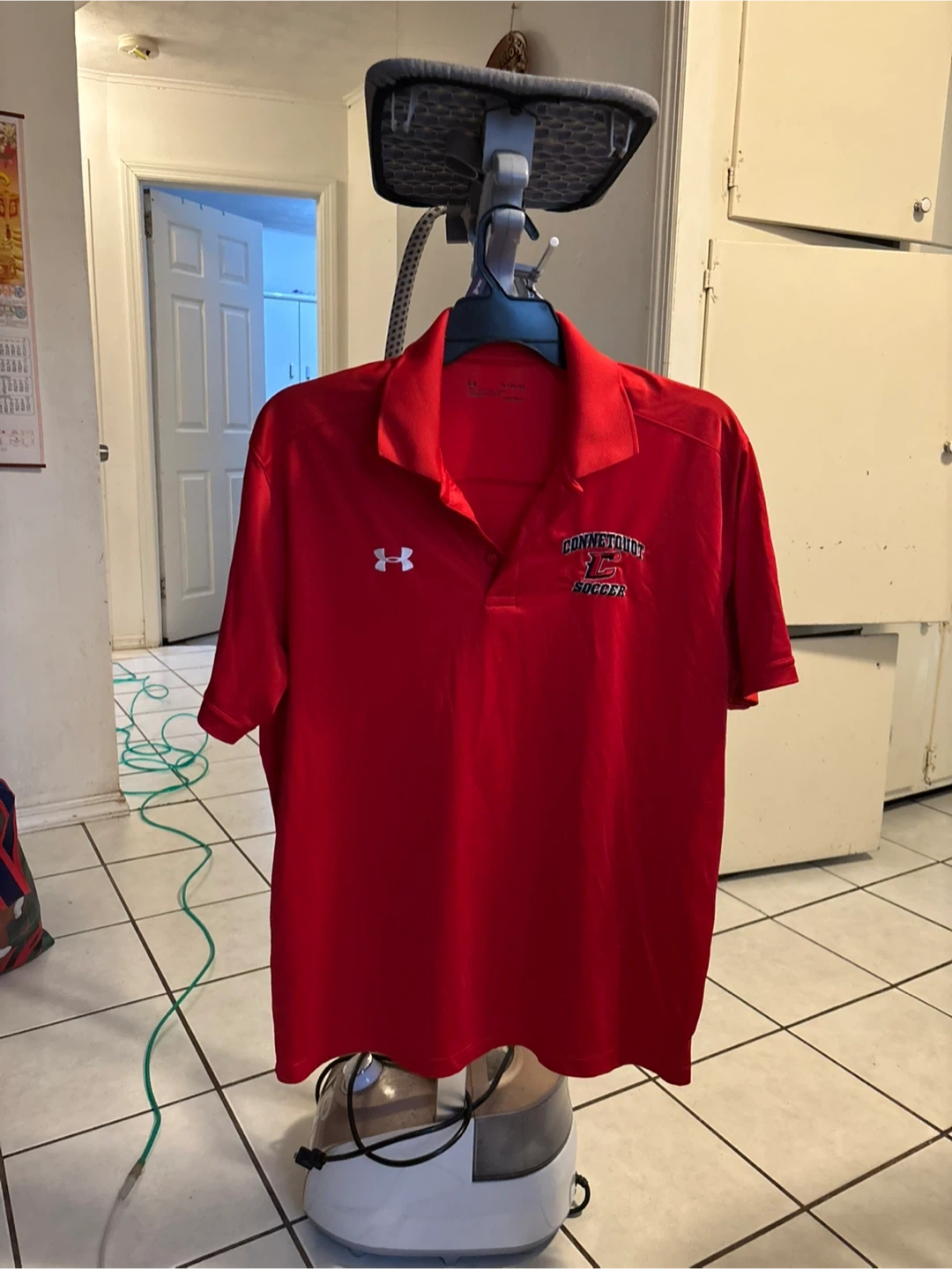 Selling a red Under Armour polo shirt with the Connecticut Soccer logo. It's in great condition and perfect for showing your team spirit!