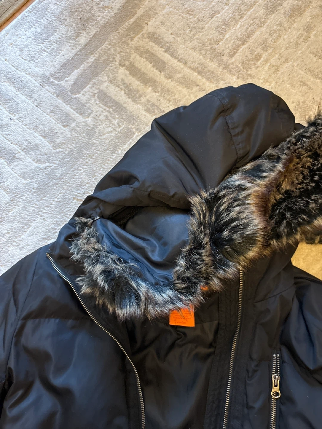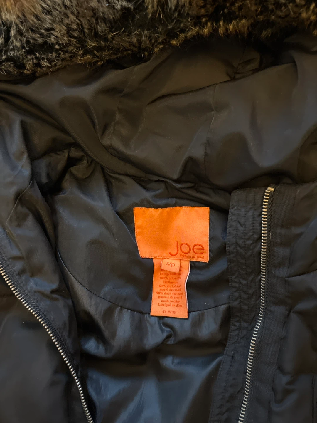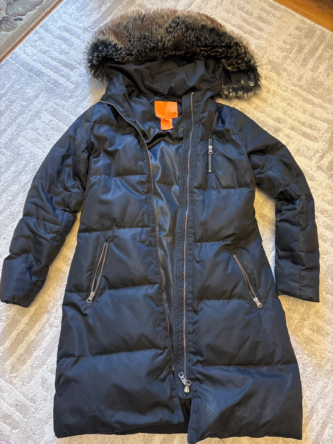 I'm selling a Joe Fresh black puffer coat in size small. It's in great condition and ready for the colder weather! The coat features a faux fur-trimmed hood and a zippered front closure