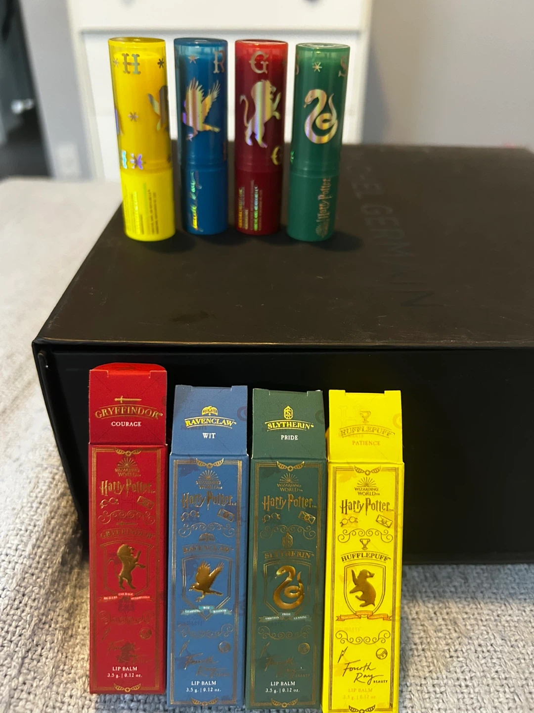 Selling a set of NEW Harry Potter x Fourth Ray Beauty lip balms! Each balm represents a different Hogwarts house: Gryffindor, Slytherin, Ravenclaw, and Hufflepuff. They're all brand new and ready to keep your lips moisturized with shea butter and vitamin E.