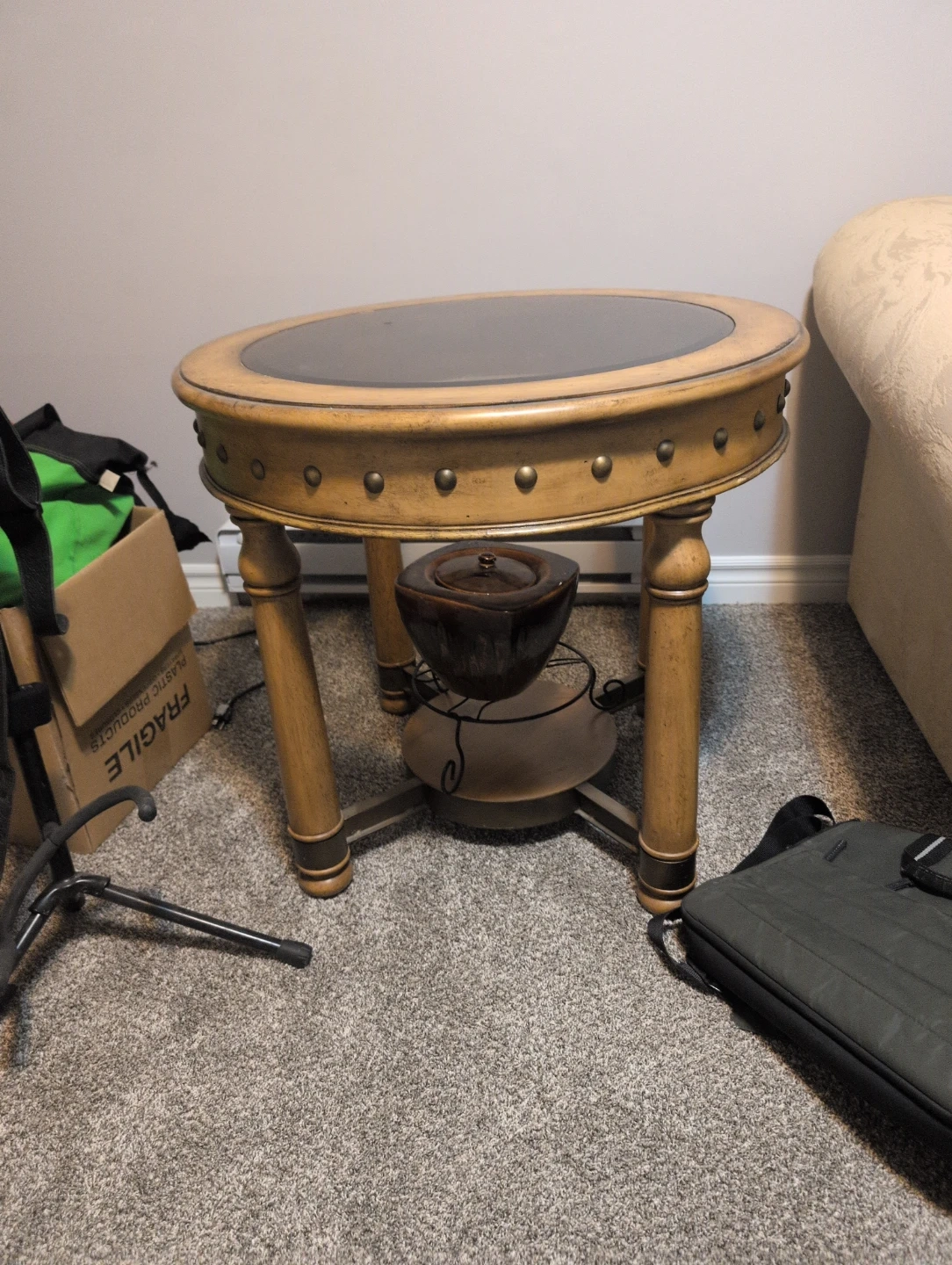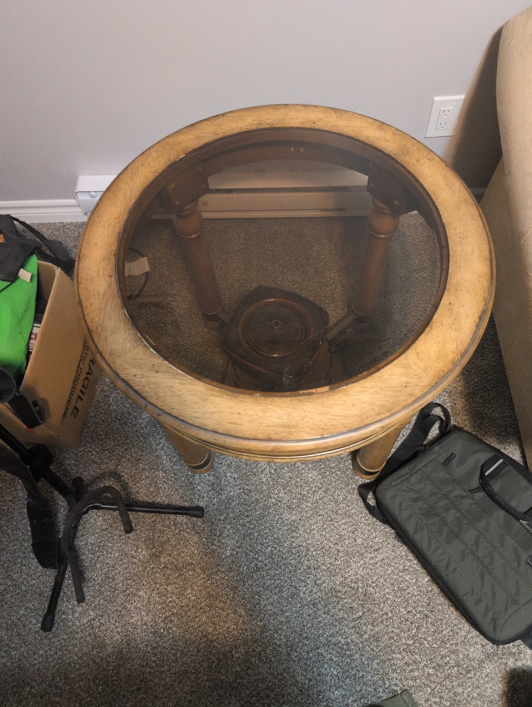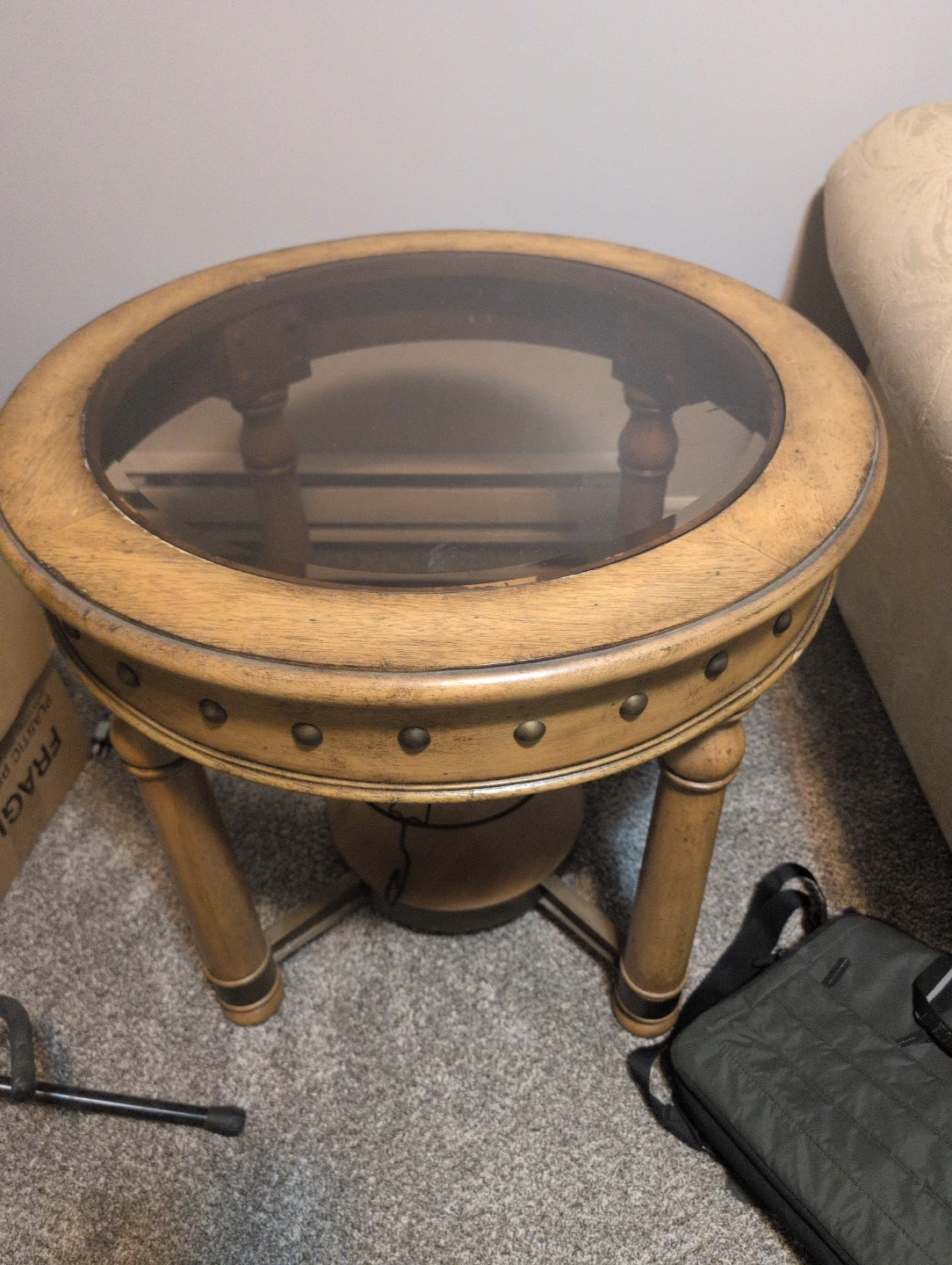 Selling a lovely round end table with a wooden frame and glass top. It has a unique design with decorative accents. It's in good condition and would be a great addition to any living room or bedroom!