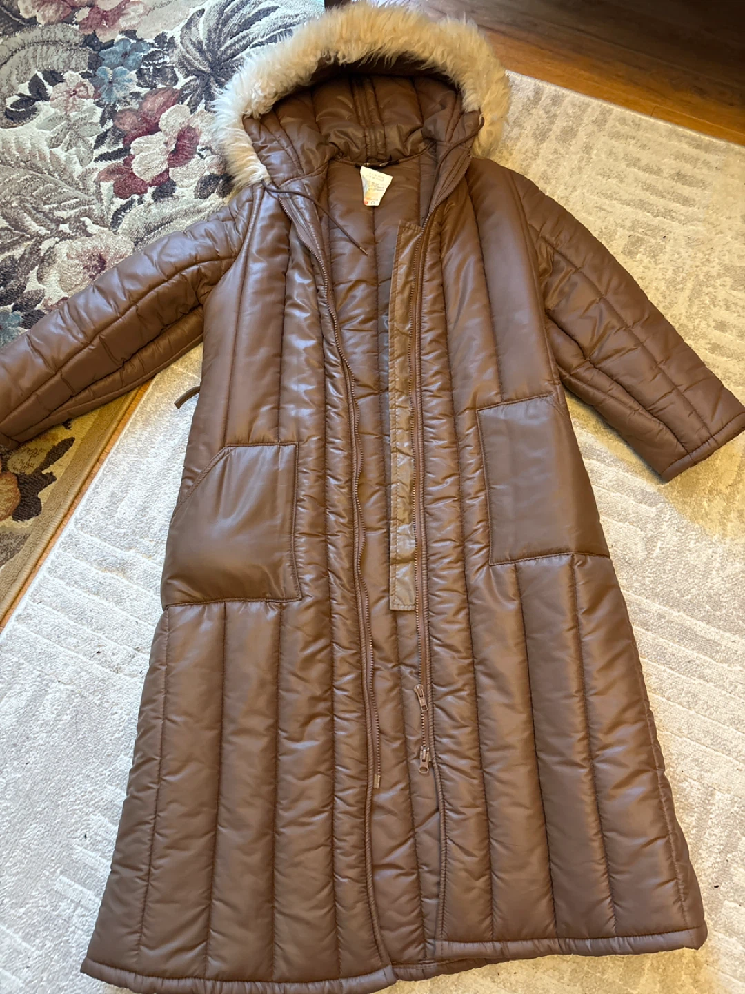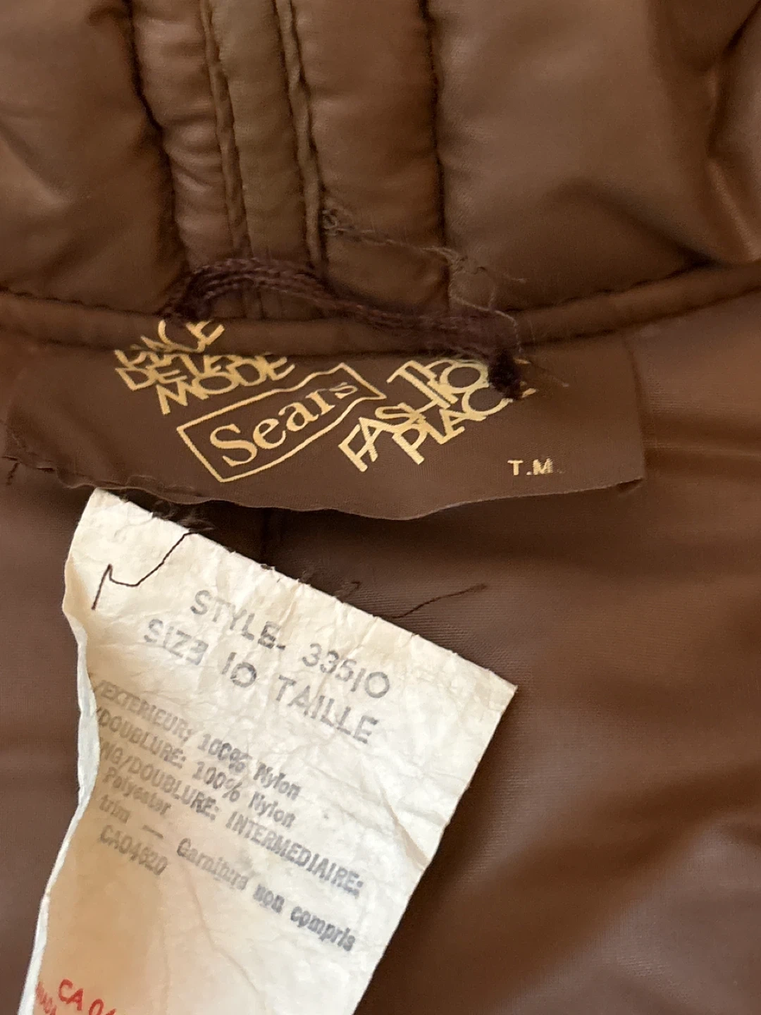 Selling a vintage Sears puffer coat in a lovely brown colour! It's a size 10 and made with 100% nylon exterior and lining. Perfect for staying warm this winter!