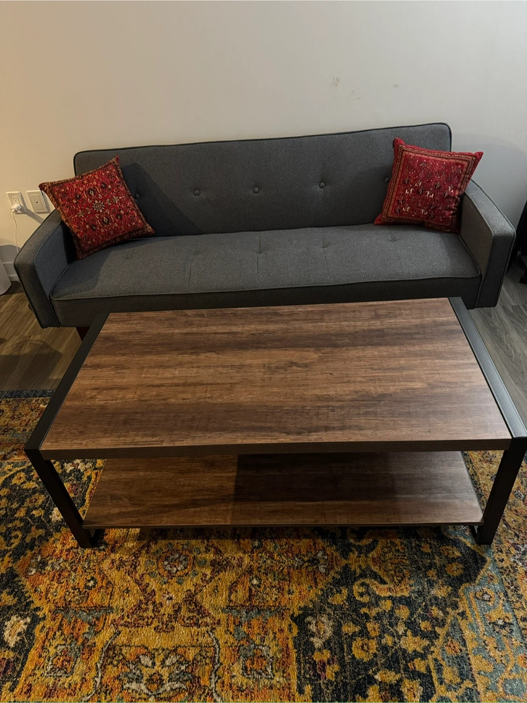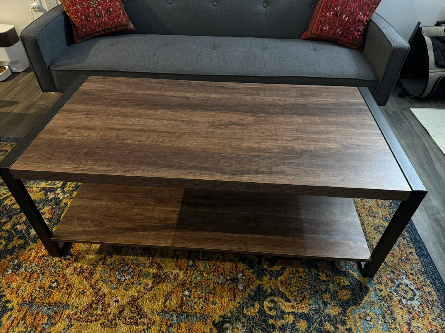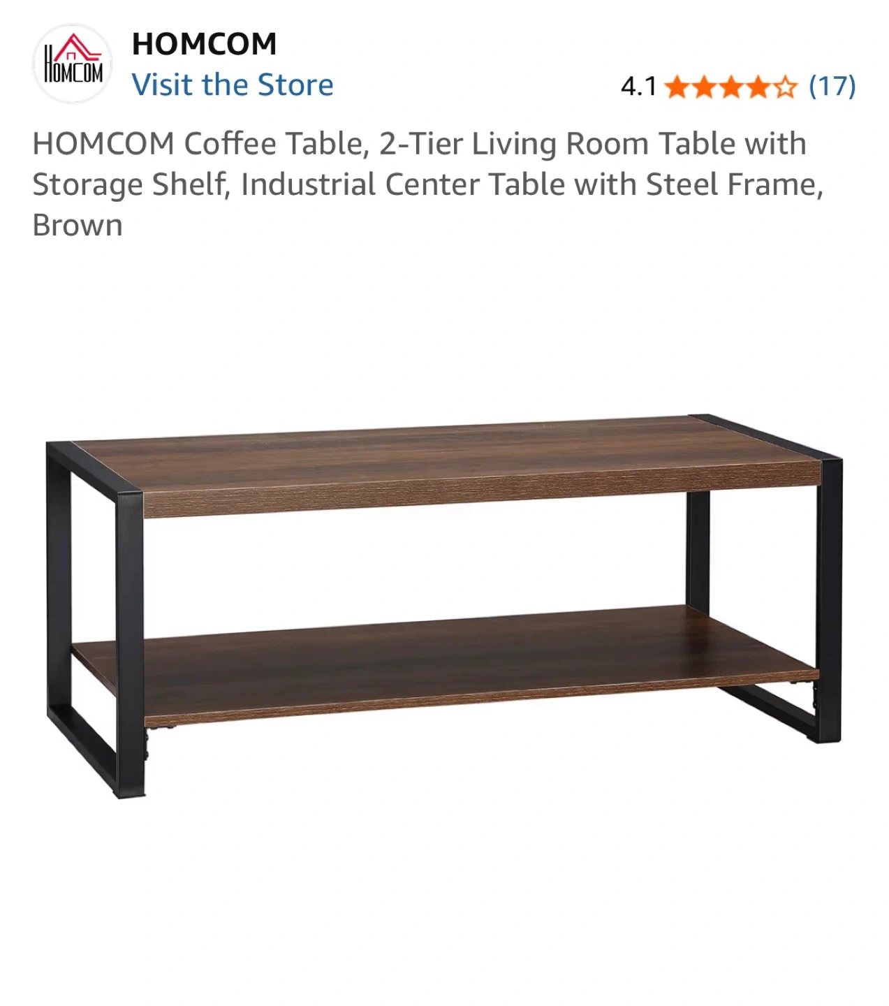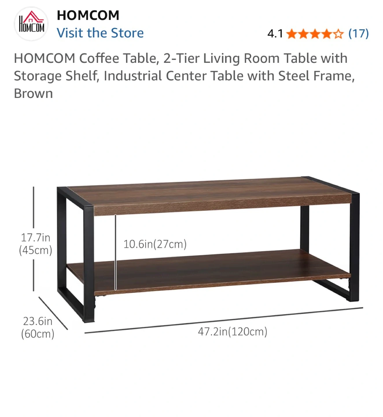 Selling a HOMCOM coffee table in great condition! It's a 2-tier living room table with a storage shelf and an industrial center table with a steel frame. The table is brown and measures approximately 47.2 inches (120cm) in length, 23.6 inches (60cm) in height, and 17.7 inches (45cm) in width. It's perfect for adding a touch of industrial style to your living room!