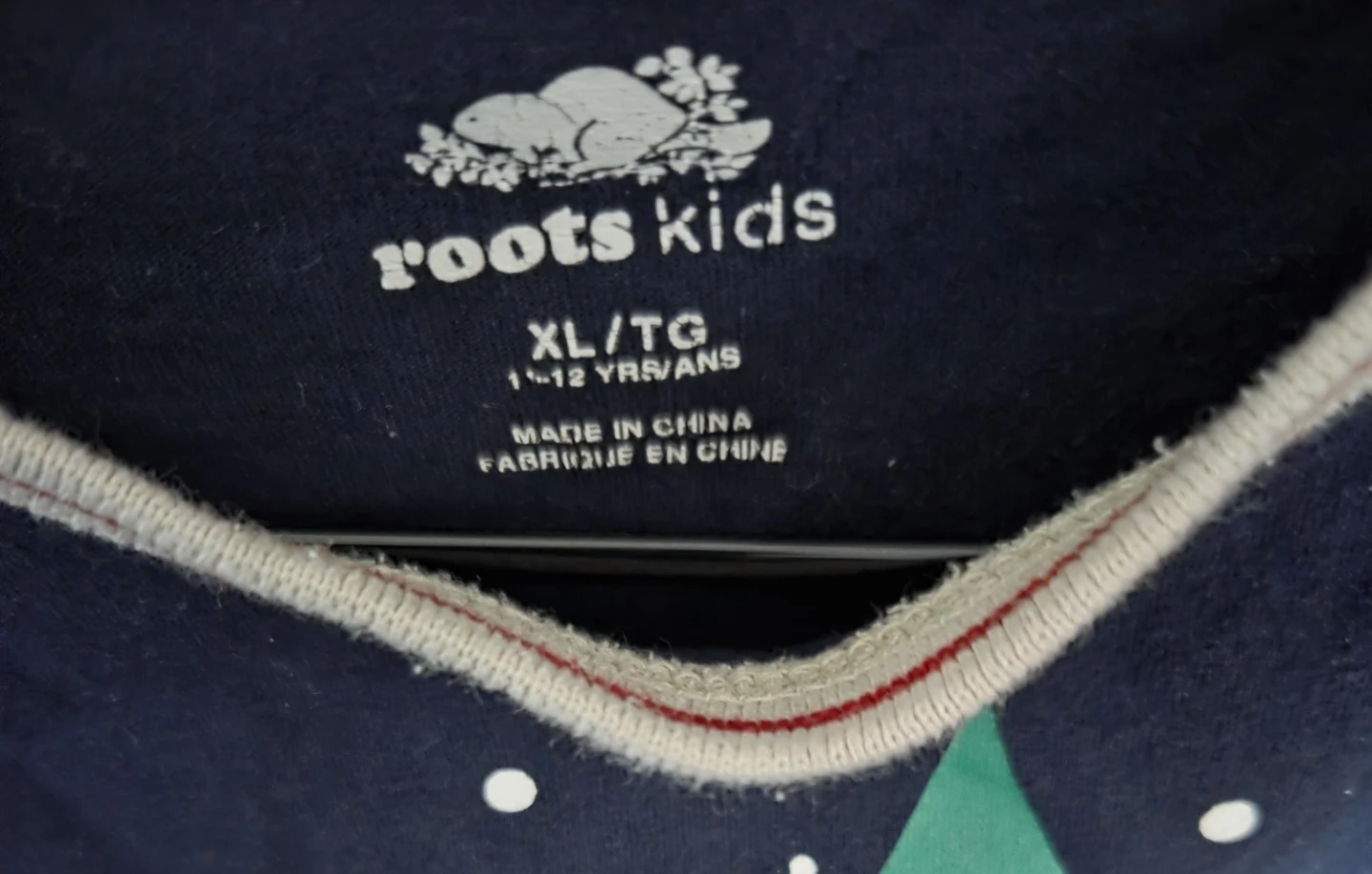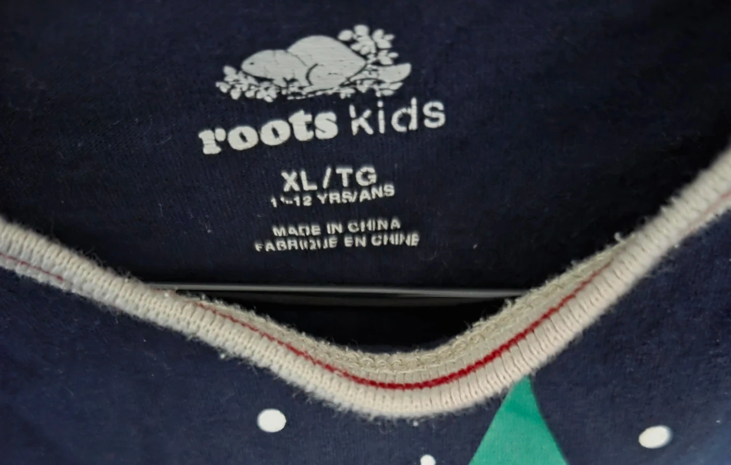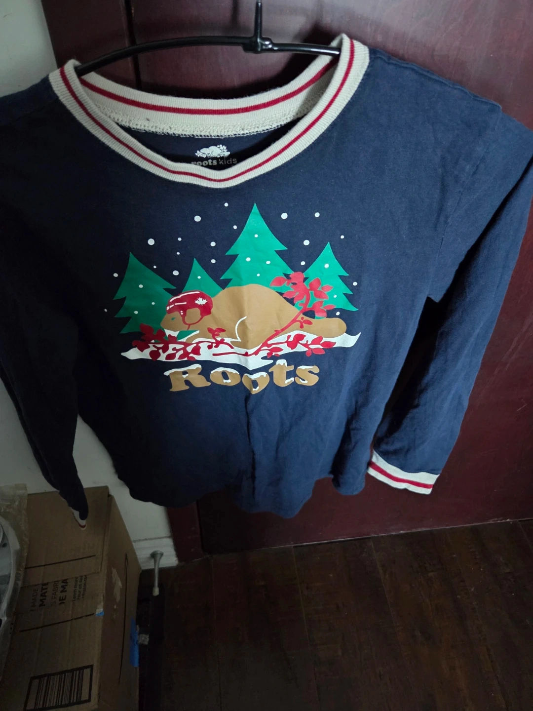 🤎Roots Kids long sleeve shirt in size XL/TG (11-12 years). It features a festive Christmas beaver design. The shirt is navy blue with red and white accents on the collar and cuffs.