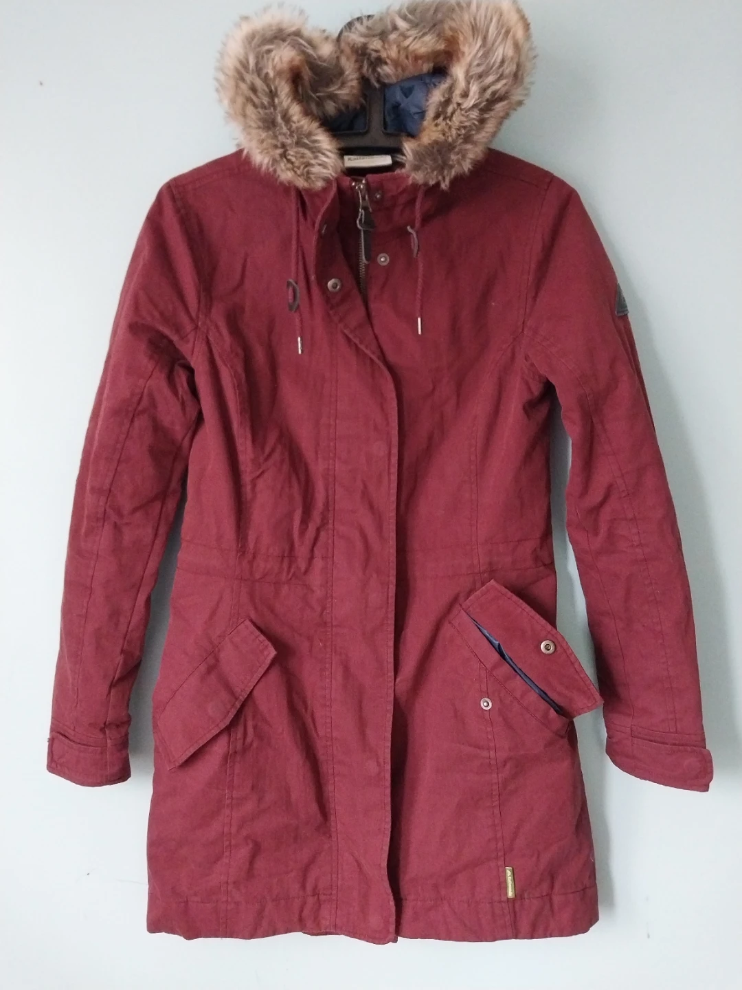 A stylish and warm Kathmandu winter coat in a lovely maroon colour! It's a size 6 and features a faux fur-trimmed hood to keep you cozy during those cold Canadian winters
