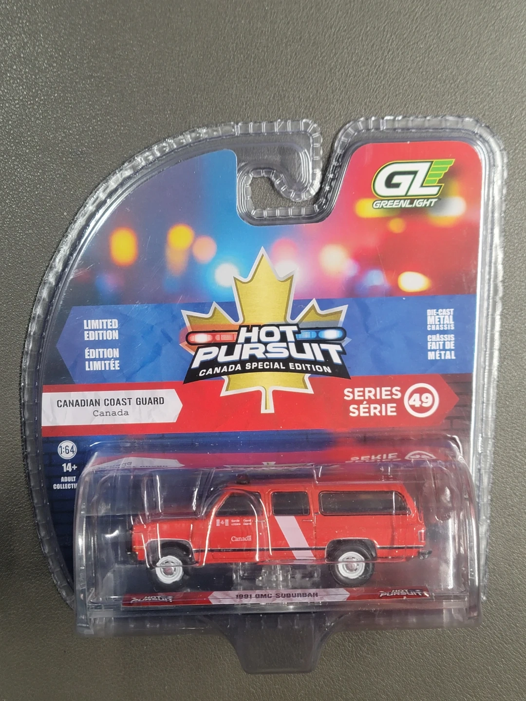 Selling a Greenlight Hot Pursuit Canada Special Edition Series 49 die-cast metal chassis of a 1991 GMC Suburban, Canadian Coast Guard version. It's a 1:64 scale model and recommended for ages 14+ for adult collectors. It's still in its original packaging!