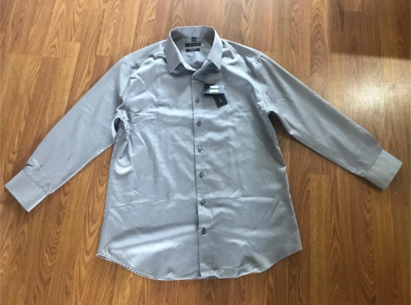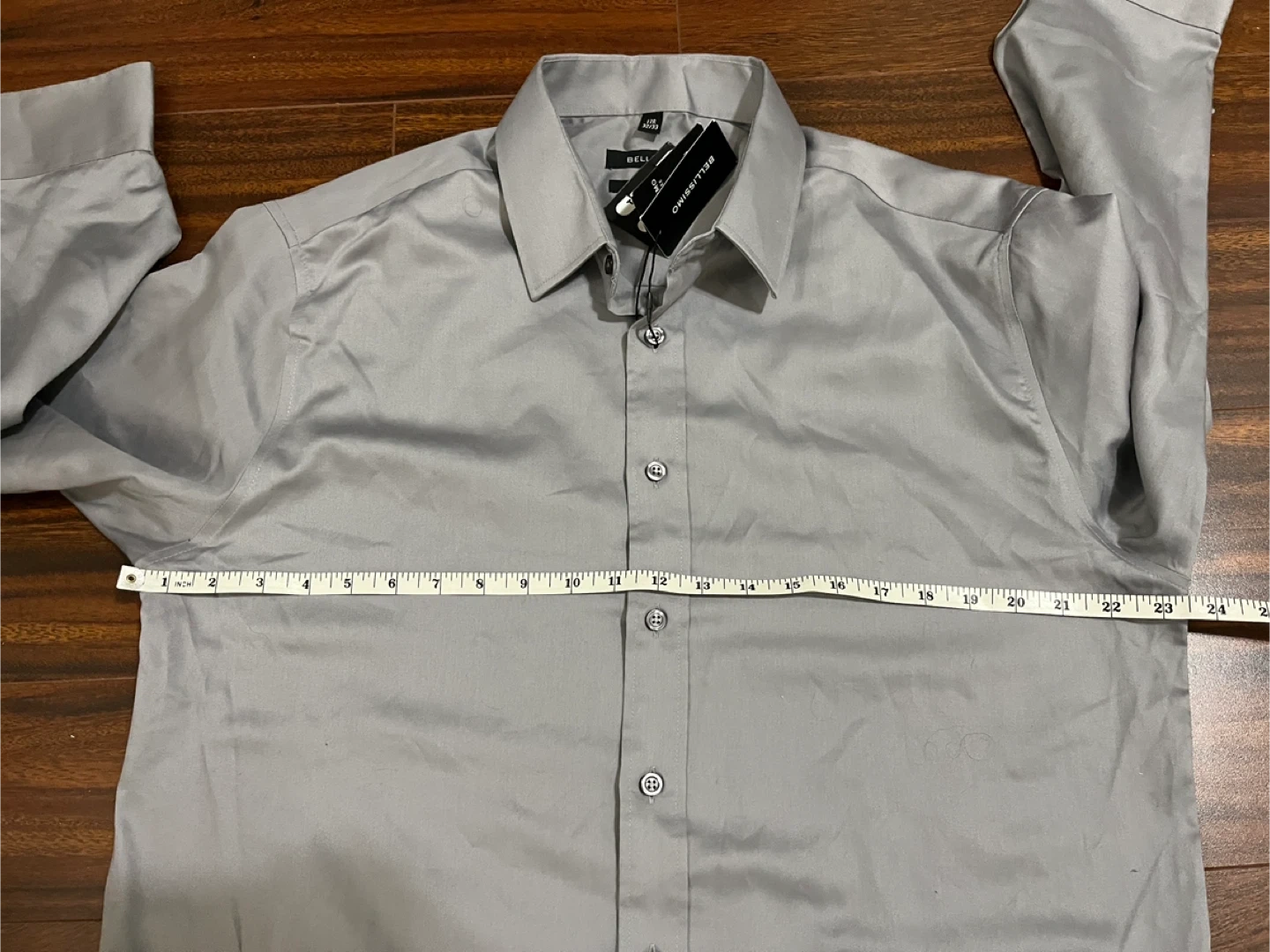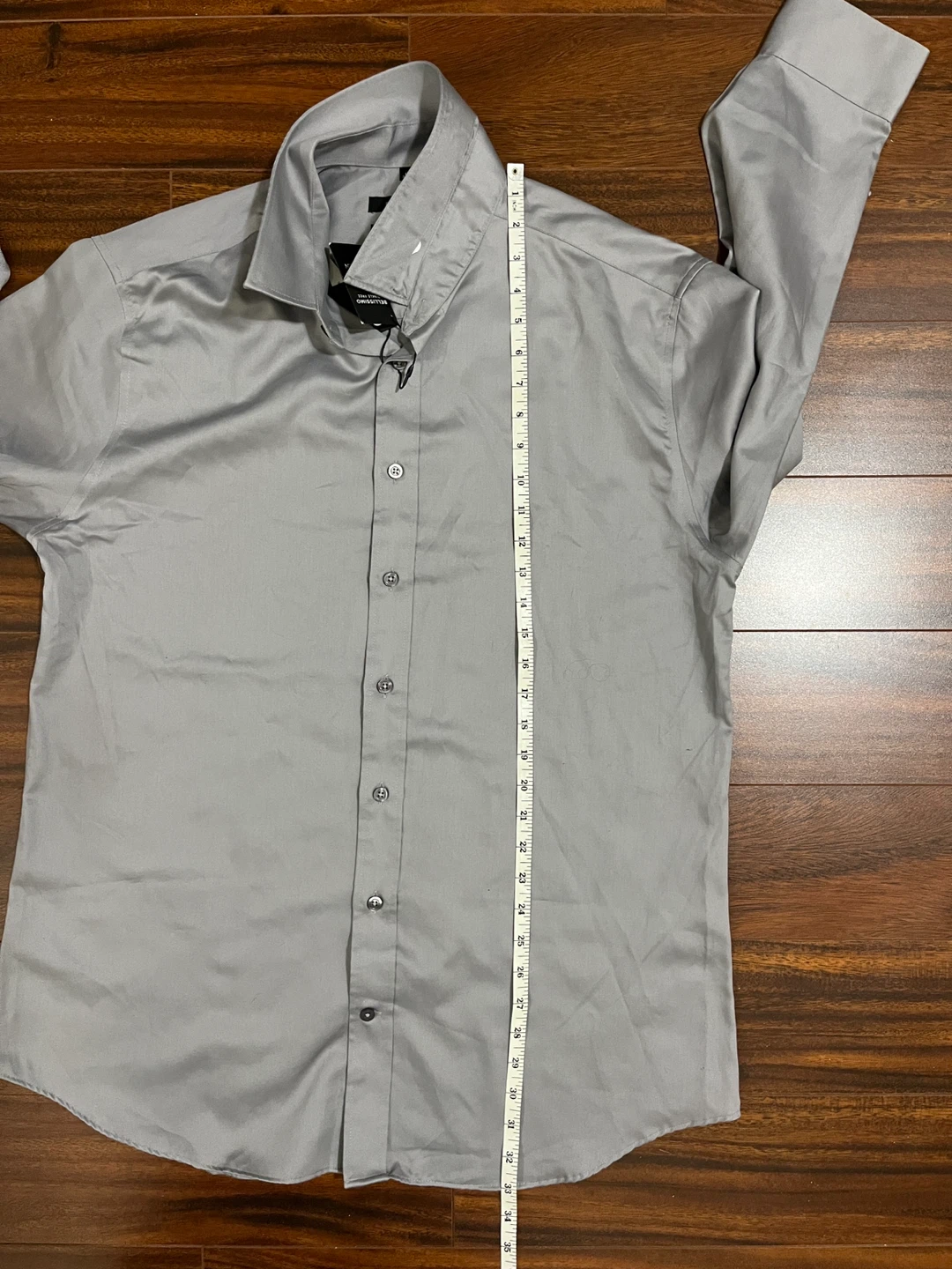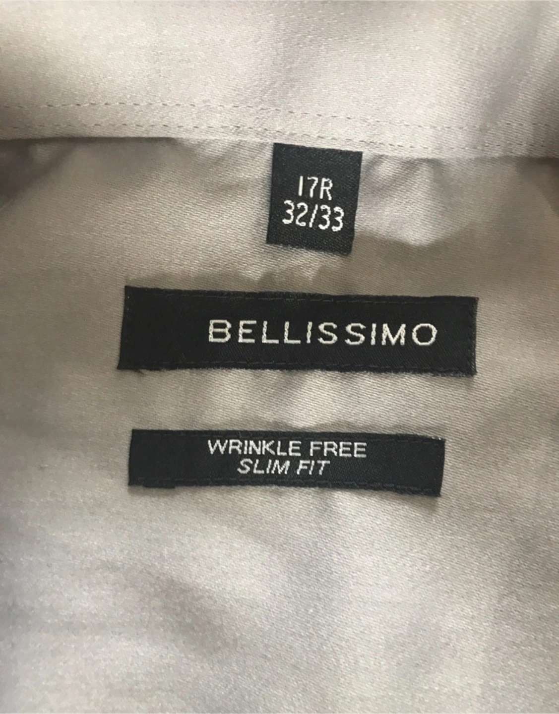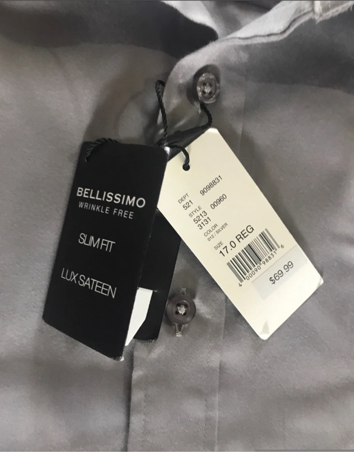 New with tags Bellissimo men’s slim fit dress shirt purchased at TipTop. The colour listed on the tag is silver which best reflects the soft grey silver tone shown. Made from a cotton blend sateen fabric with a subtle satin finish. The fabric and collar have some stretch. Easy care and wrinkle resistant.