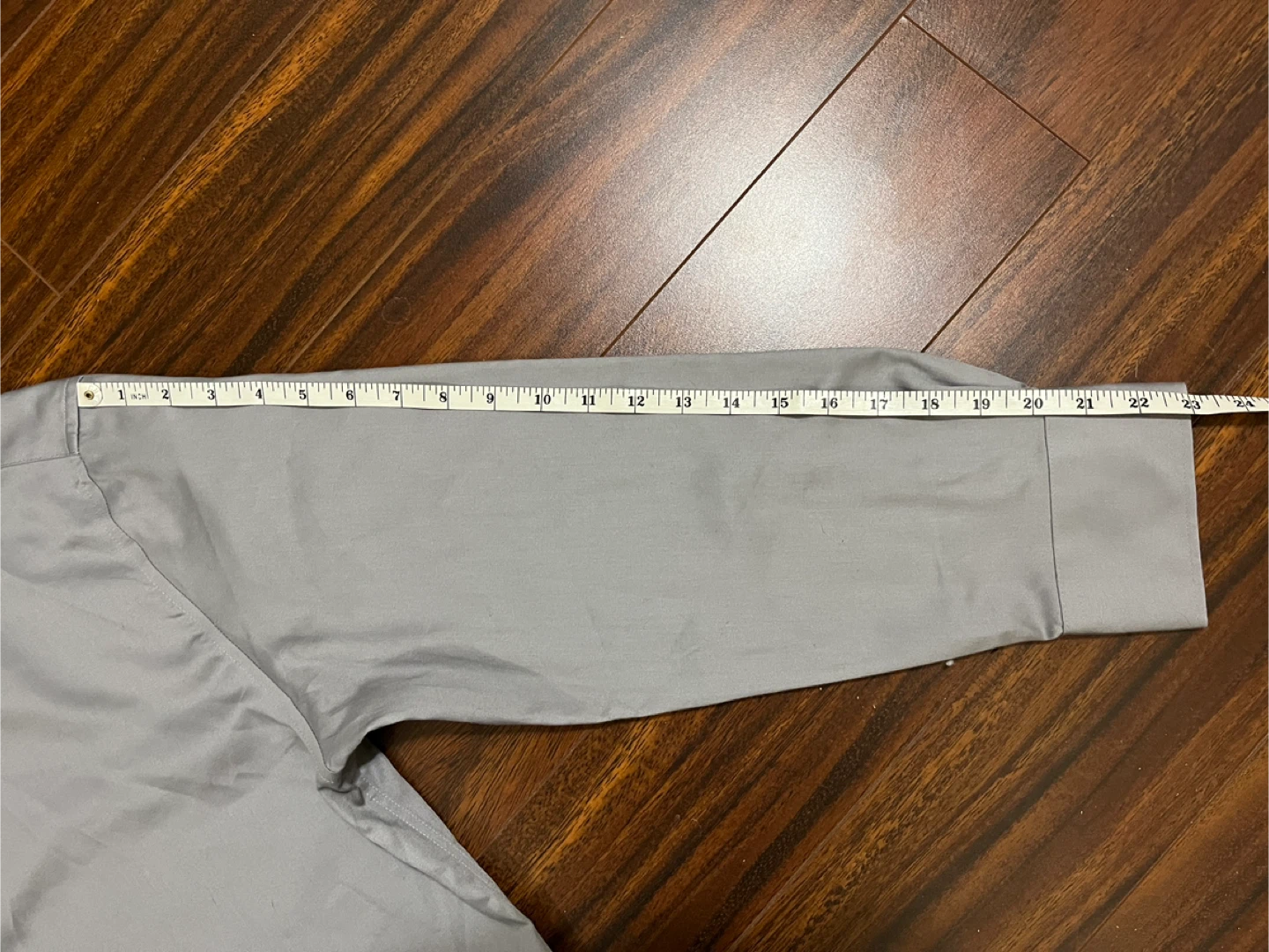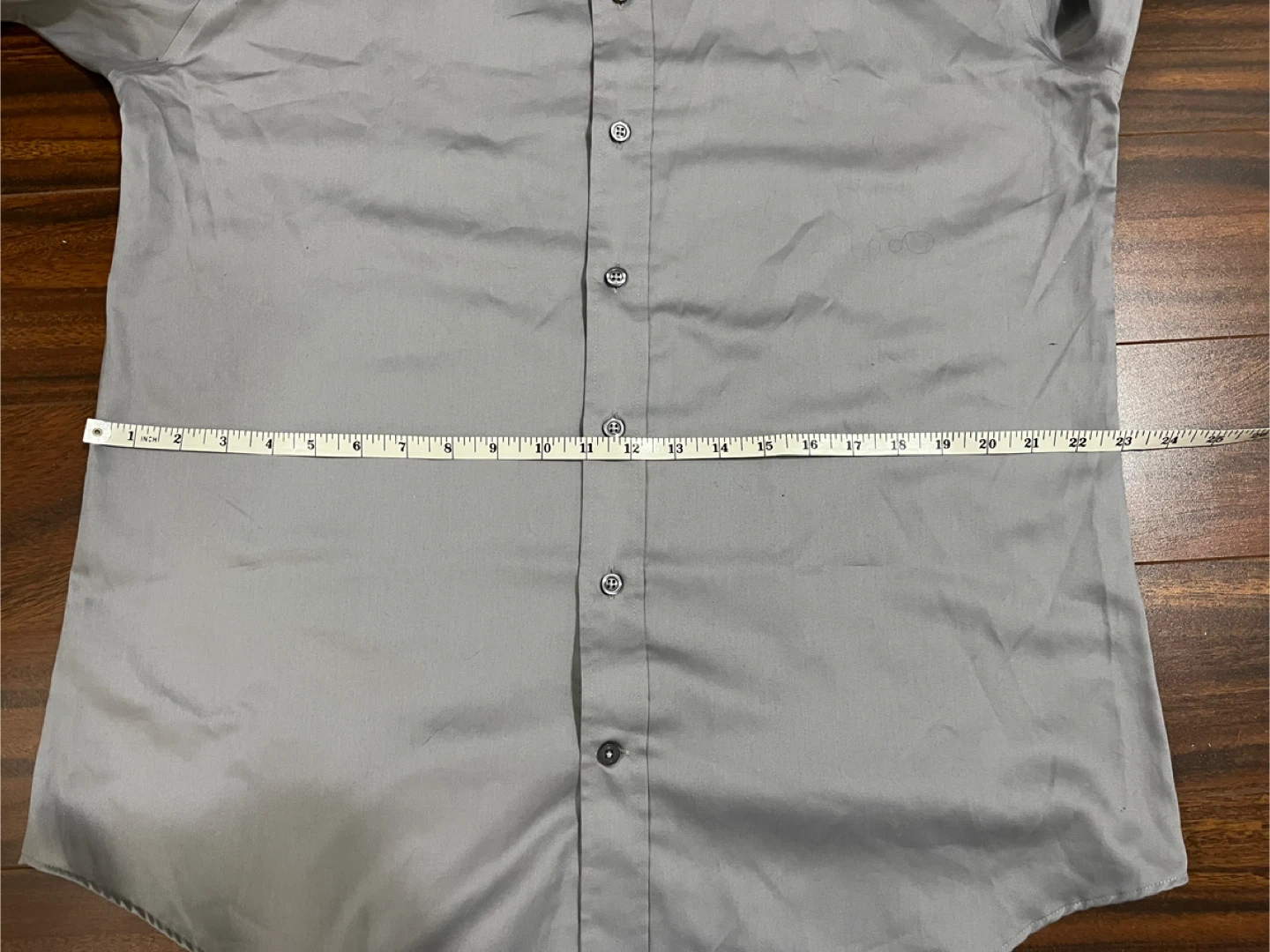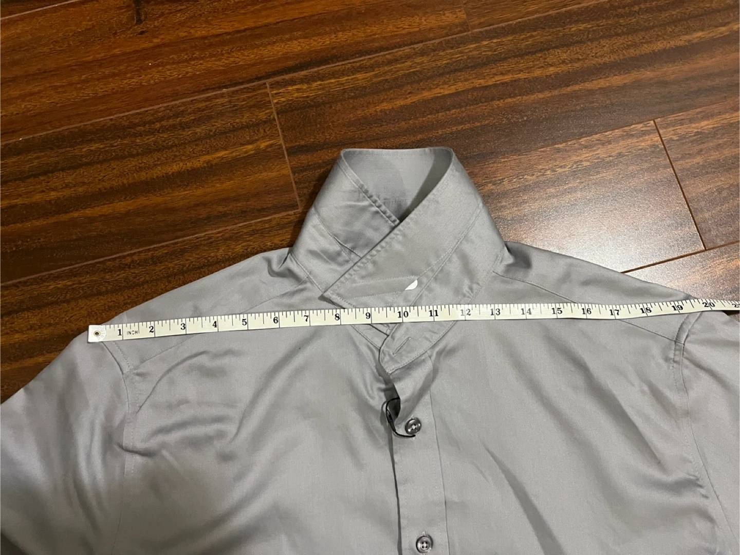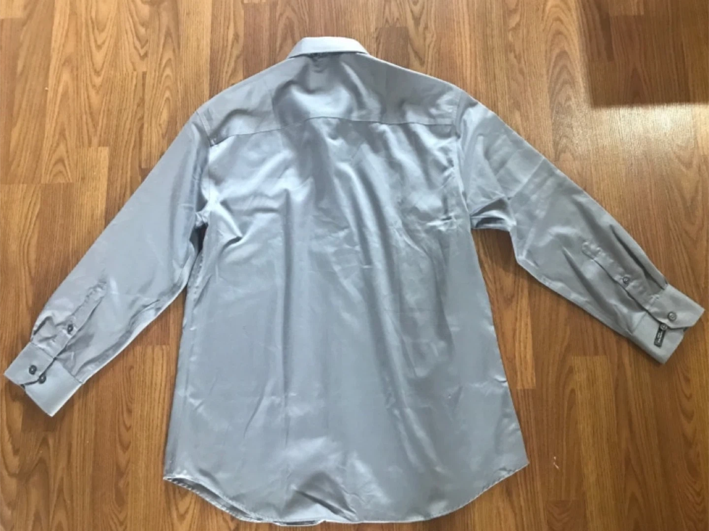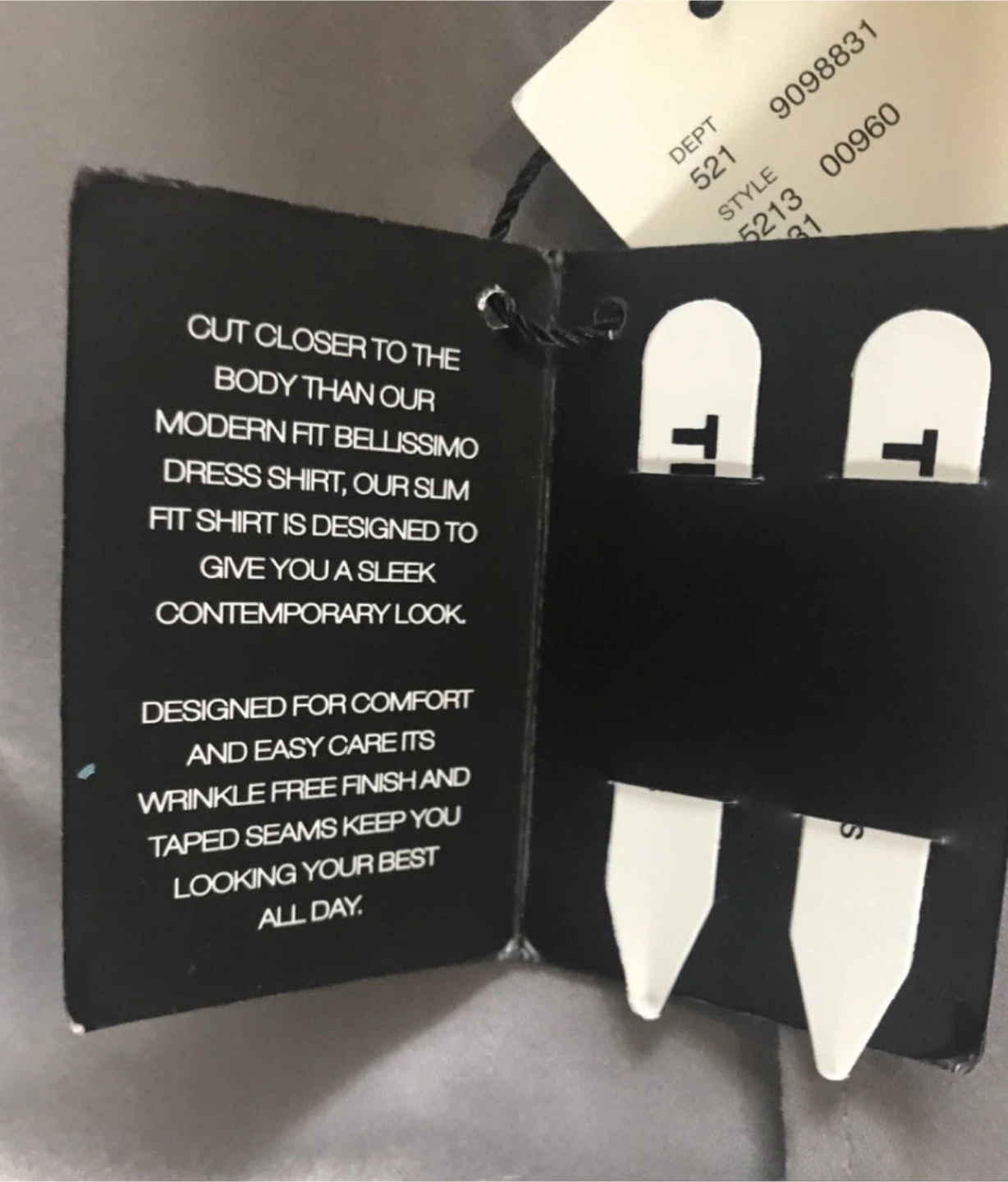 New with tags Bellissimo men’s slim fit dress shirt purchased at TipTop. The colour listed on the tag is silver which best reflects the soft grey silver tone shown. Made from a cotton blend sateen fabric with a subtle satin finish. The fabric and collar have some stretch. Easy care and wrinkle resistant.