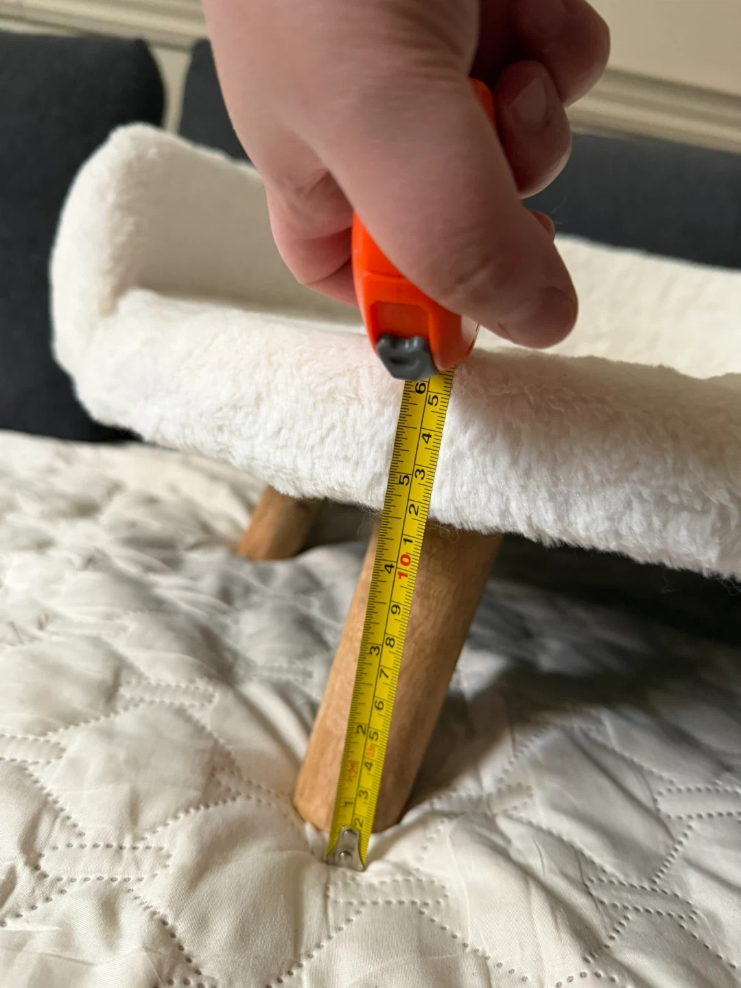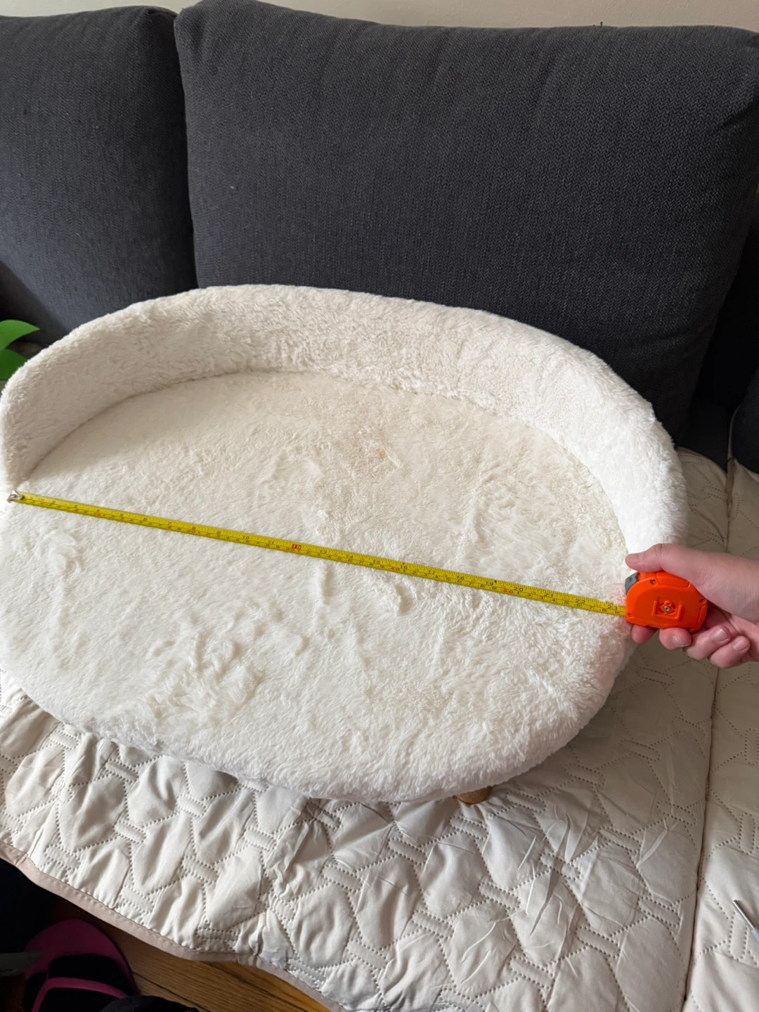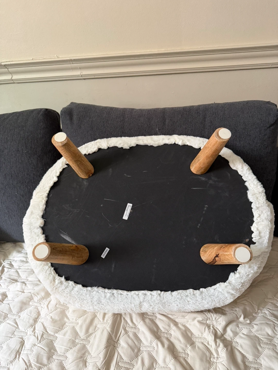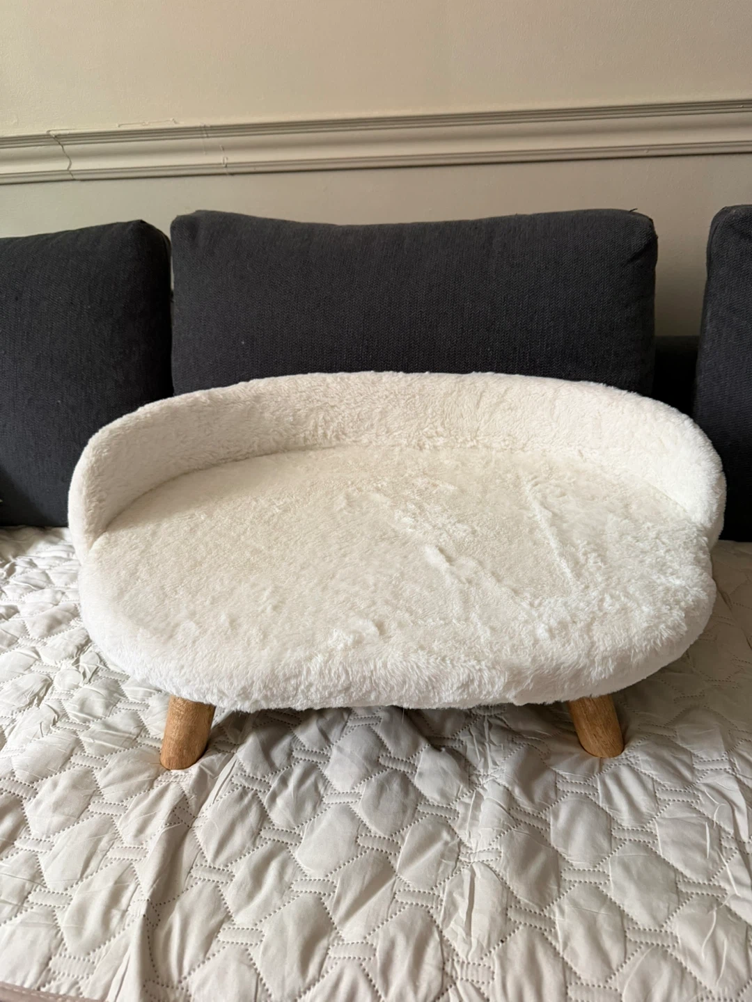 Selling a cute and comfy white fluffy pet bed! It's in great shape and ready for a furry friend. The bed has wooden legs and a soft, plush surface for your pet to relax on. Cleaning out some stuff! My cat never used it, maybe your pet will.