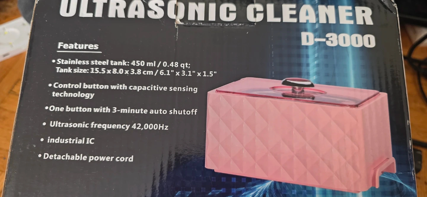 Selling an Ultrasonic Cleaner, model D-3000! This cleaner features a stainless steel tank with a capacity of 450 ml / 0.48 qt. The tank size is 15.5 x 8.0 x 3.8 cm / 6.1" x 3.1" x 1.5". It has a control button with capacitive sensing technology and a one-button operation with a 3-minute auto shutoff. The ultrasonic frequency is 42,000Hz, and it includes an industrial IC and a detachable power cord