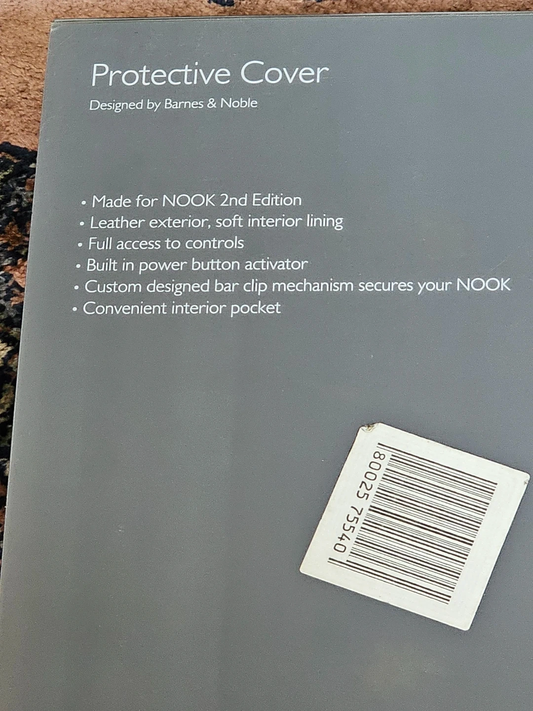 I'm selling a brand new Nook Protective Cover designed by Barnes & Noble. It's made for the NOOK 2nd Edition and features a leather exterior with a soft interior lining. You'll have full access to controls, and there's a built-in power button activator. The custom-designed bar clip mechanism secures your NOOK, and there's a convenient interior pocket. The box is included