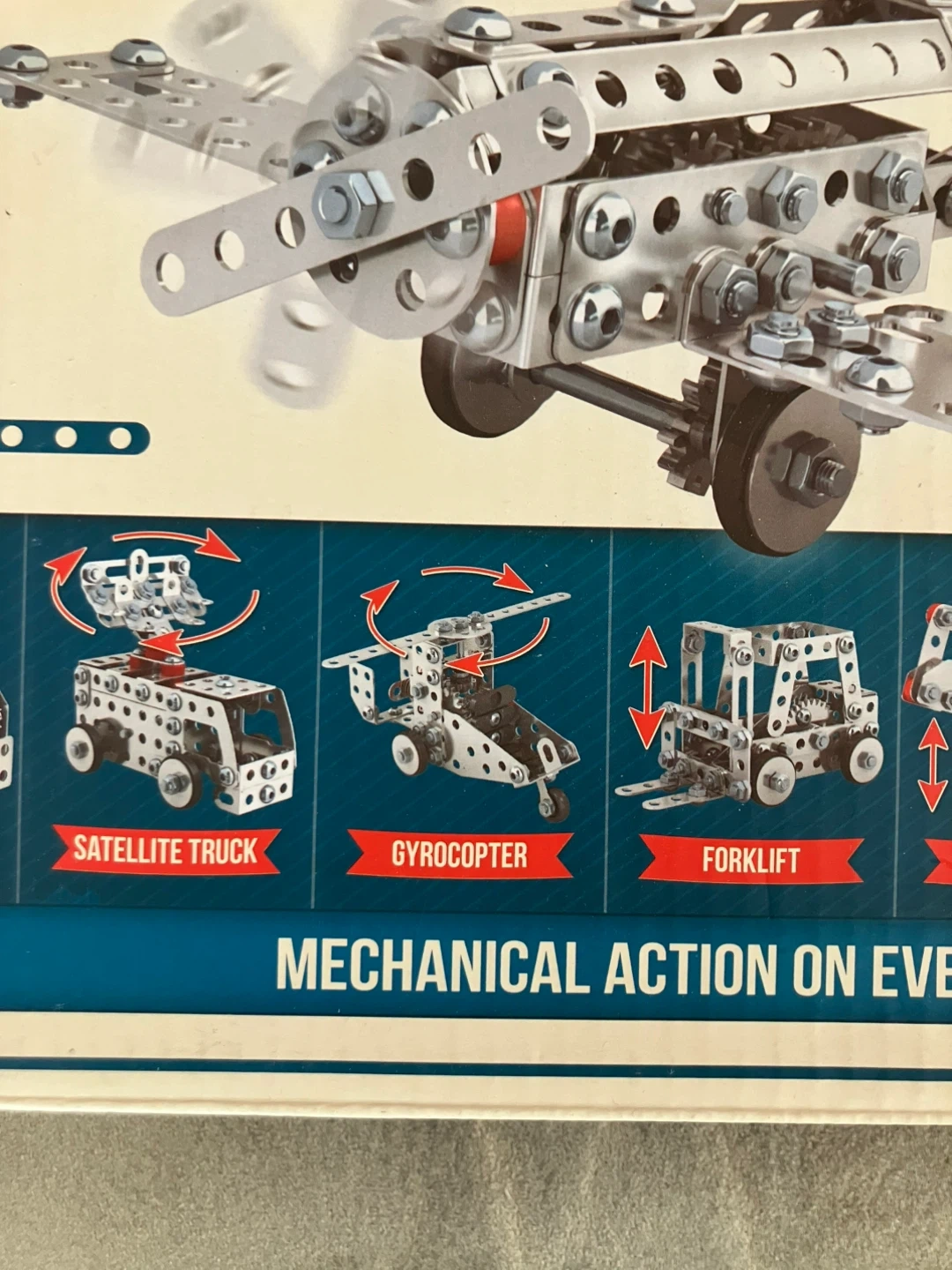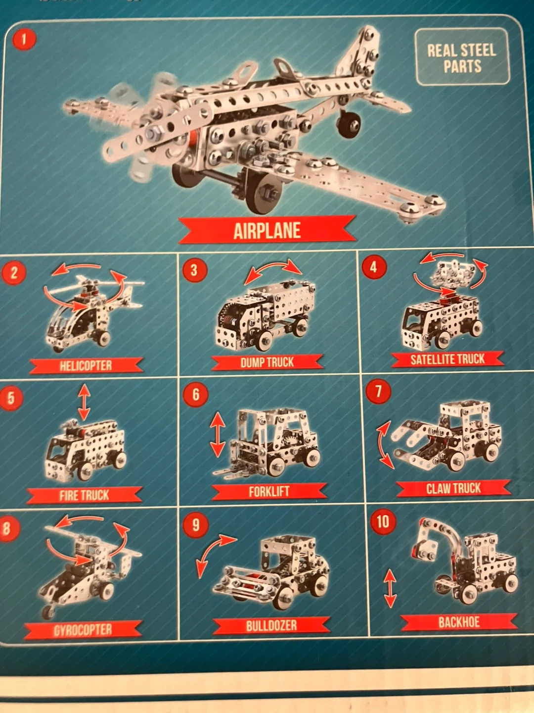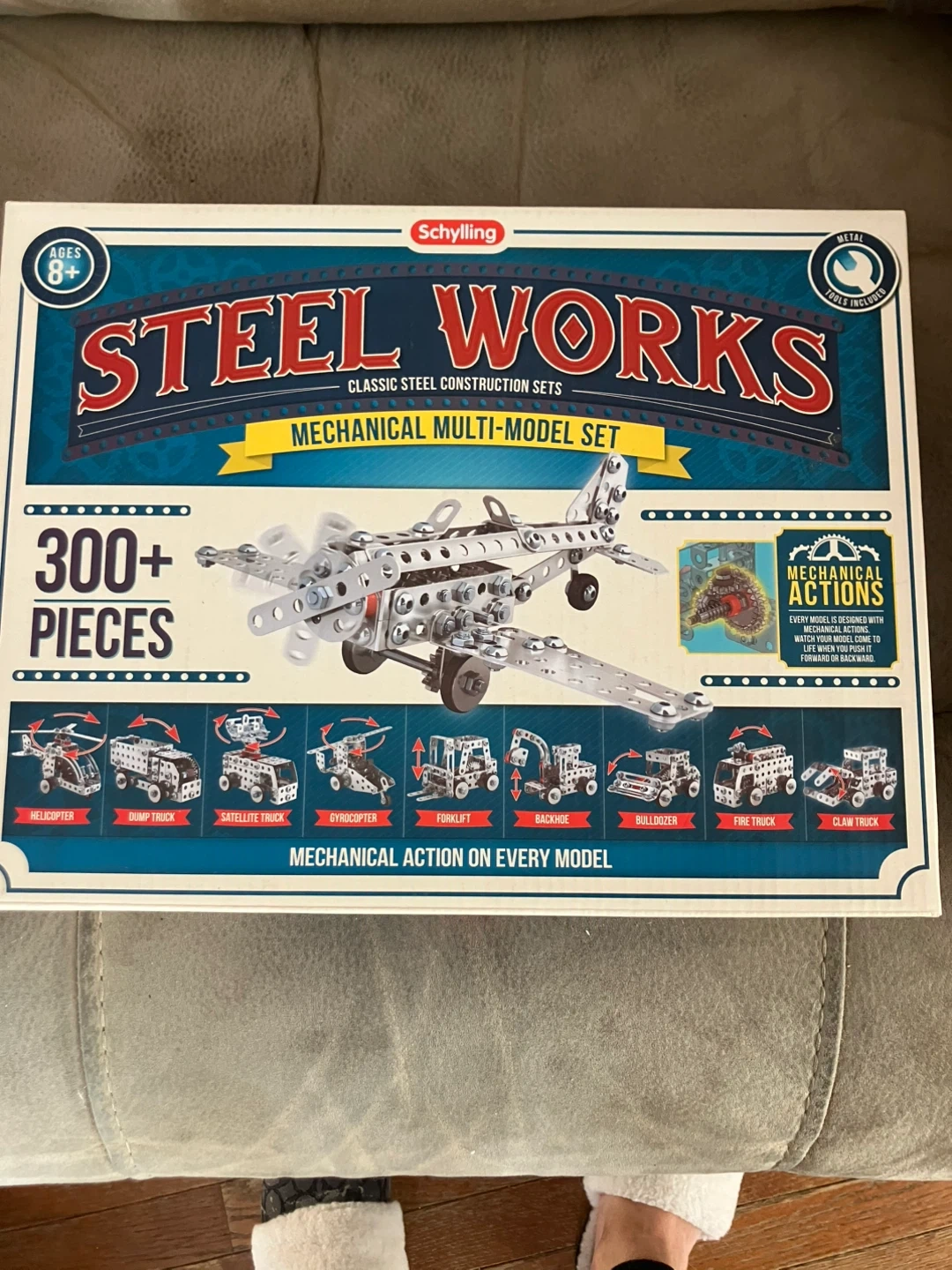 Schylling Steel Works Mechanical Multi-Model Set. It’s a classic steel construction set with 300+ pieces, you can build multiple models like airplanes, helicopters, trucks, and more! All pieces can be used with any other Steel Works kits.