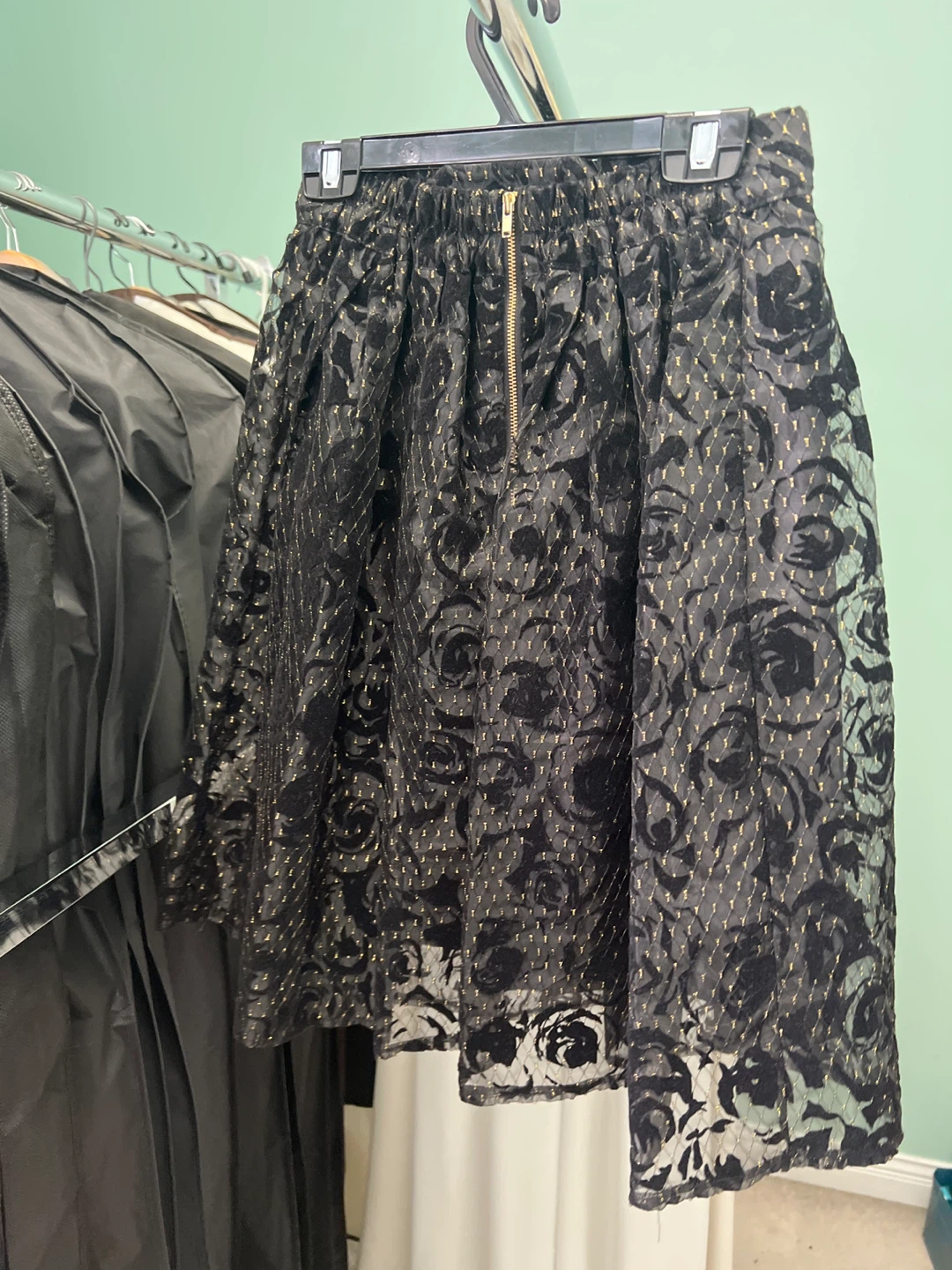 Here's a skirt with a lovely floral pattern! It's black with gold detailing, giving it a unique and stylish look. Perfect for adding a touch of elegance to your wardrobe