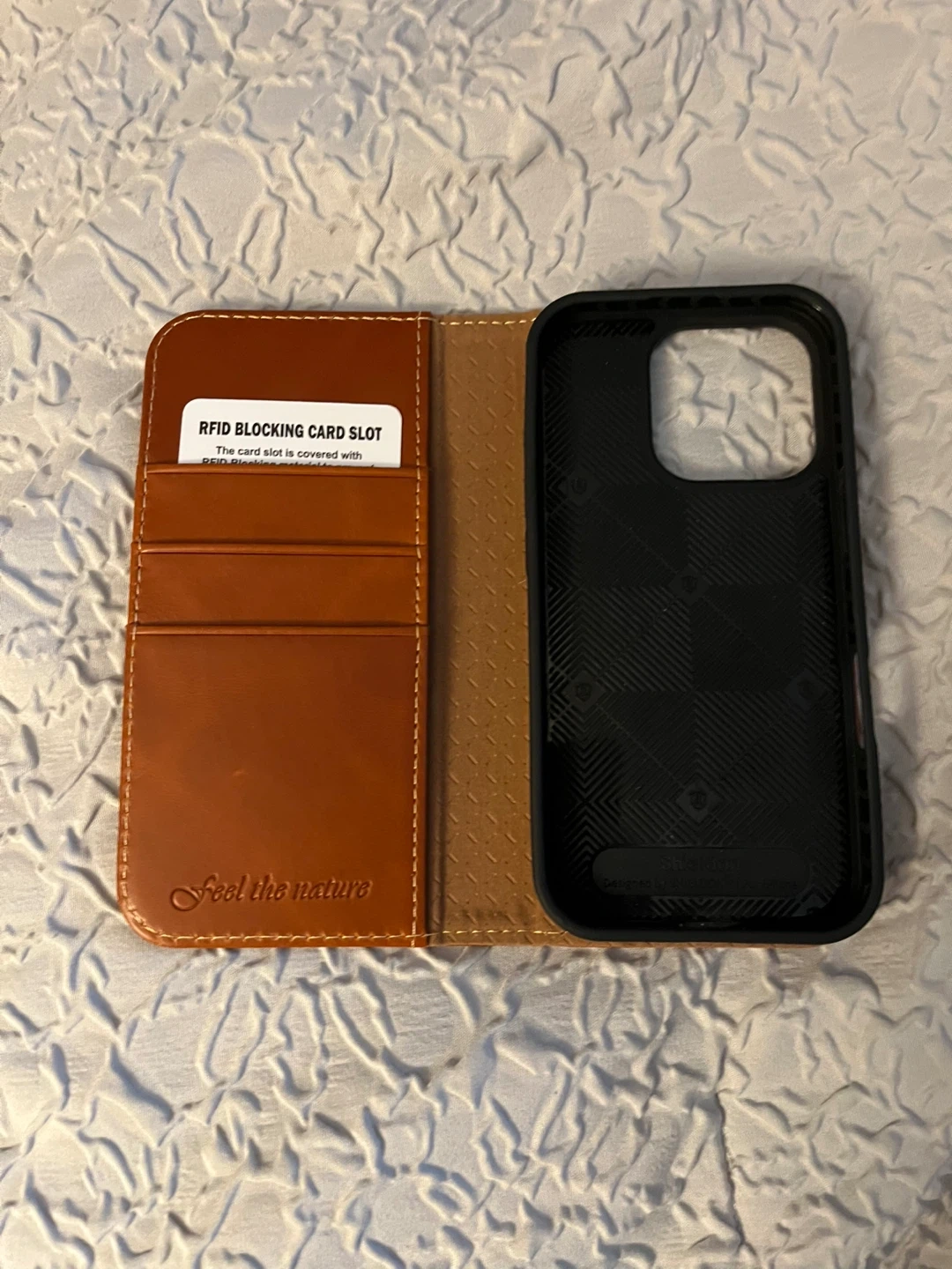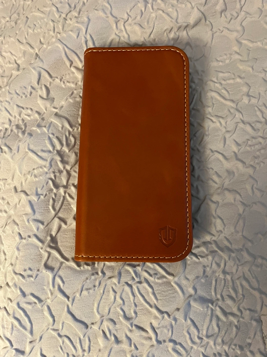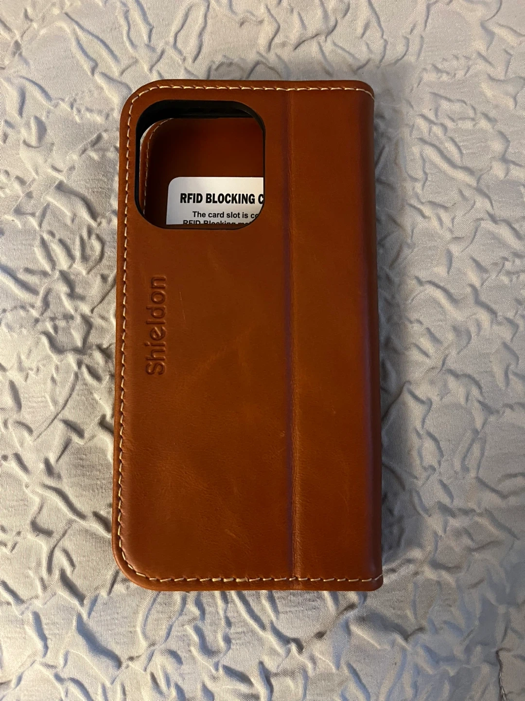 Selling a Shieldon leather wallet case for iPhone 15, 14, 13, features an RFID blocking card slot. The case is a beautiful brown color and has a nice, natural feel to it.