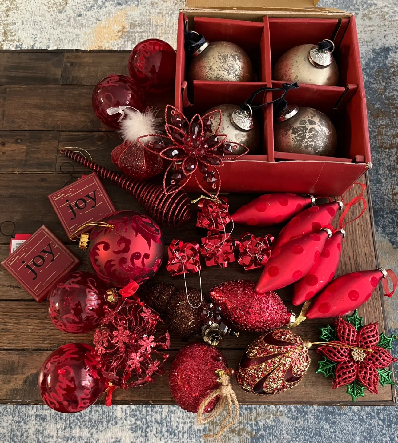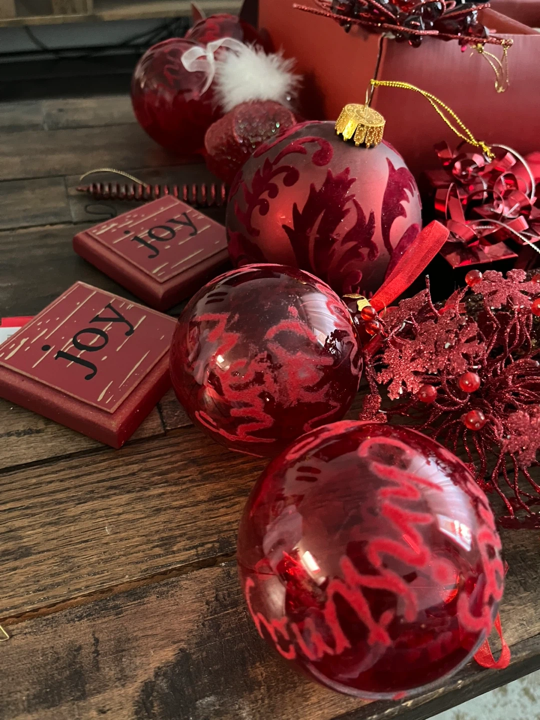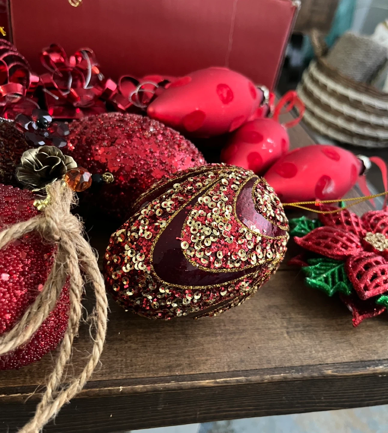 Selling a collection of red Christmas ornaments. There are various shapes and sizes, including round, teardrop, and flower shapes. Some are sparkly, and some have intricate designs.