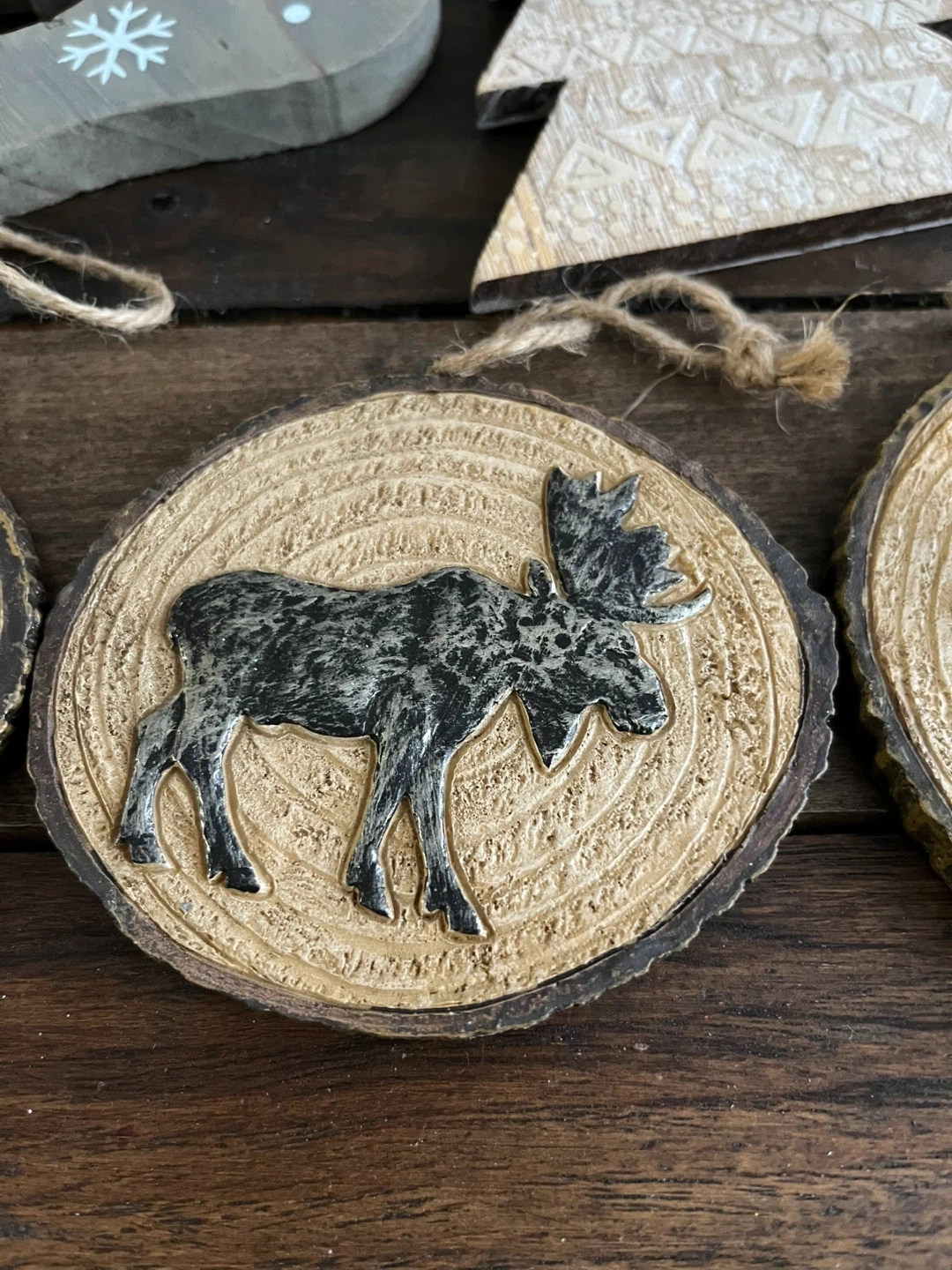 I'm selling a set of rustic Christmas ornaments. They appear to be made from wood slices with metal animal figures attached. They would be a cozy addition to your Christmas tree!