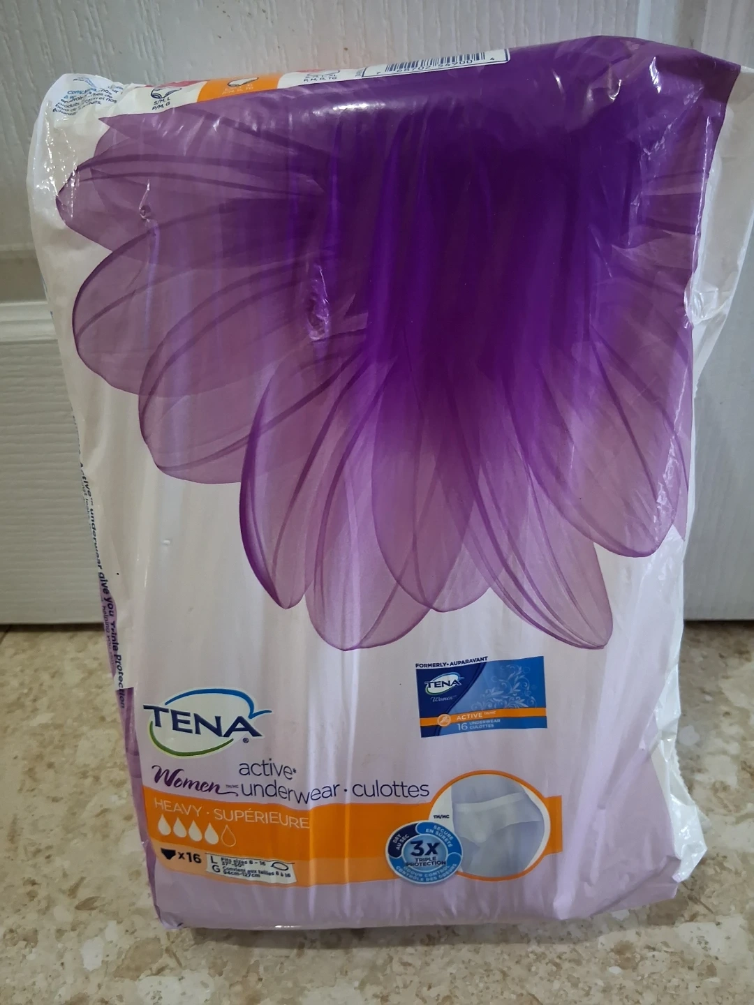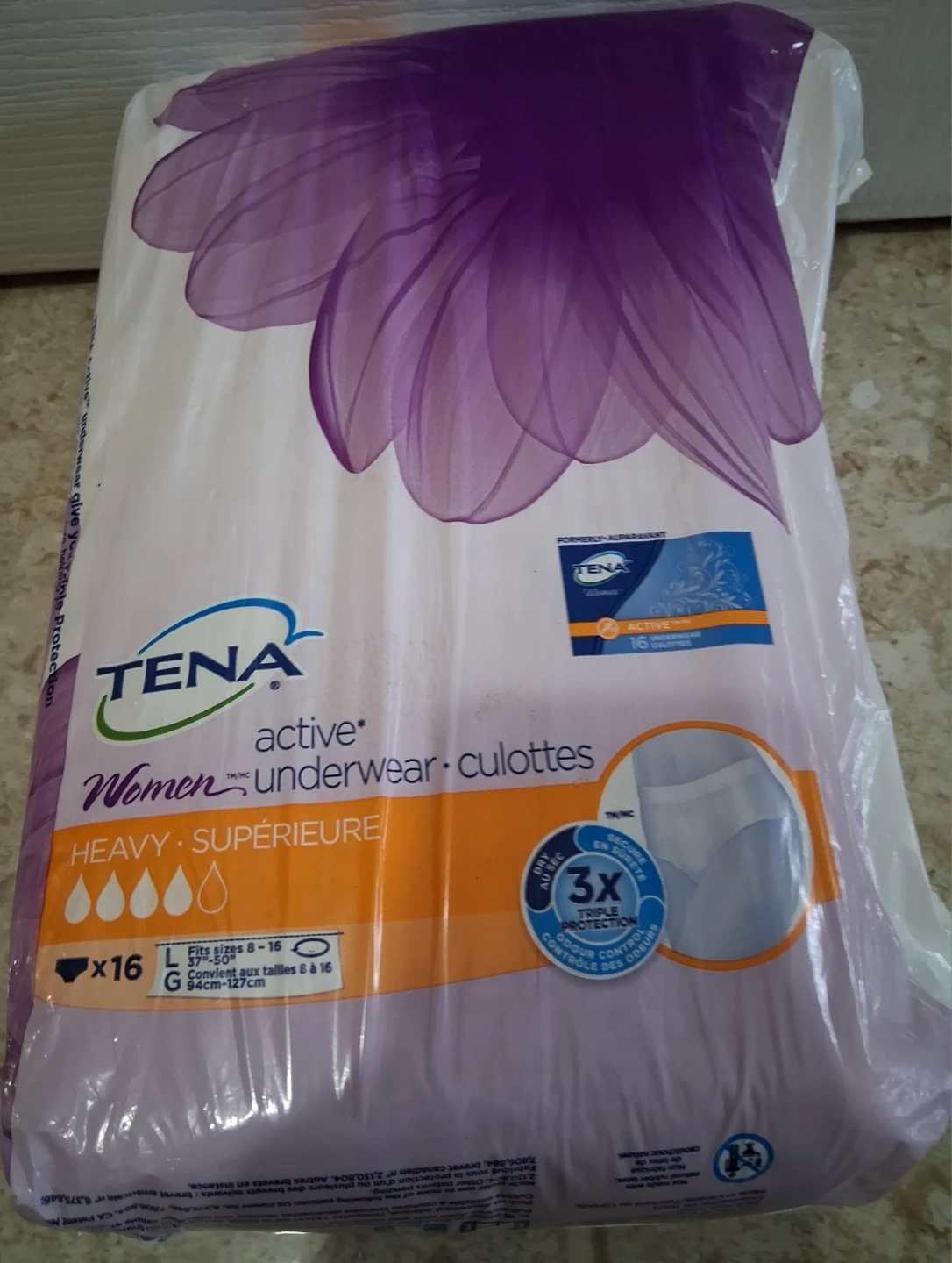 Selling a pack of TENA Active Women Underwear. They are size Large (fits sizes 8-16, 94cm-127cm). The pack includes 16 underwear. Offers triple protection for security and comfort!