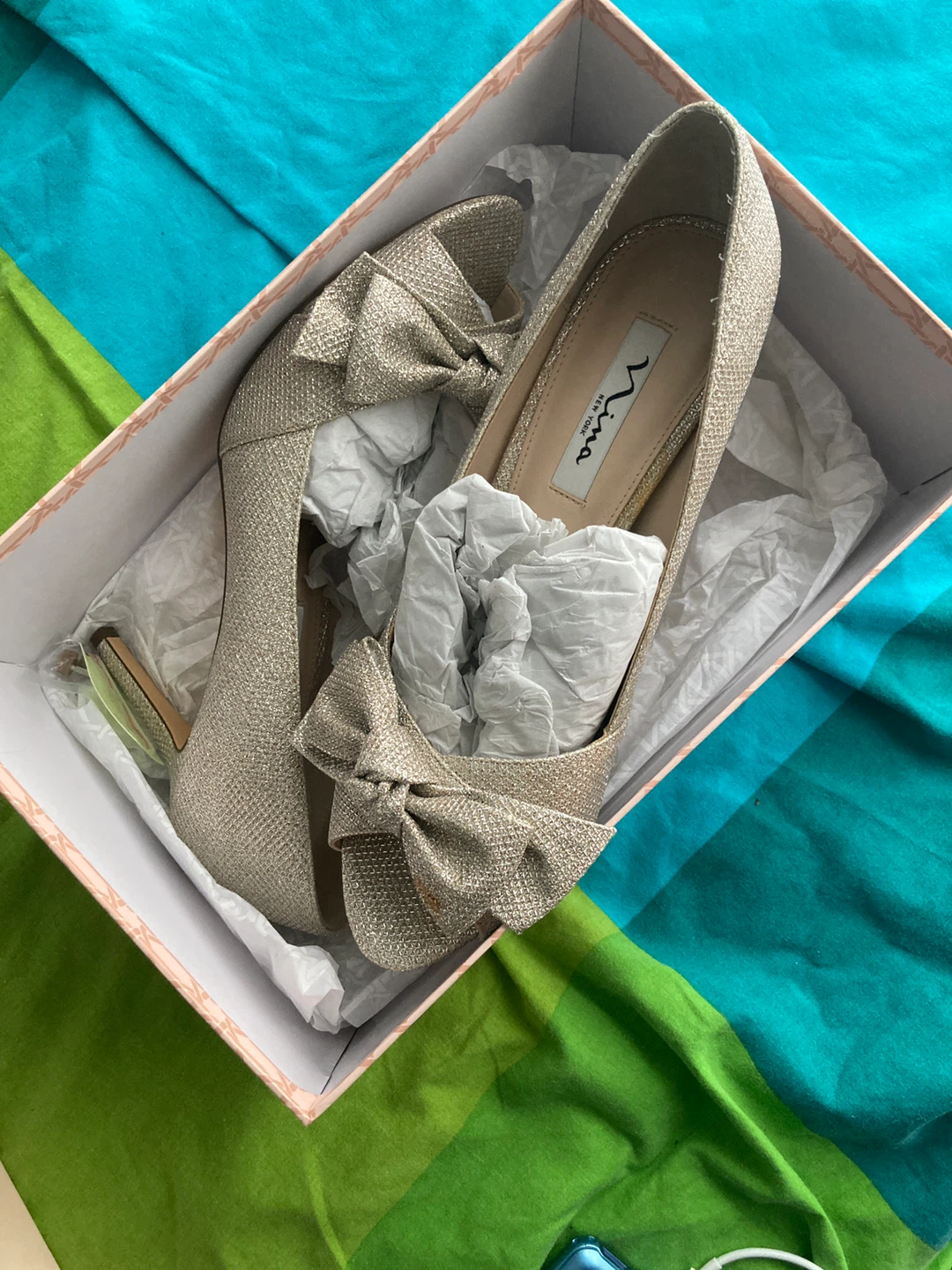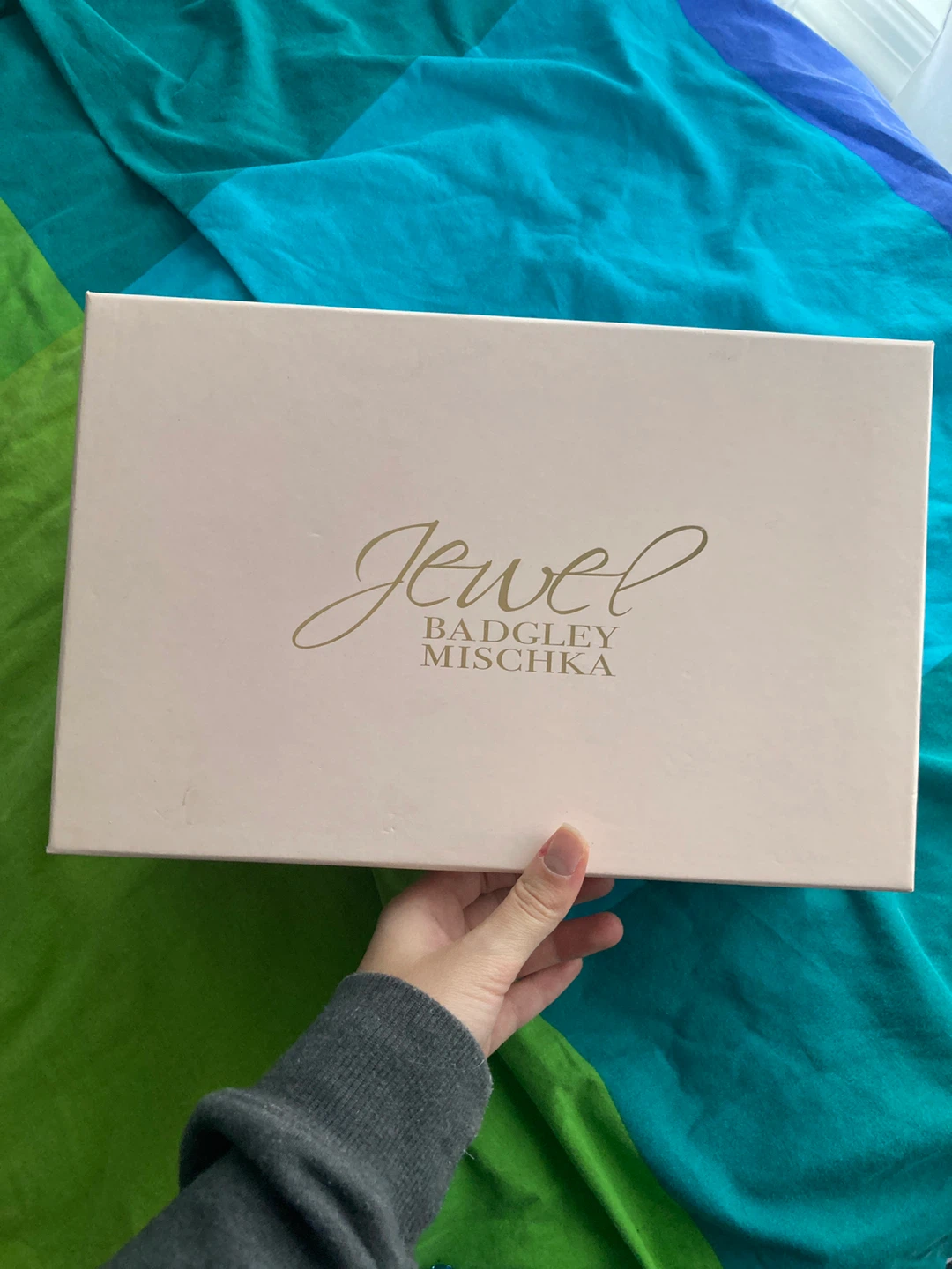 These Jewel Badgley Mischka heels are a beautiful gold colour and come in their original box! They are a size 7.5. Perfect for a special occasion!