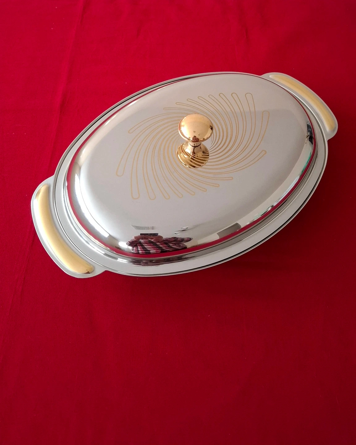 Italian Giorinox 18/10 stainless steel covered serving dish. Features 24kt gold-plated handles and a decorative swirl design. Includes original certificate of guarantee. This is elegant vintage Italian tableware.