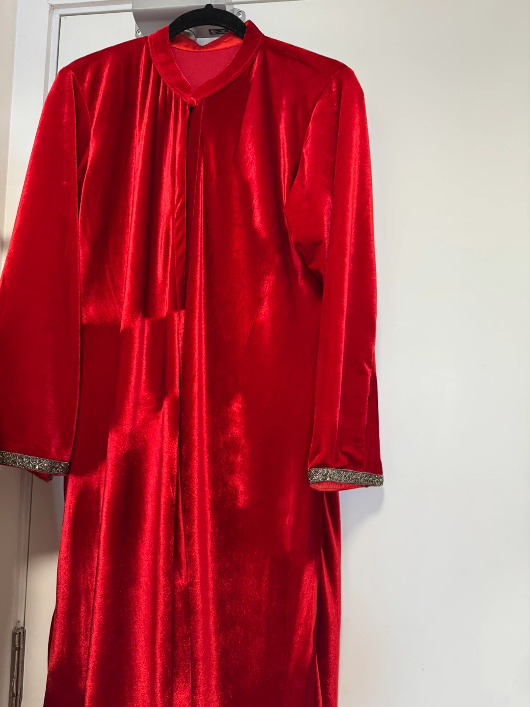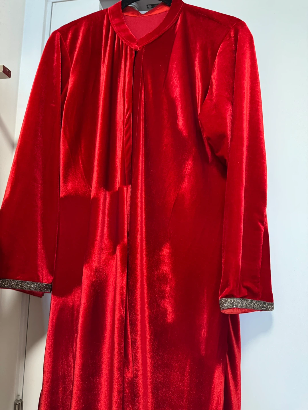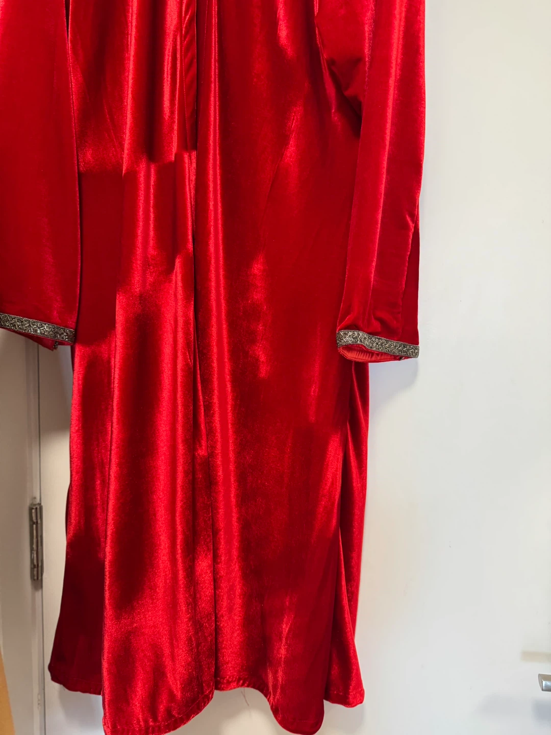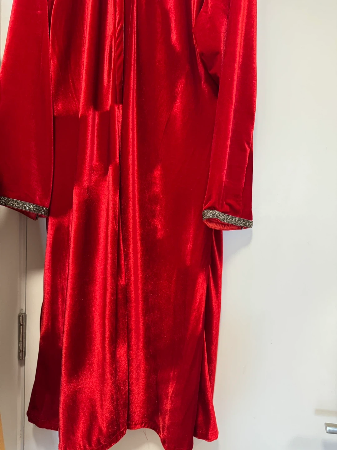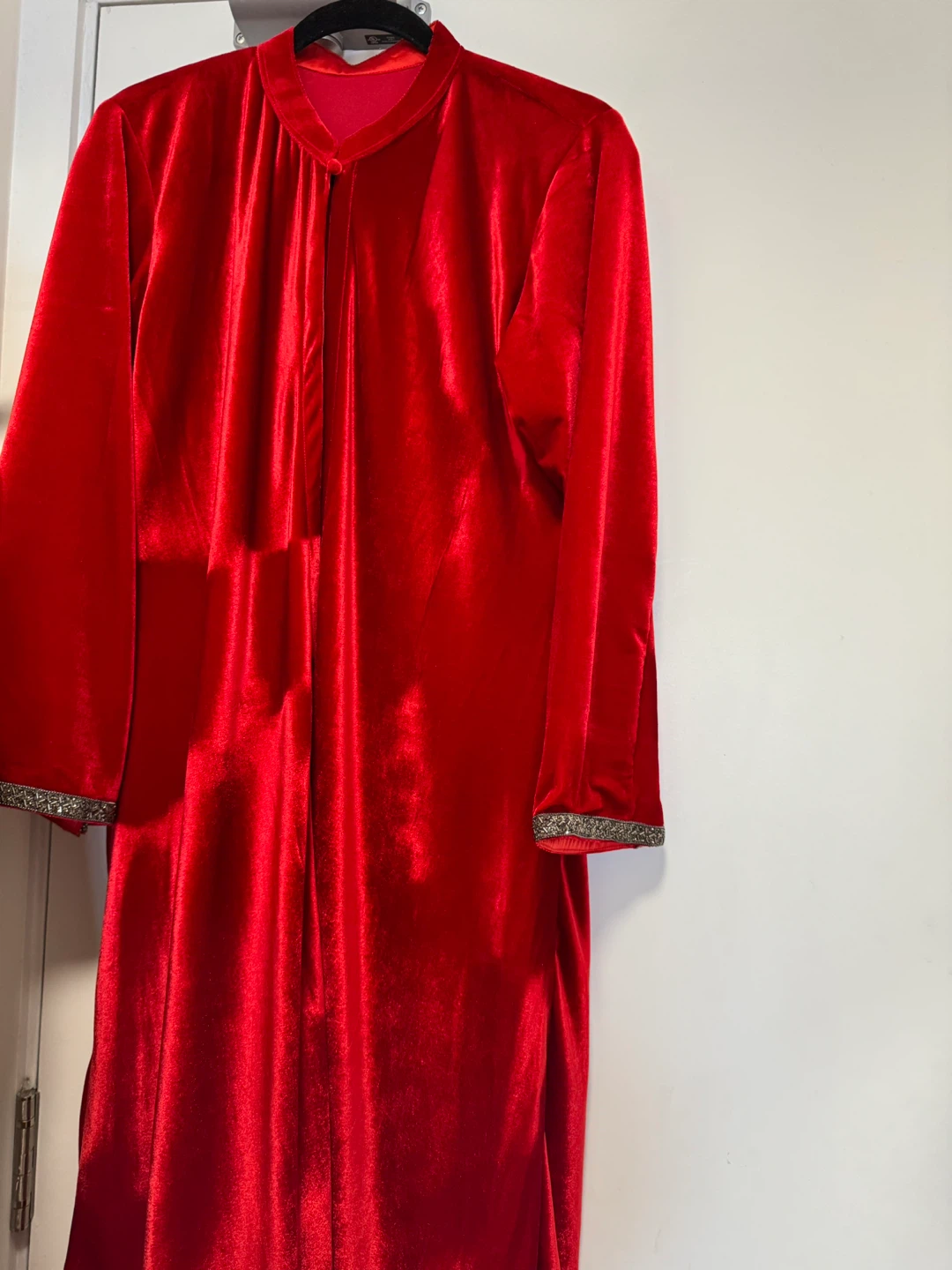 Here's a red velvet abaya with decorative trim on the sleeves! It's in great condition and ready for a new home. The material is soft and luxurious, perfect for lounging around the house.