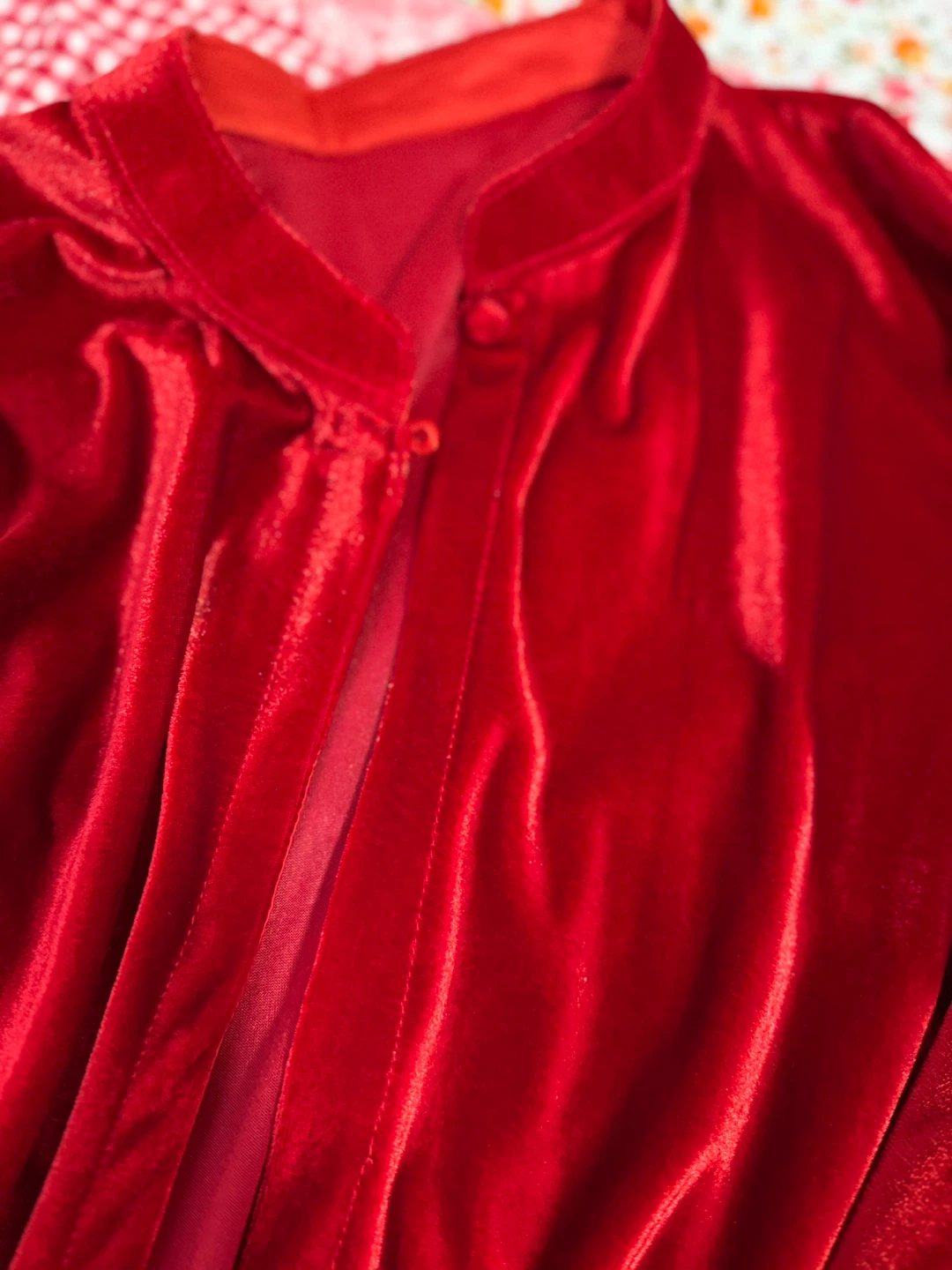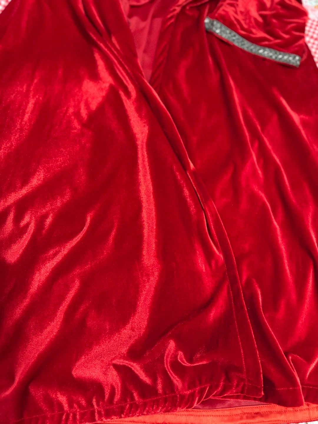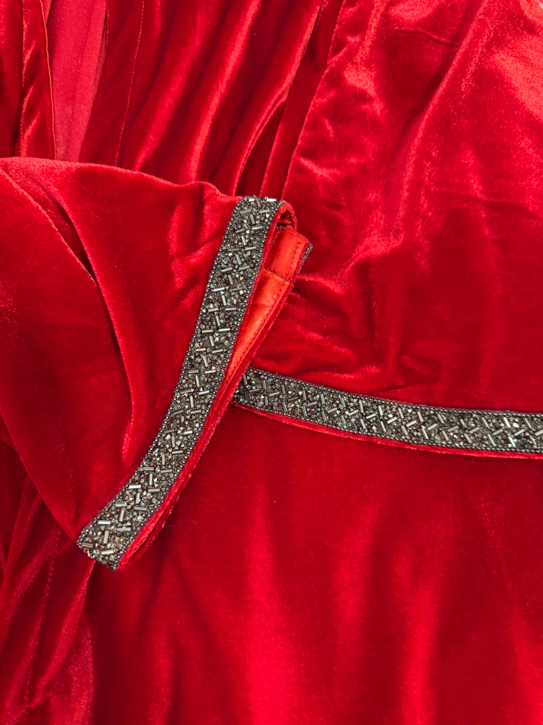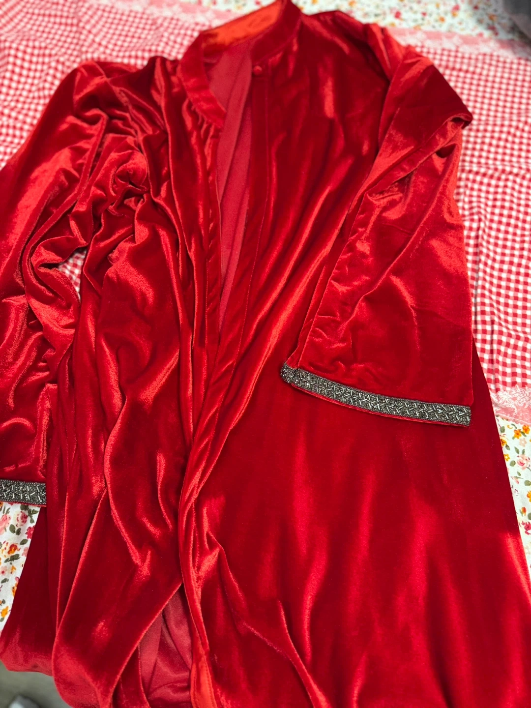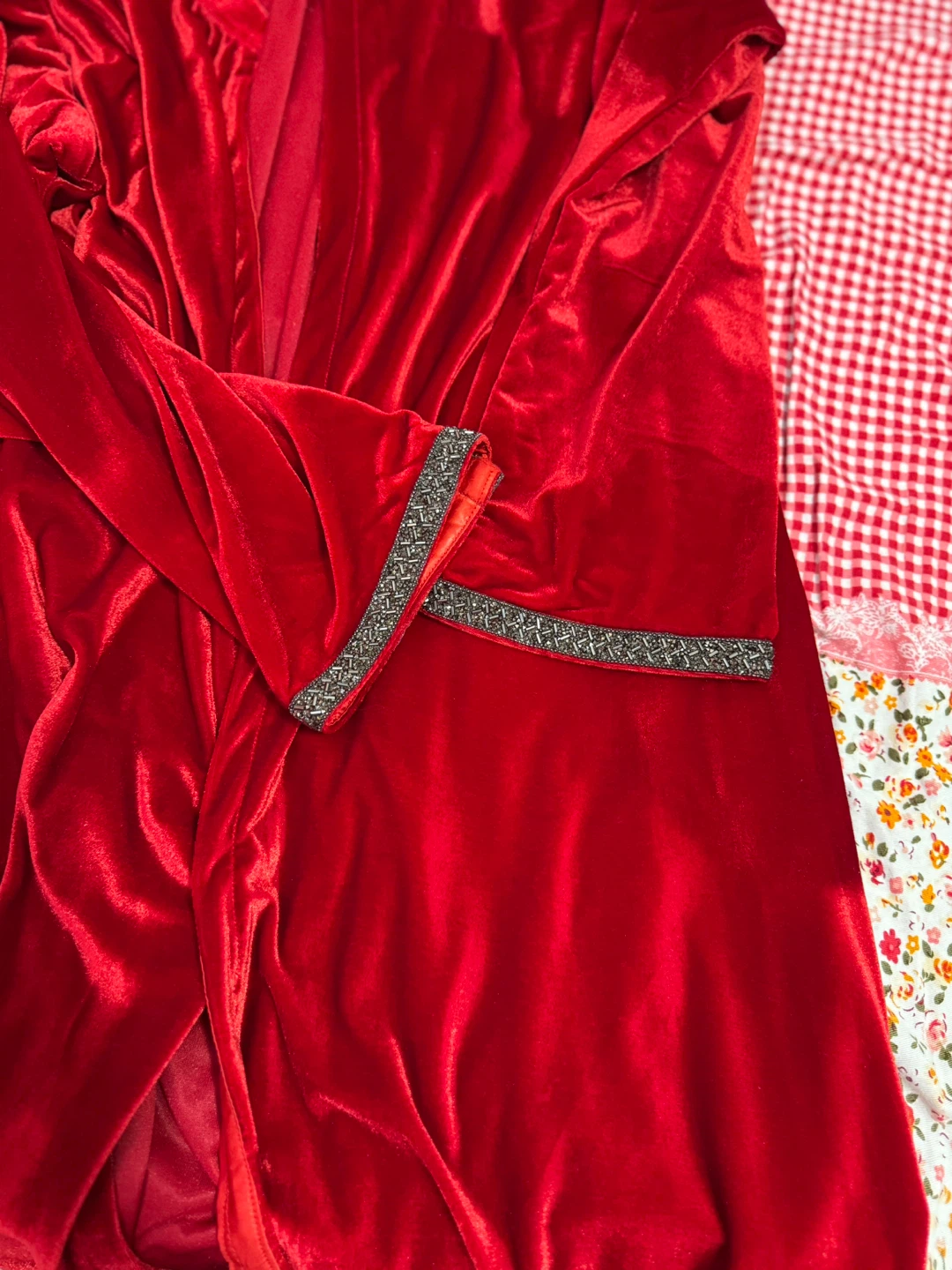 Here's a red velvet abaya with decorative trim on the sleeves! It's in great condition and ready for a new home. The material is soft and luxurious, perfect for lounging around the house.