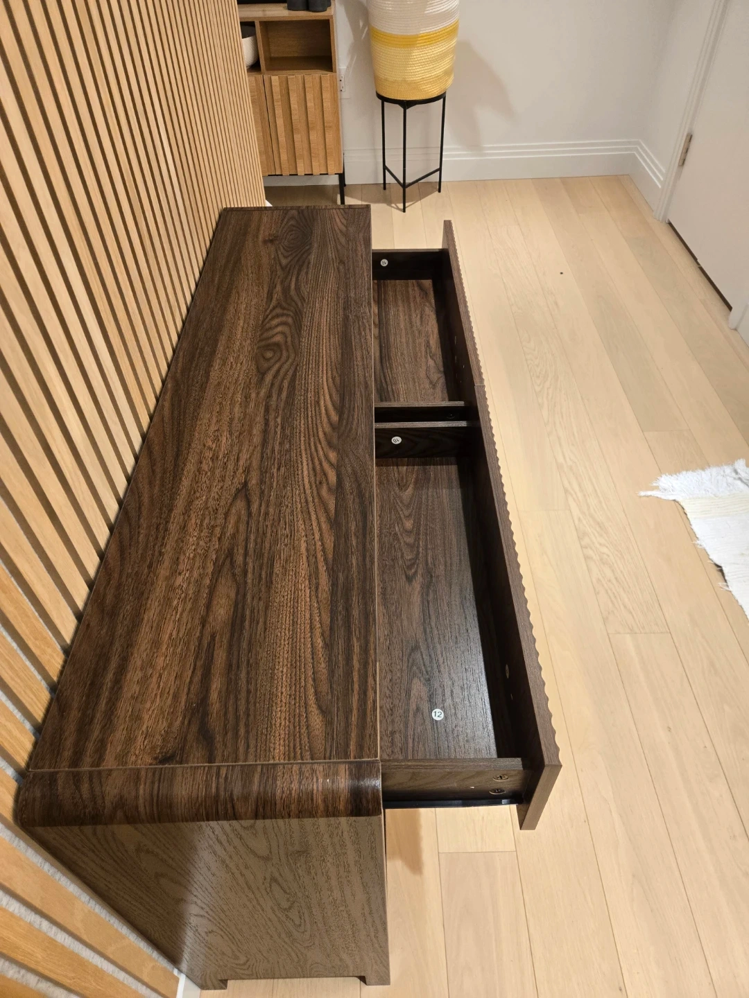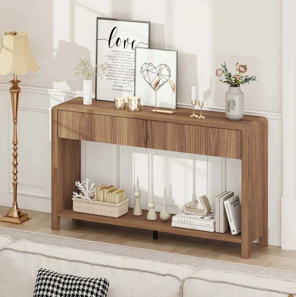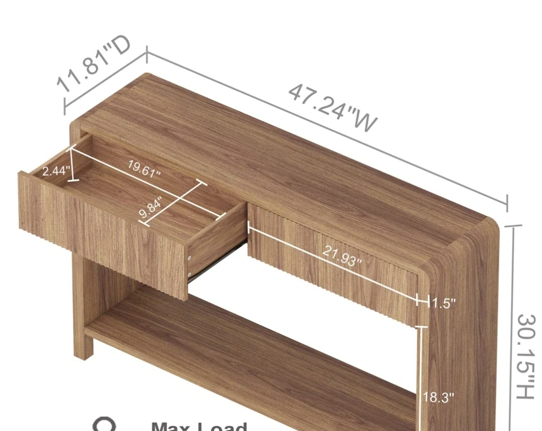 This elegantly designed console table combines minimalist aesthetics with practical functionality. Featuring softly rounded corners for safety, two spacious drawers with a unique waveform panel for stylish storage, and a sturdy structure that supports heavy loads, it is both a statement piece and a reliable storage solution. Whether placed in the entryway, behind a sofa, or in a hallway, this versatile table offers ample space to display décor, organize daily essentials, and enhance your home with its refined charm.