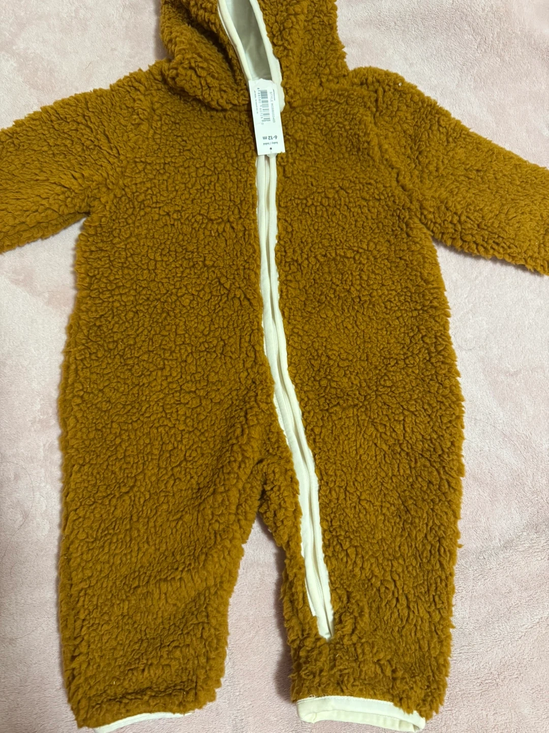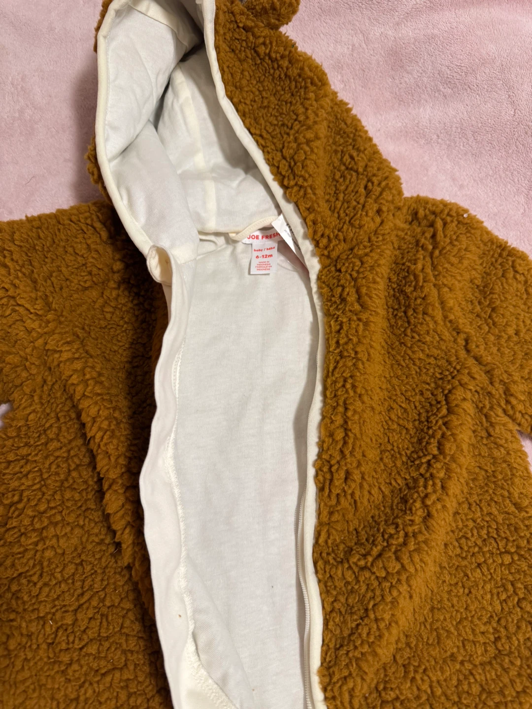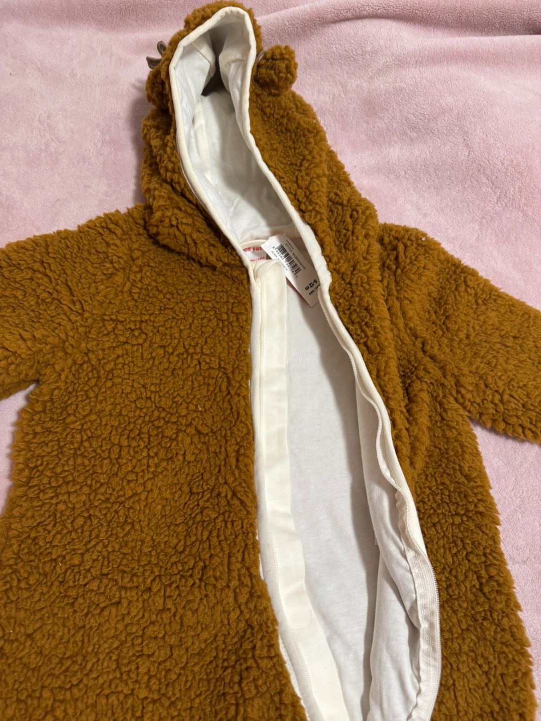 Here's a brand new Joe Fresh baby bunting, perfect for keeping your little one cozy! It's a size 6-12 months and still has the tags on it. The colour is a lovely brown, and it's made of a soft, fuzzy material. Great for autumn and winter!