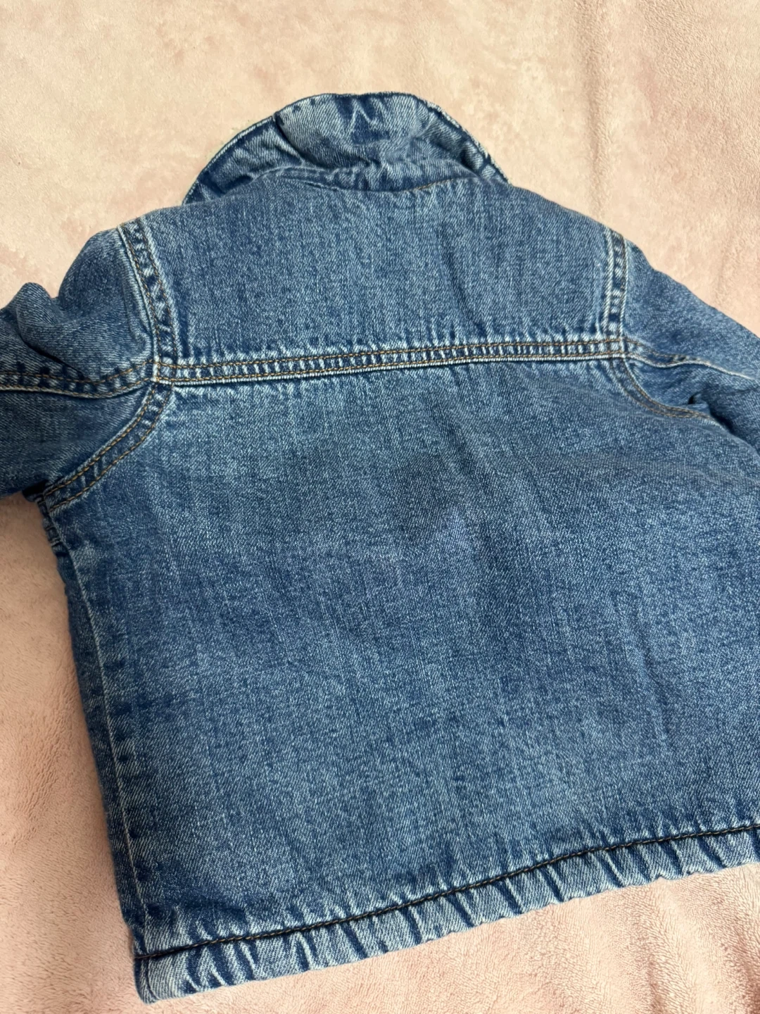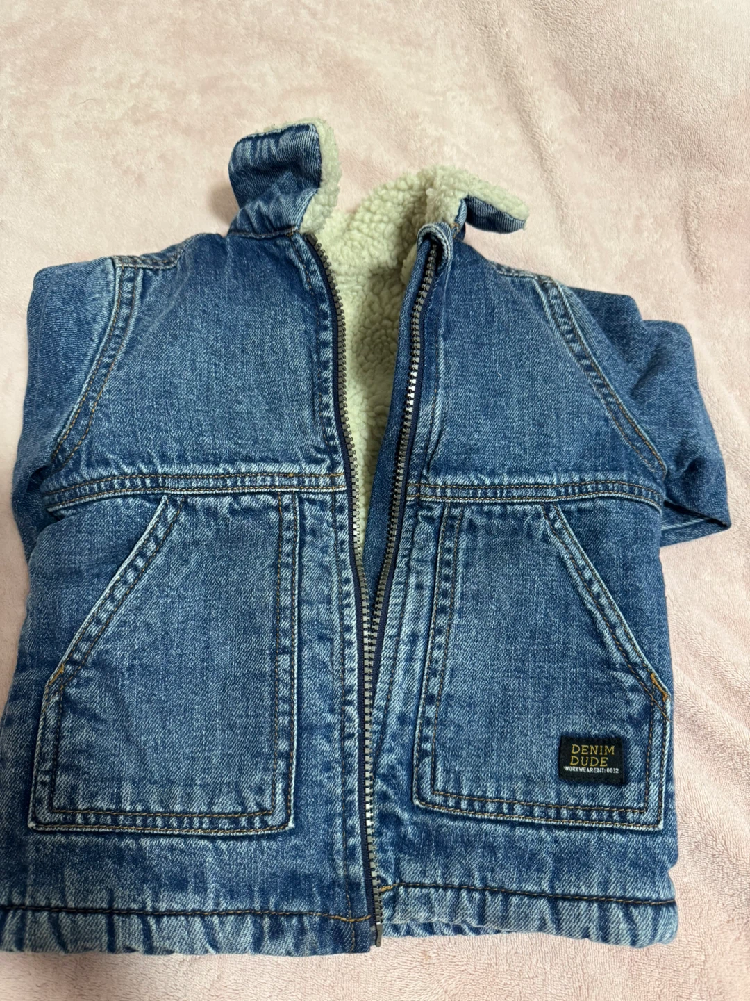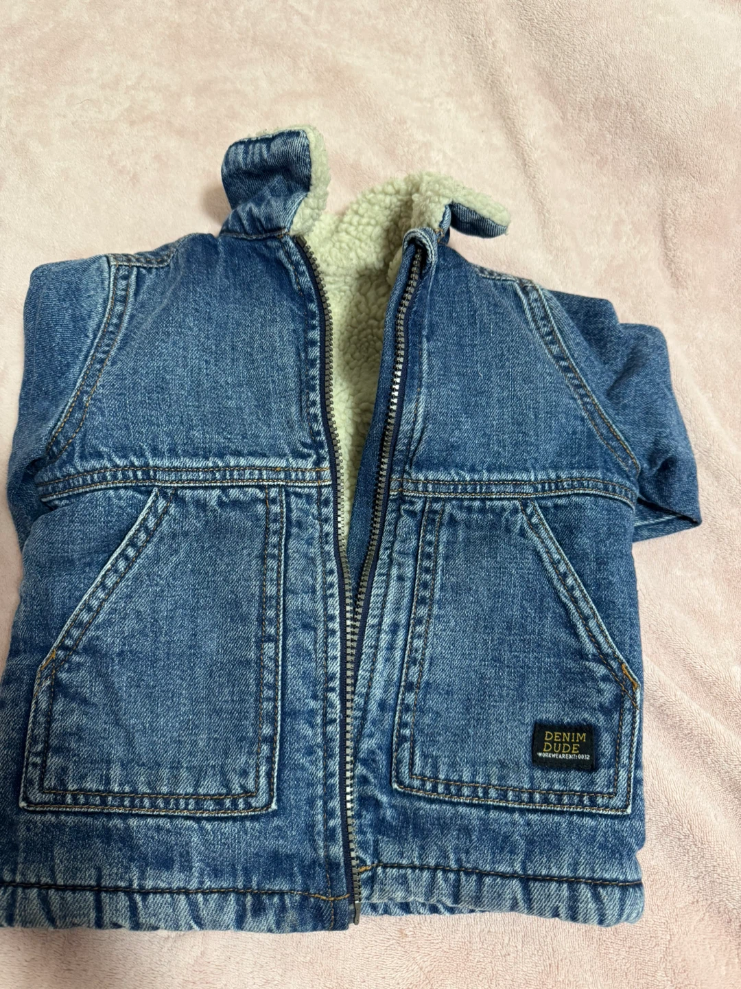 This is a cute denim jacket for kids from Denim Dude! It features a sherpa lining to keep your little one warm and cozy. It has a zipper closure and pockets on the front. The jacket is in great condition and ready for a new owner!