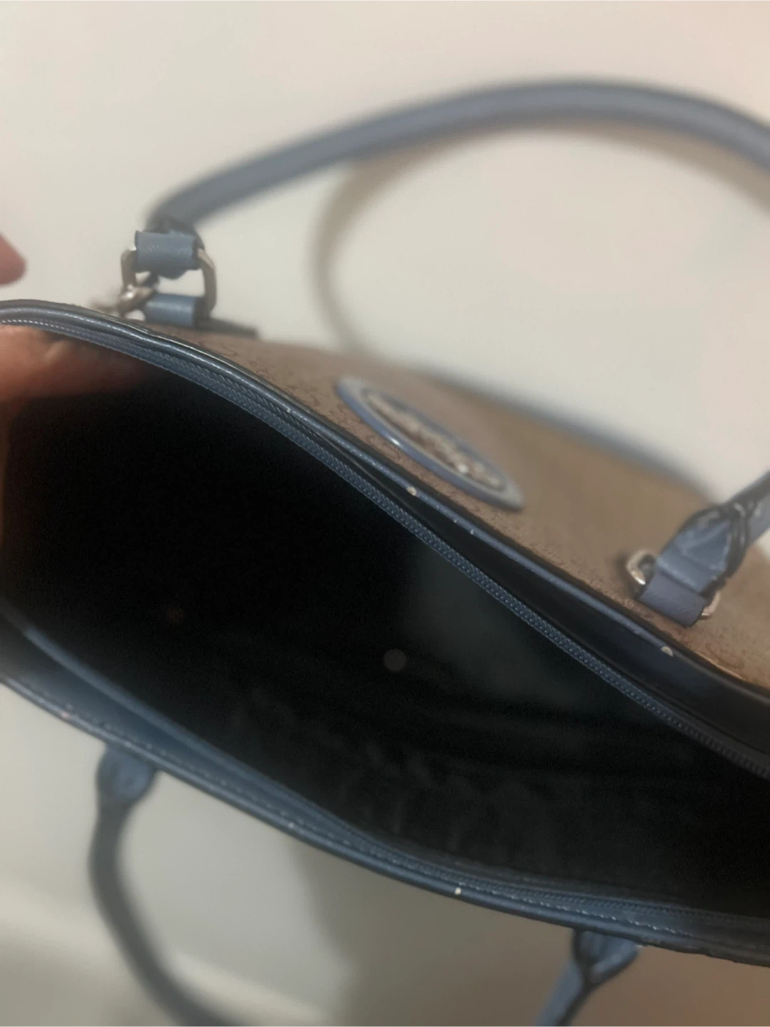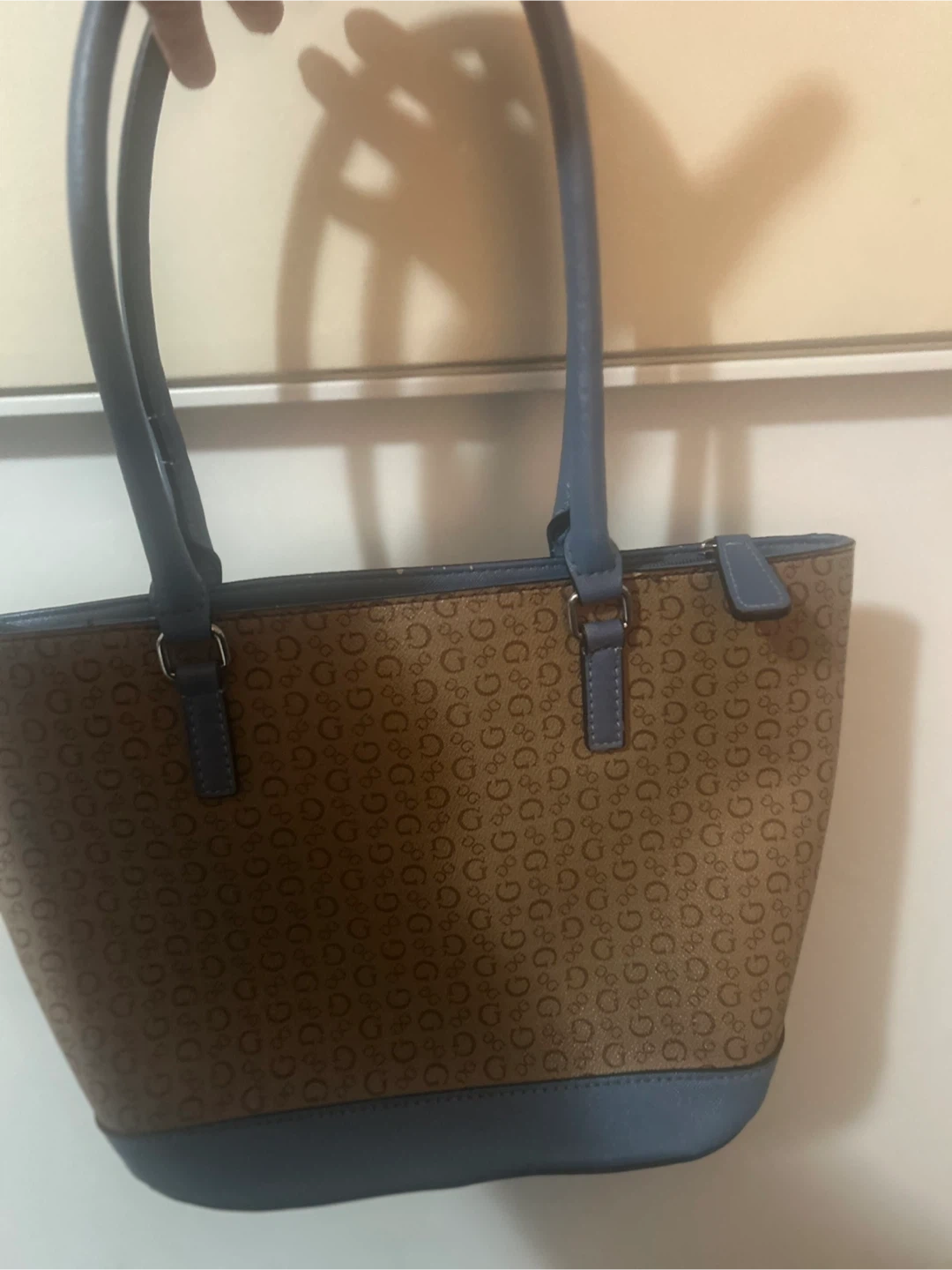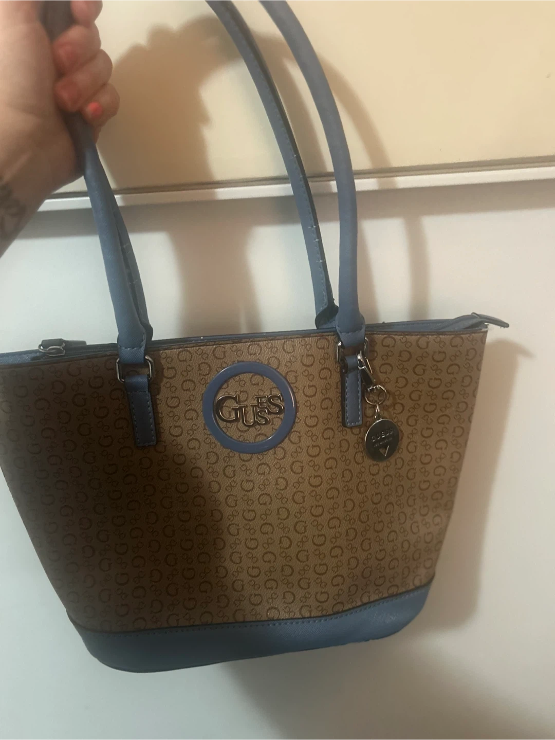 Here's a Guess tote bag with a brown and blue colour scheme. It features the Guess logo pattern all over the bag. It's in great condition and perfect for everyday use!