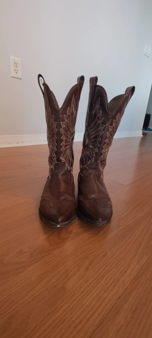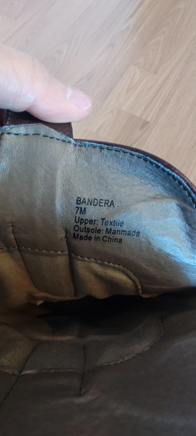 Selling a pair of Bandera cowboy boots in a women's size 7M. They're a stylish brown colour and feature decorative stitching. The upper is textile and the outsole is manmade.
