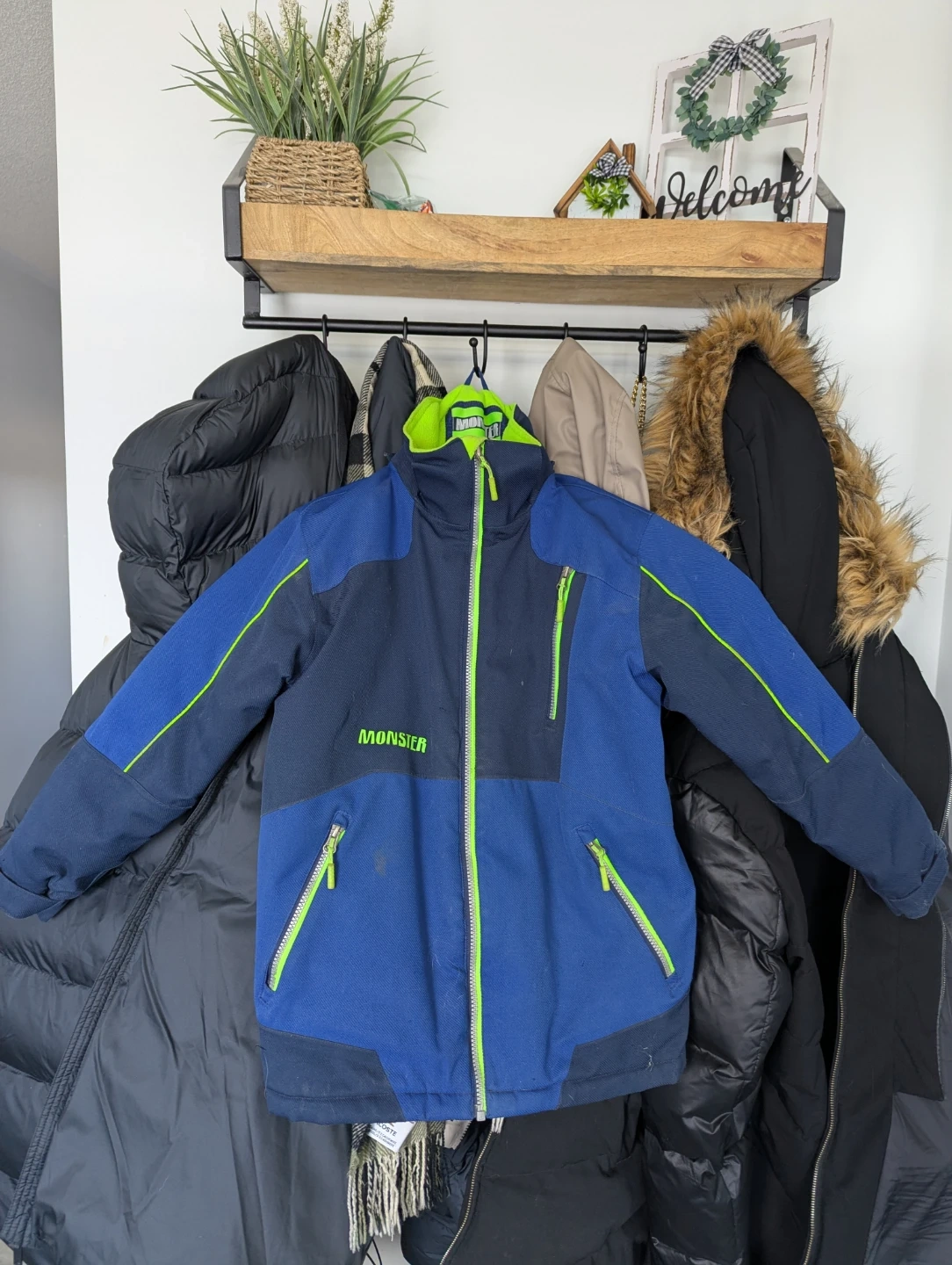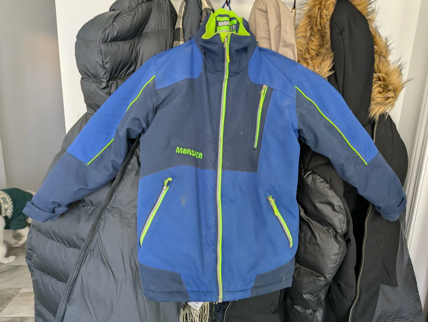 Selling a Monster brand kids jacket. It features a blue colourblock design with neon green zippers and accents. Perfect for keeping your little one warm and stylish!