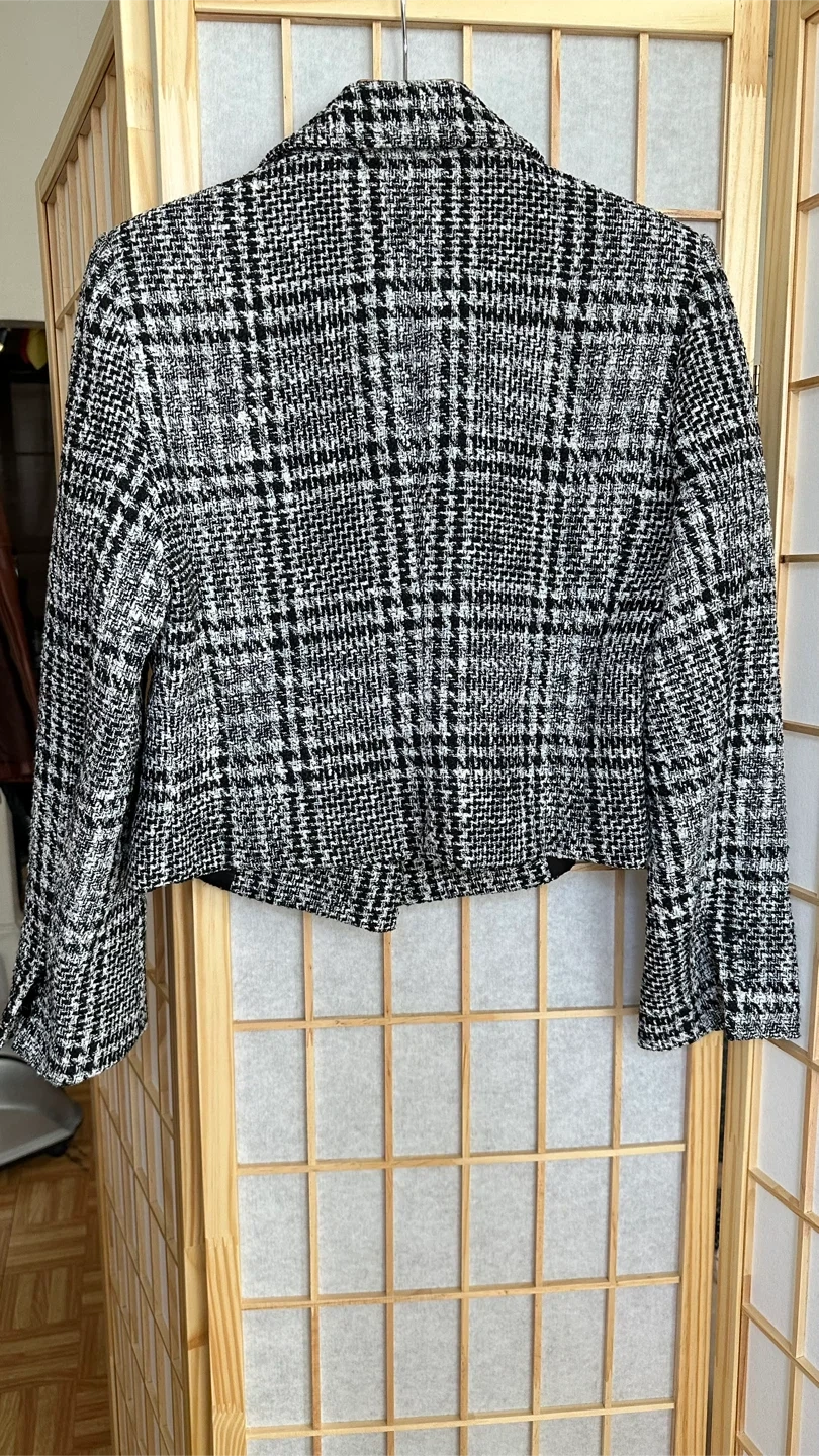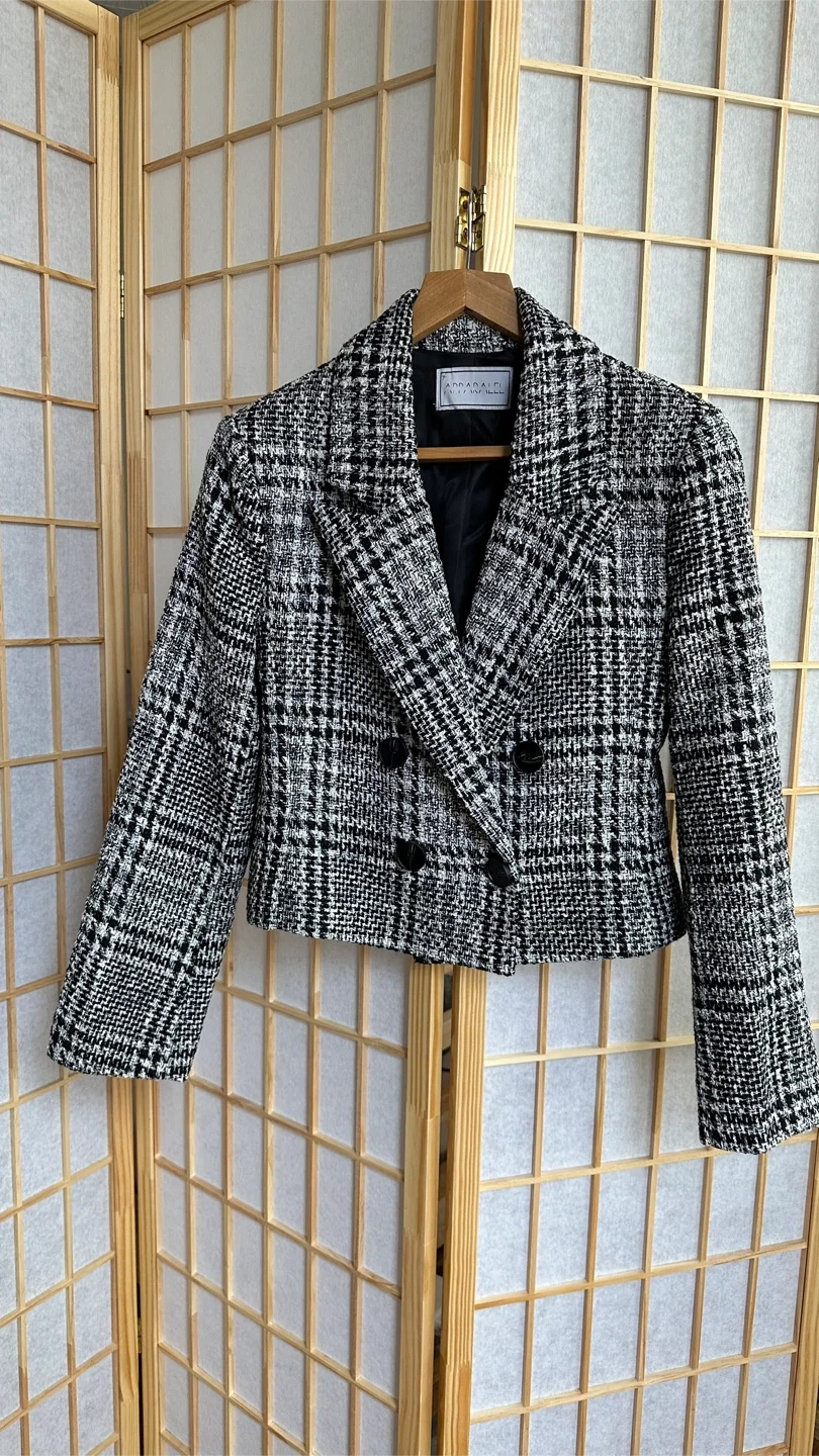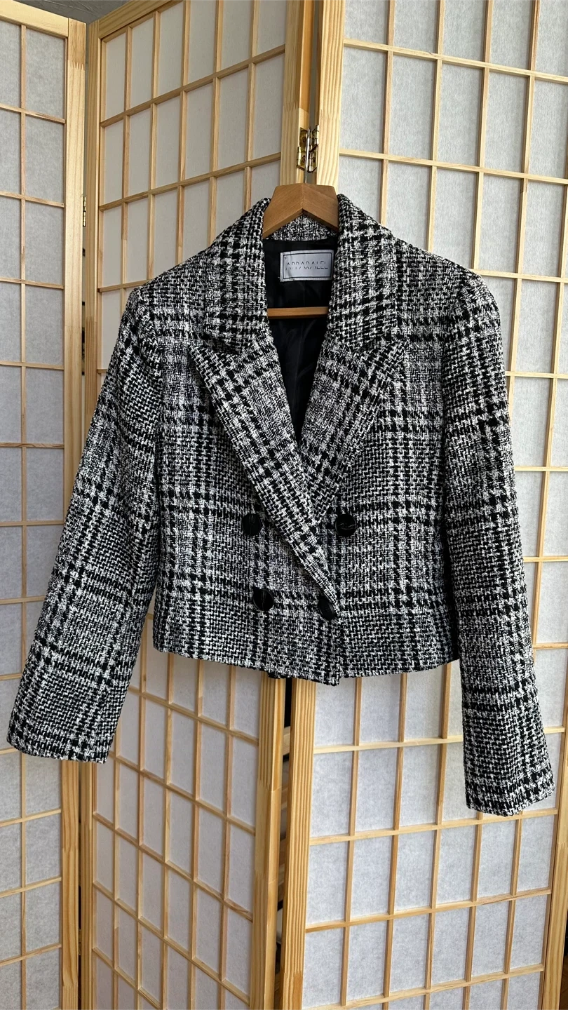 Selling a cute cropped blazer! It features a black and white plaid pattern and a double-breasted design.