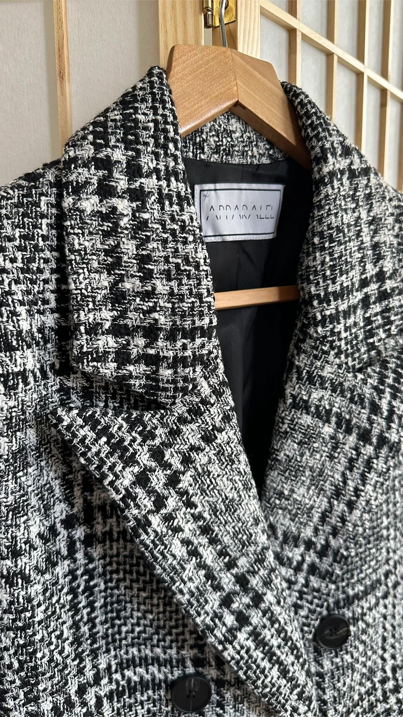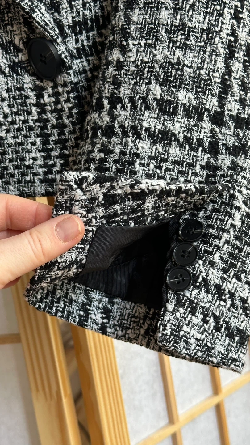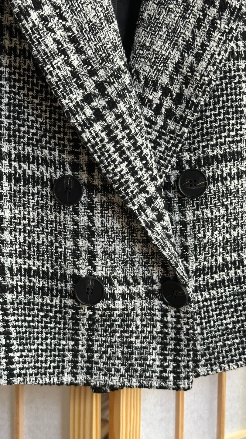 Selling a cute cropped blazer! It features a black and white plaid pattern and a double-breasted design.
