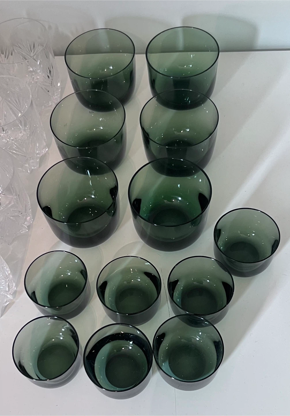 Set of mid-century modern drinking glasses (rock glasses and shot glasses). They're in excellent condition and would be perfect for everyday use or for special occasions. The glasses have a nice, deep green hue. 7 rocks glasses & 7 shot glasses