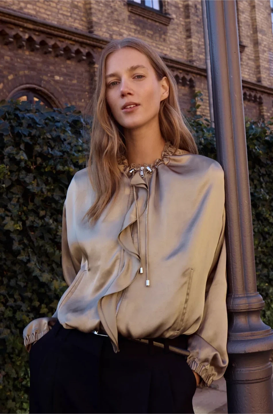 This is a Zara satin effect bomber jacket. It's a beautiful neutral colour and would pair well with many outfits. It's in great condition and ready for a new owner!