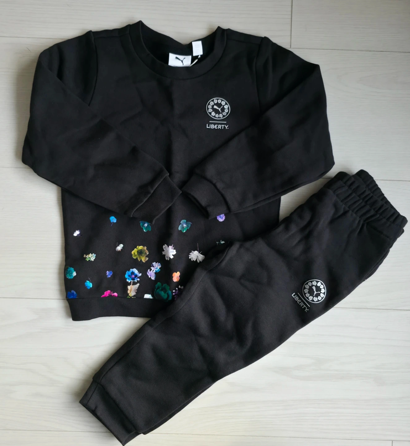 New, never worn, tag still on it. Puma Liberty tracksuit for kids in size 4T. It's a stylish black set with a floral design. Perfect for your little one!