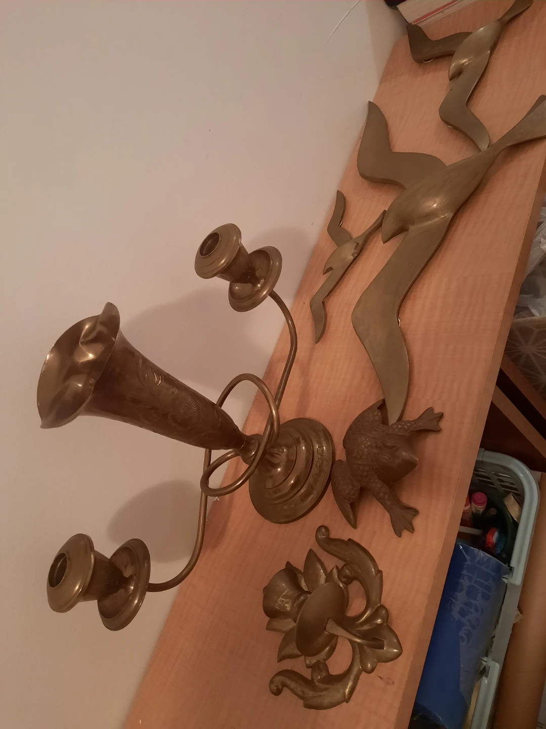 Selling a collection of Vintage Brass items! There's a candlestick holder with a floral design on the horn, as well as some unique wall/Desk Decor Pieces. Sizes in Photos. They're in great condition and ready to brighten up your space.