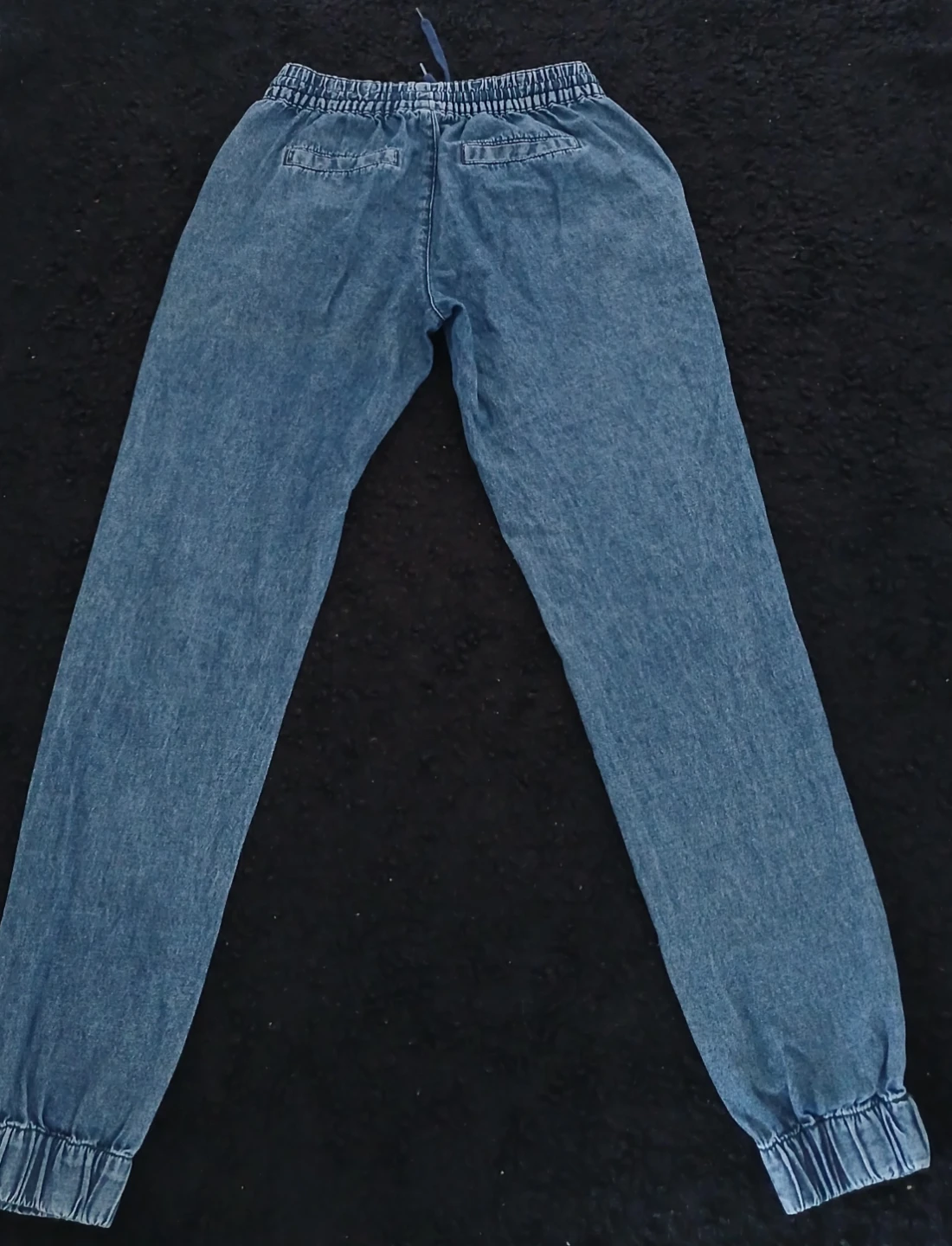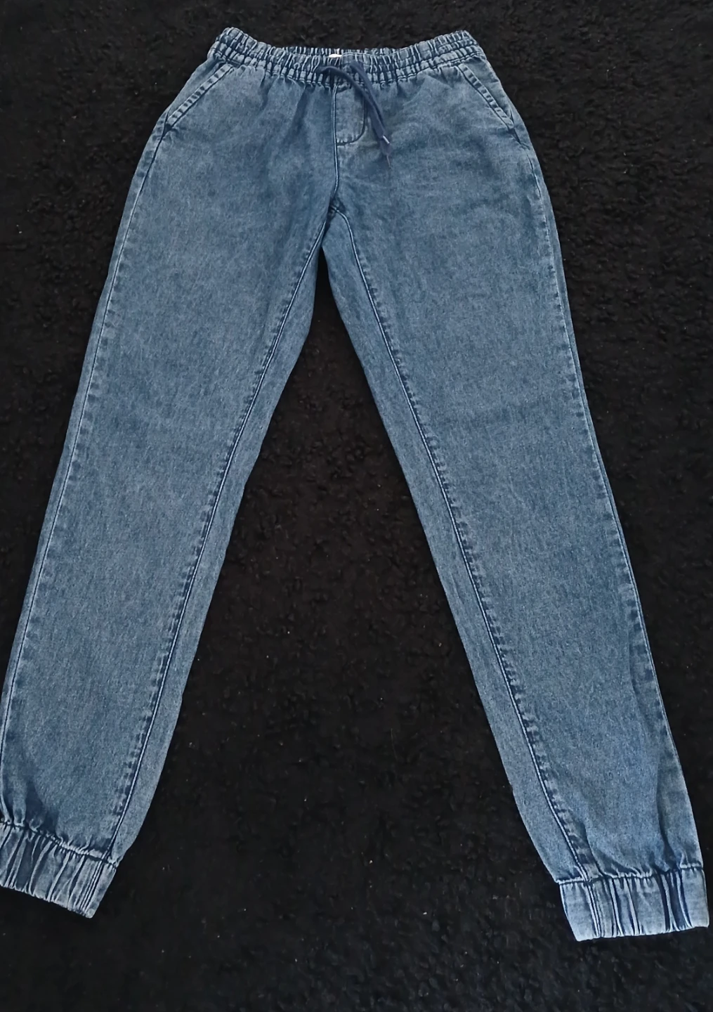 These are denim jogger pants. They're in great condition and ready for a new owner! They are a light wash denim colour and would look great with any outfit