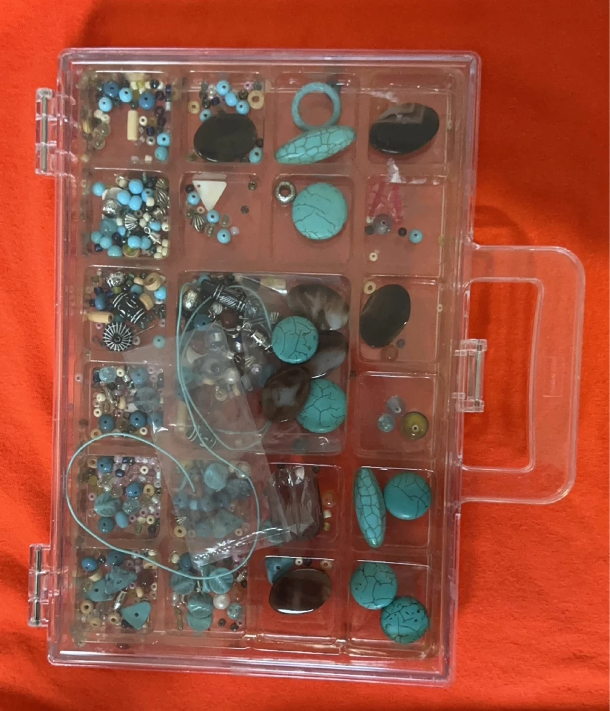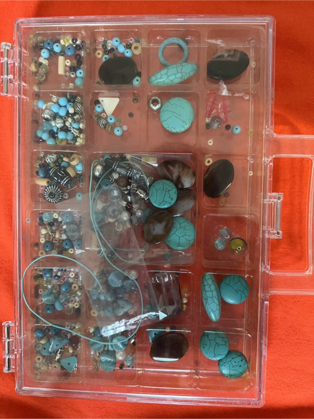 A collection of beads and jewelry making supplies in a clear storage container! Great for your next crafting project