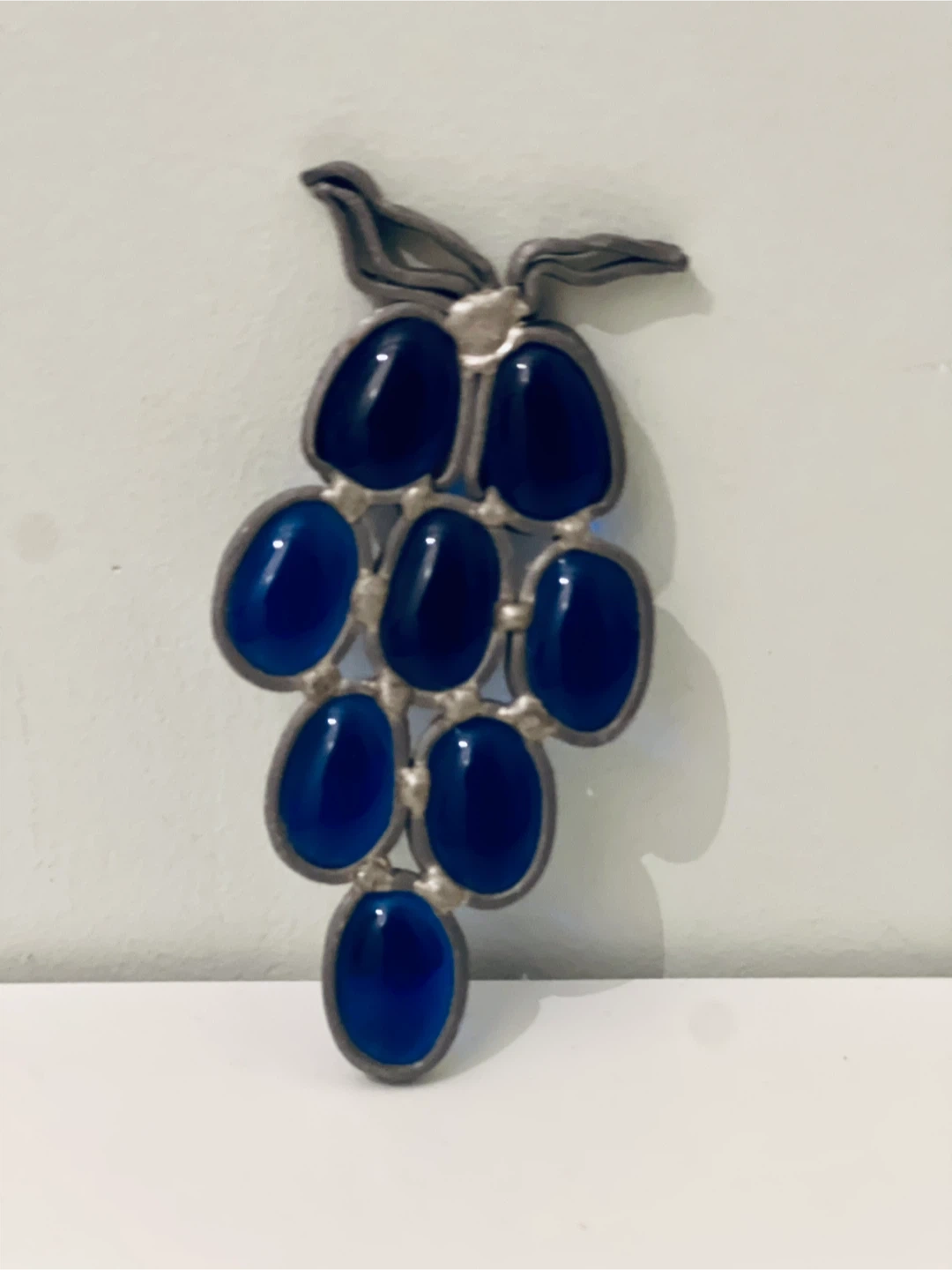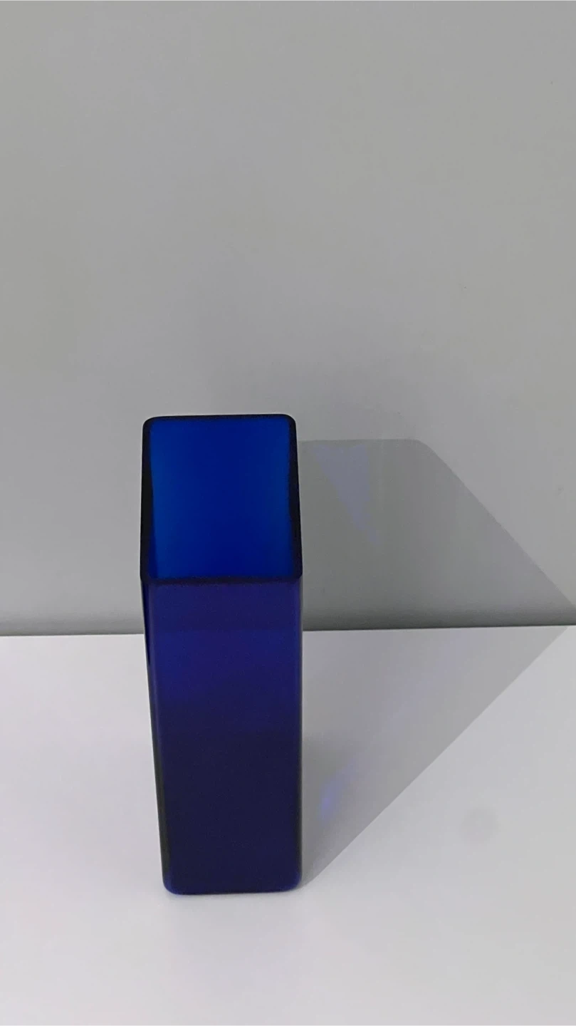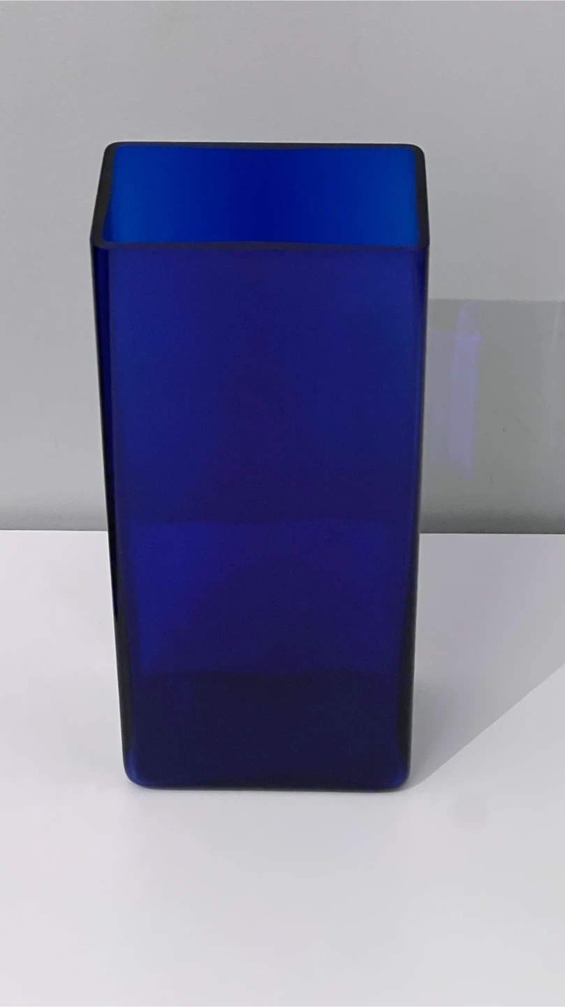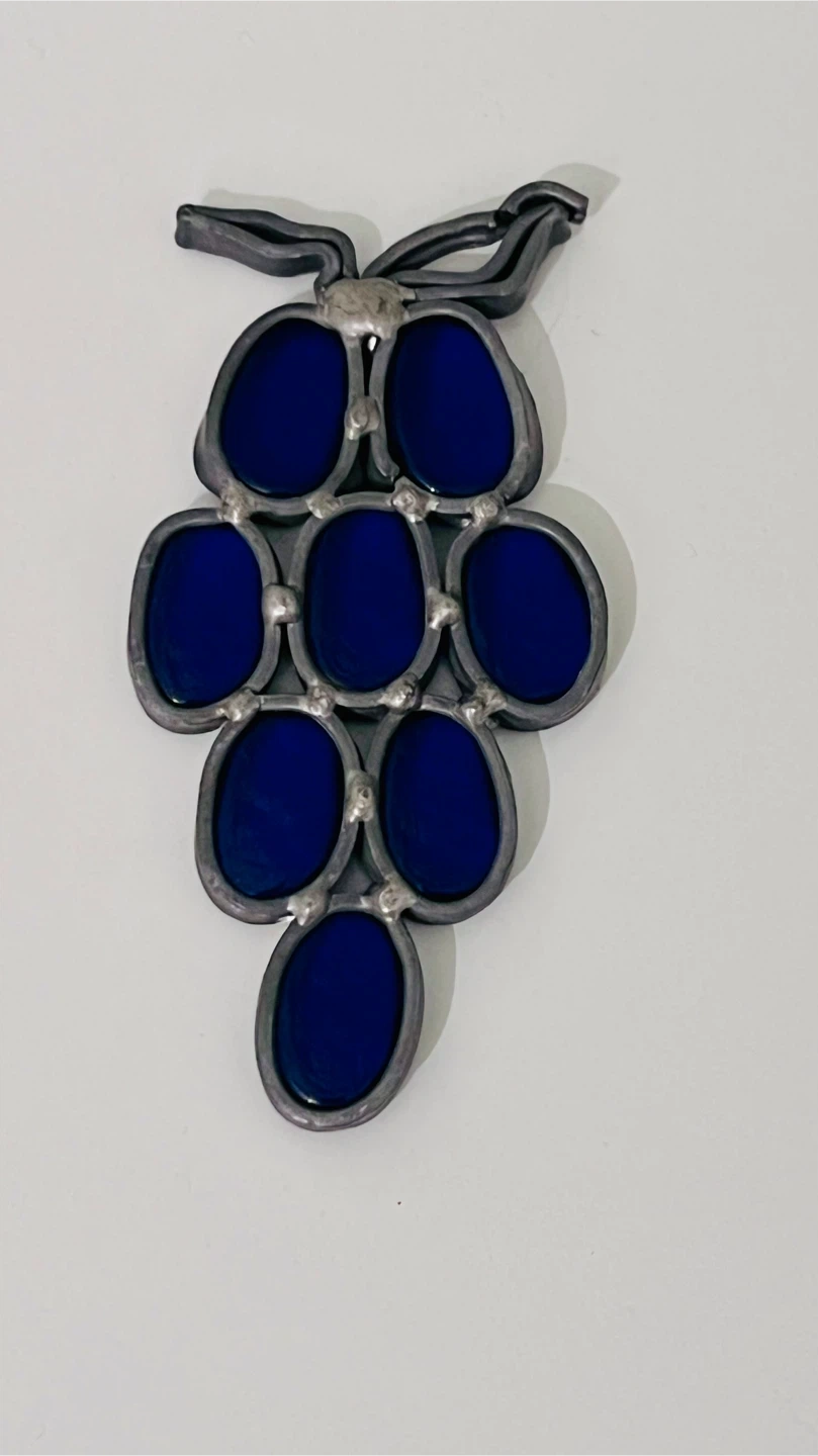 Set includes: MCM Blue glass vase; Red glass vase; Blue glass grape cluster