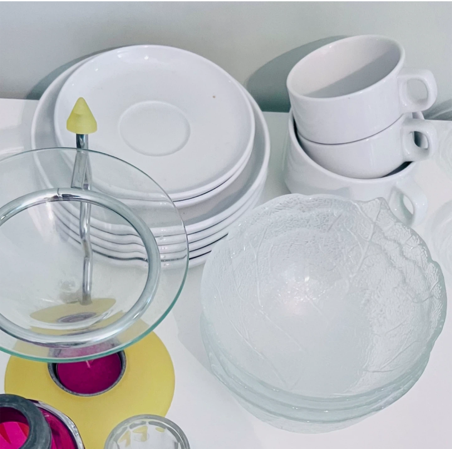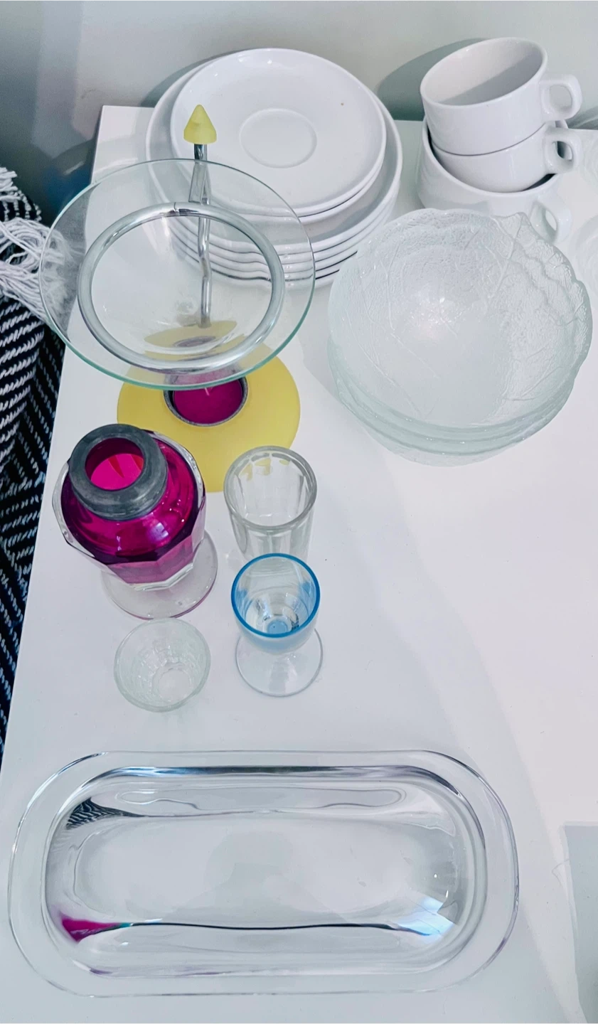 A collection of assorted glassware including small glass bowls, coffee cups, saucers, shot glasses, butter dish, candle holder, etc. There are also some unique decorative glass pieces. Perfect for adding to your collection or for everyday use!