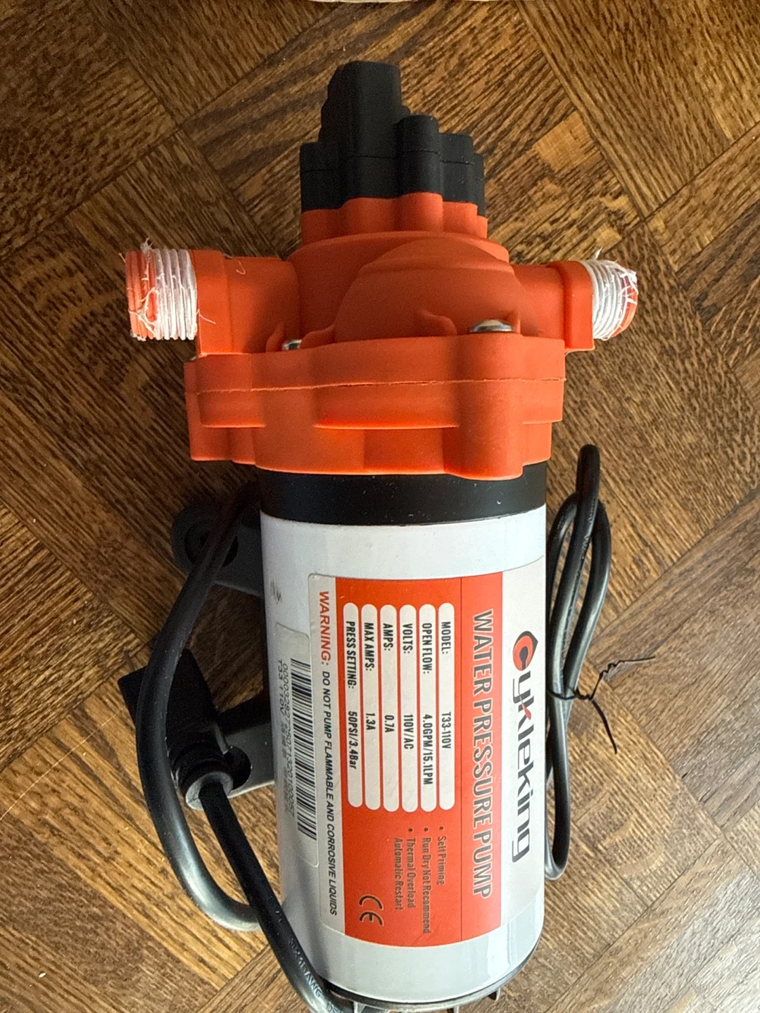 Selling a Cykleking water pressure pump, model T33-110V. It features self-priming and thermal overload protection with automatic restart. Specs include 4.0GPM open flow, 110V/AC, 0.7A, and a 50PSI pressure setting