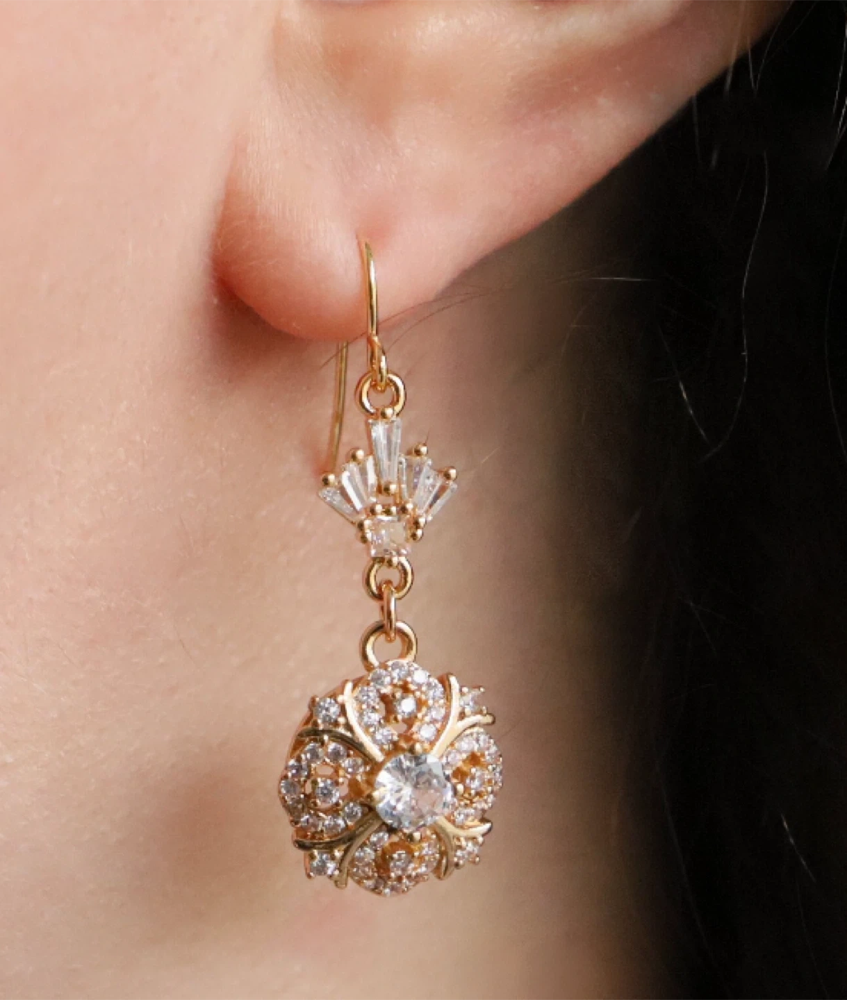 Selling a pair of lovely gold dangle earrings. They feature a floral design with clear stones. Perfect for adding a touch of vintage vibes to any outfit!