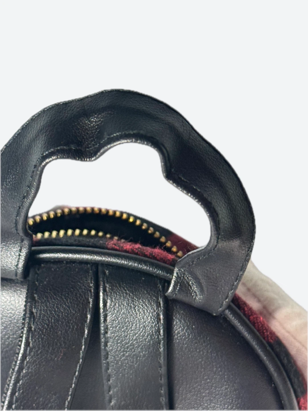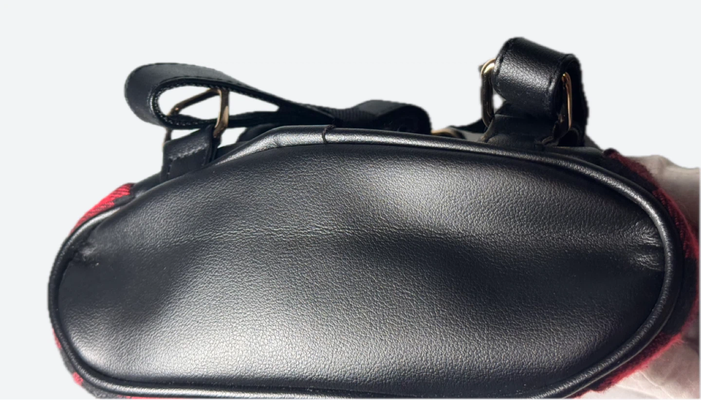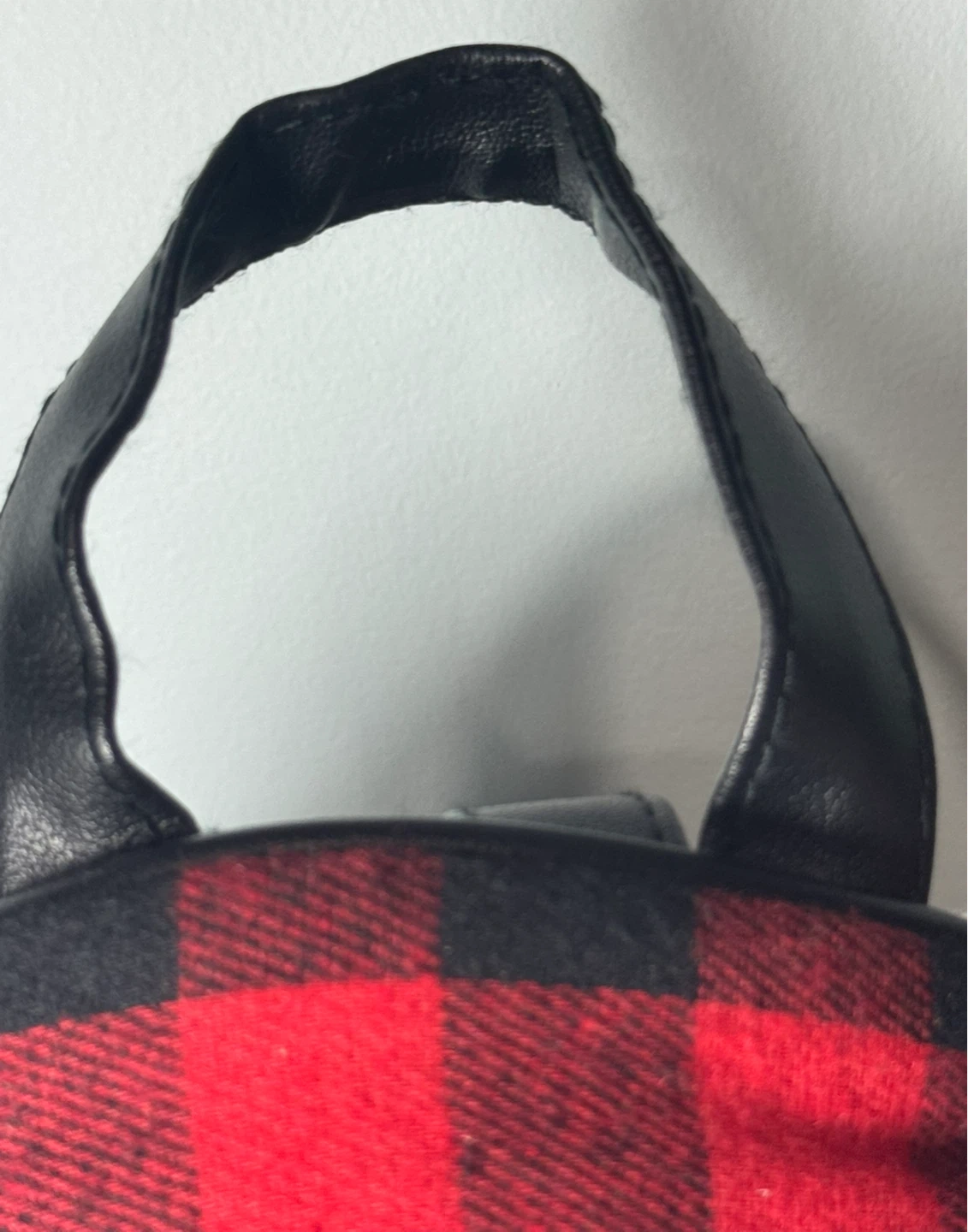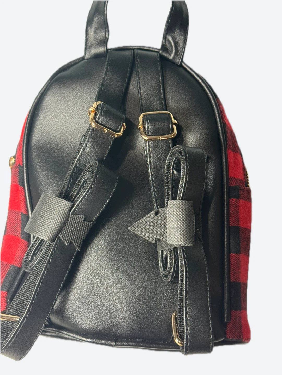 It features a red and black plaid pattern with black faux leather accents and gold zippers.