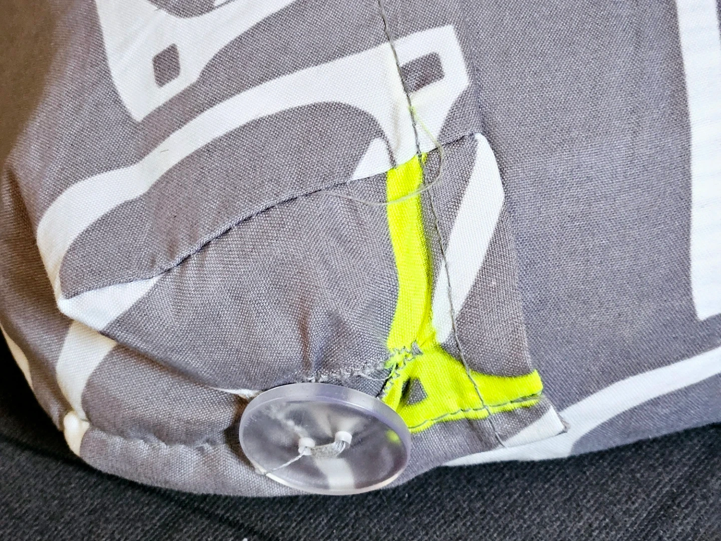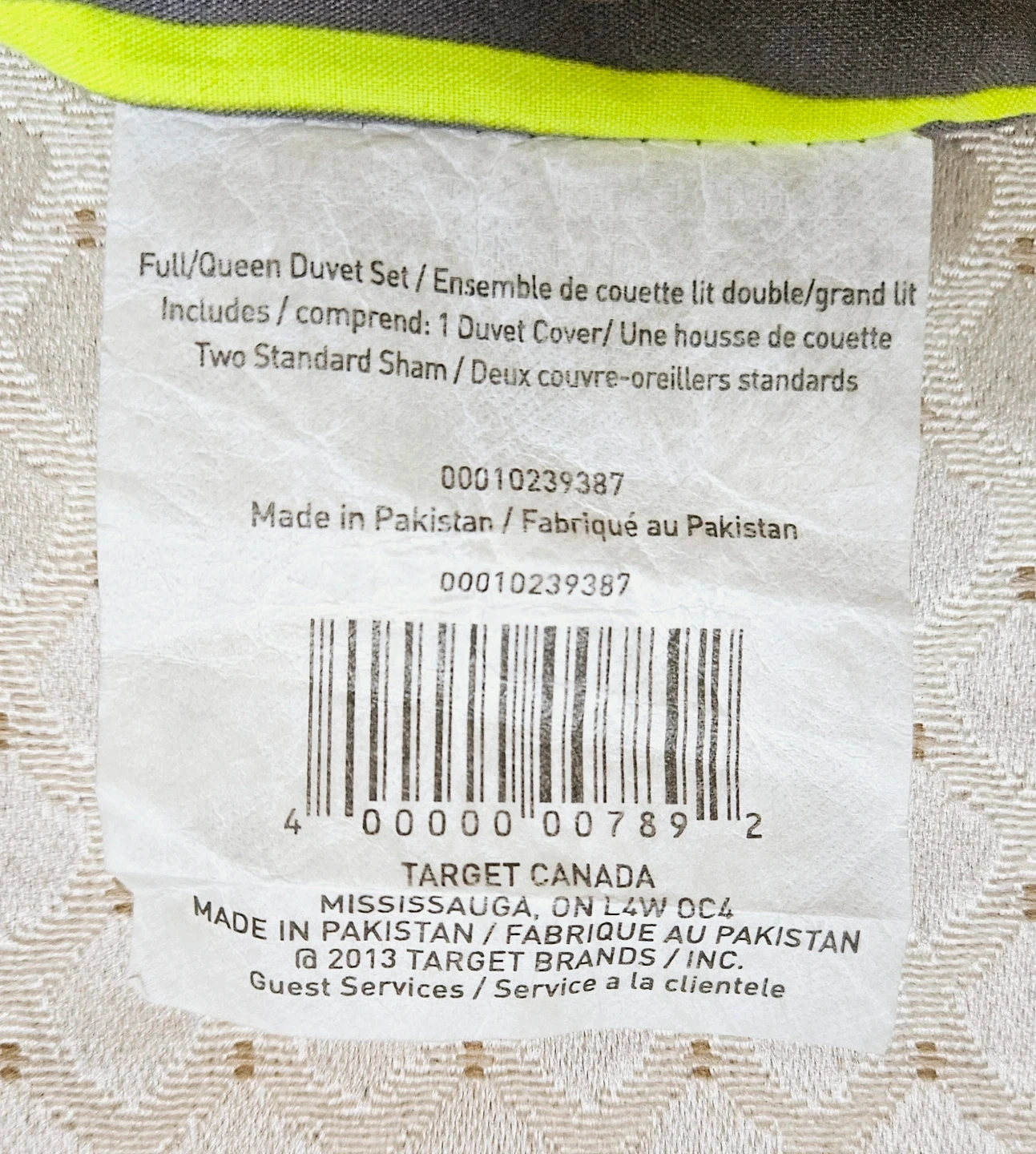 The set includes a full queen duvet cover, a pillowcase, and a pouch to organize them together. The pattern features grey and white glasses with yellow accents on a grey background.